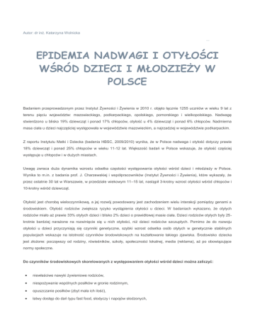 Autor: dr inż. Katarzyna Wolnicka ... EPIDEMIA NADWAGI I OTYŁOŚCI WŚRÓD DZIECI I MŁODZIEŻY W POLSCE Badaniem przeprowadzonym przez Instytut Żywności i Żywienia w 2010 r. objęto łącznie 1255 uczniów w wieku 9 lat z terenu pięciu województw: mazowieckiego, podkarpackiego, opolskiego, pomorskiego i wielkopolskiego. Nadwagę stwierdzono u blisko 19% dziewcząt i ponad 17% chłopców, otyłość u 4% dziewcząt i ponad 6% chłopców. Nadmierna masa ciała u dzieci najczęściej występowała w województwie mazowieckim, a najrzadziej w województwie podkarpackim. Z raportu Instytutu Matki i Dziecka (badania HBSC, 2009/2010) wynika, że w Polsce nadwaga i otyłość dotyczy prawie 18% dziewcząt i ponad 25% chłopców w wieku 11-12 lat. Większość badań w Polsce wskazuje, że otyłość częściej występuje u chłopców i w dużych miastach. Uwagę zwraca duża dynamika wzrostu odsetka częstości występowania otyłości wśród dzieci i młodzieży w Polsce. Wynika to m.in. z badania prof. J. Charzewskiej i współpracowników (Instytut Żywności i Żywienia), które wykazały, że przez ostatnie 30 lat w Warszawie, w przedziale wiekowym 11–15 lat, nastąpił 3-krotny wzrost otyłości wśród chłopców i 10-krotny wśród dziewcząt. Otyłość jest chorobą wieloczynnikową, a jej rozwój powodowany jest zachodzeniem wielu interakcji pomiędzy genami a środowiskiem. Otyłość rodziców zwiększa ryzyko wystąpienia otyłości u dzieci. W badaniach wykazano, że otyłych rodziców miało aż prawie 33% otyłych dzieci i blisko 2% dzieci o prawidłowej masie ciała. Dzieci rodziców otyłych były 25krotnie bardziej narażone na rozwinięcie się u nich otyłości, niż dzieci rodziców szczupłych. Pomimo że do rozwoju otyłości u dzieci przyczyniają się czynniki genetyczne, szybki wzrost odsetka osób otyłych w genetycznie stabilnych populacjach wskazuje na istotność czynników środowiskowych na kształtowanie takiego zjawiska. Środowisko dziecka jest złożone: począwszy od rodziny, rówieśników, szkoły, społeczności lokalnej, media (reklama), aż po obowiązujące normy społeczne. Do czynników środowiskowych skorelowanych z występowaniem otyłości wśród dzieci można zaliczyć: niewłaściwe nawyki żywieniowe rodziców, niespożywanie wspólnych posiłków w gronie rodzinnym, opuszczanie posiłków (zbyt mała ich ilość), łatwy dostęp do dań typu fast food, słodyczy i napojów słodzonych, zbyt niskie spożycie warzyw i owoców, niski poziom aktywności fizycznej, zbyt długi czas spędzany przed komputerem, TV – zwiększone narażenie na działanie reklamy, zbyt krótki czas snu. W szerszej perspektywie bierze się pod uwagę także takie czynniki, jak infrastruktura środowiska lokalnego (ścieżki rowerowe, boiska itp.), czy też możliwości implementowania różnych programów interwencyjnych np. w szkołach, przedszkolach.