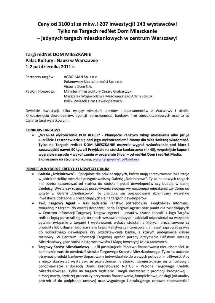 Ceny od 3100 zł za mkw.! 207 inwestycji! 143 wystawców! Tylko na Targach redNet Dom Mieszkanie – jedynych targach mieszkaniowych w centrum Warszawy! Targi redNet DOM MIESZKANIE Pałac Kultury i Nauki w Warszawie 1-2 października 2011 r. Partnerzy targów: Patroni Honorowi: AGRO-MAN Sp. z o.o. Polanowscy Nieruchomości Sp. z o.o. Victoria Dom S.A. Minister Infrastruktury Cezary Grabarczyk Marszałek Województwa Mazowieckiego Adam Struzik Polski Związek Firm Deweloperskich Dwieście inwestycji, kilka tysięcy mieszkao, domów i apartamentów z Warszawy i okolic. Kilkudziesięciu deweloperów, agencji nieruchomości, banków, firm ubezpieczeniowych oraz to co czyni te targi wyjątkowymi: KONKURS TARGOWY „WYGRAJ wykooczenie POD KLUCZ” - Planujecie Paostwo zakup mieszkania albo już je kupiliście i zastanawiacie się nad jego wykooczeniem? Mamy dla Was świetną wiadomośd. Tylko na Targach redNet DOM MIESZKANIE możecie wygrad wykooczenie pod klucz i zaoszczędzid nawet 60 tys. zł! Przyjdźcie na stoisko konkursowe (nr 43), wypełnijcie kupon i wygrajcie nagrodę – wykooczenie w programie Silver – od redNet Dom i redNet Media. Zapraszamy na stronę konkursu: www.targirednet.pl/konkurs POMOC W WYBORZE KREDYTU I NOWEGO LOKUM Galeria „Dzielnicowo” – Specjalnie dla odwiedzających, którzy mają sprecyzowane lokalizacje w jakich chcieliby mieszkad przygotowaliśmy Galerię „Dzielnicowo”. Tylko na naszych targach nie trzeba spacerowad od stoiska do stoiska i pytad deweloperów czy budują w danej dzielnicy. Wystarczy rozpocząd poszukiwania swojego wymarzonego mieszkania czy domu od wizyty w Galerii „Dzielnicowo”. Tu znajdują się pogrupowane dzielnicami wszystkie inwestycje dostępne u prezentujących się na targach deweloperów. Twój Targowy Agent – Jeśli będziecie Paostwo potrzebowali jakiejkolwiek Informacji związanej z targami do waszej dyspozycji będą Targowi Agenci oraz punkt dla zwiedzających w Centrum Informacji Targowej. Targowi Agenci – ubrani w czarne koszulki z logo Targów redNet będą poruszali się po terenach wystawienniczych i udzielali odpowiedzi na wszystkie pytania związanie z targami i wystawcami, wskażą stoiska na których prezentowane są produkty lub usługi znajdujące się w kręgu Paostwa zainteresowao, a nawet zaprowadzą was do konkretnego dewelopera czy przedstawiciela banku, z którym podejmiecie dalsze rozmowy. W Centrum Informacji Targowej oprócz porady otrzymacie Paostwo: Katalog Mieszkaniowy, plan stoisk z listą wystawców i Mapę Inwestycji Mieszkaniowych. Targowy Kredyt Mieszkaniowy – Jeśli poszukujecie Paostwo finansowania nieruchomości, to koniecznie musicie odwiedzid stoisko Targowego Kredytu Mieszkaniowego. Tylko tu możecie otrzymad produkt bankowy dopasowany indywidualnie do waszych potrzeb i możliwości. Aby z niego skorzystad wystarczy, że przyjedziecie na stoisko, zarejestrujecie się u hostessy i porozmawiacie z doradcą Domu Kredytowego NOTUS – Patrona Targowego Kredytu Mieszkaniowego. Tylko na targach będziecie mogli skorzystad z promocji kredytowej – niższej marży, szybszej procedury przyznania finansowania, kompleksowej obsługi (od analizy potrzeb aż do podpisania umowy) oraz wygodnego i atrakcyjnego cenowo doposażenia i wykooczenia zakupionej nieruchomości z możliwością uzyskania kredytu na ten cel w ramach programu „Wnętrze z Notusem”. Jeśli zatem planujecie zakup mieszkania, domu lub działki – nie przegapcie najlepszego dostępnego na rynku kredytu. Mapa Inwestycji Mieszkaniowych – Jeśli szukacie idealnego miejsca do zamieszkania? Chcecie zorientowad się jakie nowe inwestycje powstają na terenie Warszawy i jej okolic? Odwiedź stoisko Mapy Inwestycji Mieszkaniowych Nr 2N. Znajdziecie tu informacje o aktualnie realizowanych inwestycjach mieszkaniowych, szybko sprawdzicie ich lokalizacje, ceny, terminy oddania, a także zdobędziecie kontakt do dewelopera. Zapoznajcie się z ofertą ponad 150 inwestycji i wybierzcie dla siebie dom, mieszkanie, apartament lub loft. Każdy kto odwiedzi stoisko Mapy Inwestycji Mieszkaniowych będzie mógł zabrad ze sobą do domu egzemplarz mapy w wersji papierowej. Katalog Mieszkaniowy – będzie czekał na Paostwa w Centrum Informacji Targowej. Dla każdego zainteresowanego przygotowaliśmy nieodpłatnie obszerny katalog zawierający przedstawione w jednolity i przejrzysty sposób, szczegółowe (wizualizacje, opisy, ceny, rzuty lokali) prezentacje inwestycji realizowanych na terenie aglomeracji. Warsztaty i przewodnik „7 kroków do własnego M” – Każdy może wziąd udział w warsztatach, na których prawnicy, finansiści, architekci i dekoratorzy wnętrz podpowiedzą jak ustrzec się błędów i dokonad w pełni świadomych i przemyślanych decyzji na wszystkich etapach: poszukiwao, wyboru kredytu, negocjacji zakupu, podpisania umowy, odbioru lokalu, urządzania i ubezpieczenia nowego lokum. Dodatkowo w Warszawie będzie można dowiedzied się jak nasze mieszkanie może zacząd zarabiad na siebie w ramach prelekcji „Twoje mieszkanie – Twoim kapitałem”. Każdy uczestnik warsztatów otrzyma przewodnik podsumowujący treśd warsztatów. DODATKOWE ATRAKCJE Targowe Przedszkole – Wybór mieszkania to zazwyczaj decyzja rodzinna, dlatego na naszych imprezach często gościmy rodziców z dziedmi. Planując odwiedzenie targów nie musisz już zastanawiad się nad tym, co zrobid ze swoją pociechą. Pomyśleliśmy również o naszych najmłodszych gościach. Przedszkole targowe to miejsce, w którym maluchy spędzą miło czas bawiąc się, malując, biorąc udział w grach, zabawach i mini konkursach. Pozostaw dziecko pod opieką wykwalifikowanej kadry, a sam udaj się na poszukiwanie wymarzonego lokum. Kawiarenka Targowa - Chwila odpoczynku w trakcie zwiedzania targów i rozmów z wystawcami? Każdemu przyda się mały przystanek w kameralnej atmosferze z dala od targowego zgiełku. Nasza kawiarenka to miejsce na wypicie