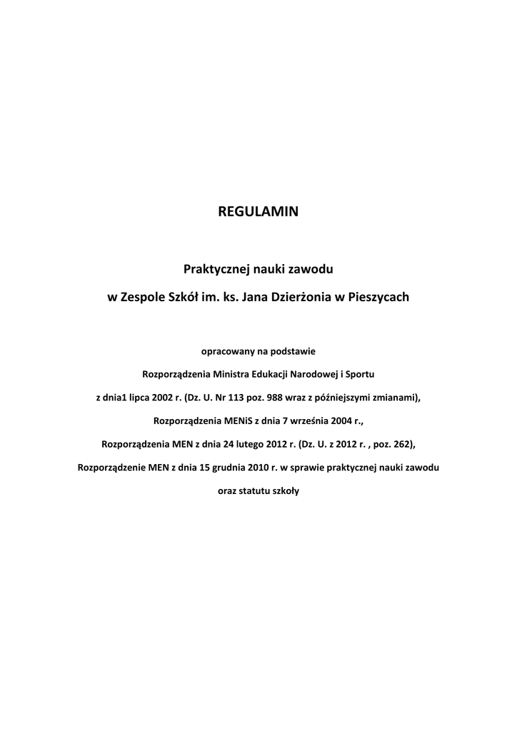 REGULAMIN Praktycznej nauki zawodu w Zespole Szkół im. ks. Jana Dzierżonia w Pieszycach opracowany na podstawie Rozporządzenia Ministra Edukacji Narodowej i Sportu z dnia1 lipca 2002 r. (Dz. U. Nr 113 poz. 988 wraz z późniejszymi zmianami), Rozporządzenia MENiS z dnia 7 września 2004 r., Rozporządzenia MEN z dnia 24 lutego 2012 r. (Dz. U. z 2012 r. , poz. 262), Rozporządzenie MEN z dnia 15 grudnia 2010 r. w sprawie praktycznej nauki zawodu oraz statutu szkoły I. Postanowienia ogólne 1. Czas i miejsce odbywania praktycznej nauki zawodu określa szkolny plan nauczania. II. Zakres obowiązków uczniów 1. Uczeń zobowiązany jest do punktualnego stawiania się na zajęciach w miejscu wyznaczonym przez instruktora praktycznej nauki zawodu, opiekuna praktyk lub kierownika szkolenia praktycznego. 2. Uczeń nie może sam zmieniać miejsca odbywania zajęć. 3. Uczeń powinien przystąpić do zajęć w odpowiednim ubraniu roboczym. 4. Uczeń ma obowiązek sumiennie wykonywać wszystkie zlecone przez instruktora praktycznej nauki zawodu, opiekuna praktyk prace, przestrzegając zasad bhp. 5. Uczeń może być zwolniony z zajęć z ważnych powodów tylko przez kierownika szkolenia praktycznego. 6. Zajęcia opuszczone z powodu choroby, potwierdzone zwolnieniem lekarskim powinny być rozliczone w formie dodatkowych zajęć. 7. Uczeń może nie być klasyfikowany z powodu nieobecności na zajęciach przekraczającej 50 % czasu przeznaczonego na te zajęcia w danym semestrze. 8. Uczeń nieklasyfikowany z powodu usprawiedliwionej nieobecności może zdawać egzamin klasyfikacyjny. 9. Dla ucznia nieklasyfikowanego z zajęć praktycznych z powodu usprawiedliwionej nieobecności, szkoła organizuje zajęcia umożliwiające uzupełnienie programu nauczania (podstawy programowej). 10. Na wniosek ucznia (prawnych opiekunów) nieklasyfikowanego z powodu nieusprawiedliwionej nieobecności rada pedagogiczna może wyrazić zgodę na egzamin klasyfikacyjny. 11. Uczniowie odpowiadają za powierzony im w czasie zajęć sprzęt. Wszelkie szkody zaistniałe z ich winy pokrywają rodzice (prawni opiekunowie). 12. W przypadku dokonanej przez ucznia kradzieży lub dewastacji mienia w miejscu odbywania zajęć będzie on ukarany zgodnie z karami przewidzianymi w statucie szkoły. 13. Uczniowie zobowiązani są pozostawić porządek po zakończonych zajęciach na stanowiskach pracy i w pomieszczeniach socjalnych. 14. Na zajęciach uczeń zobowiązany jest posiadać dzienniczek zajęć praktyczny6ch oraz inne wymagane dokumenty (aktualna książeczka zdrowia). 15. W przypadku powtarzających się uchybień w czasie zajęć stosowane będą wobec uczniów kary zgodnie ze statutem szkoły. 16. Praktyczna nauka zawodu musi odbywać się pod kierunkiem instruktorów praktycznej nauki zawodu, opiekunów praktyk zawodowych wyznaczonych przez pracodawców lub nauczycieli.