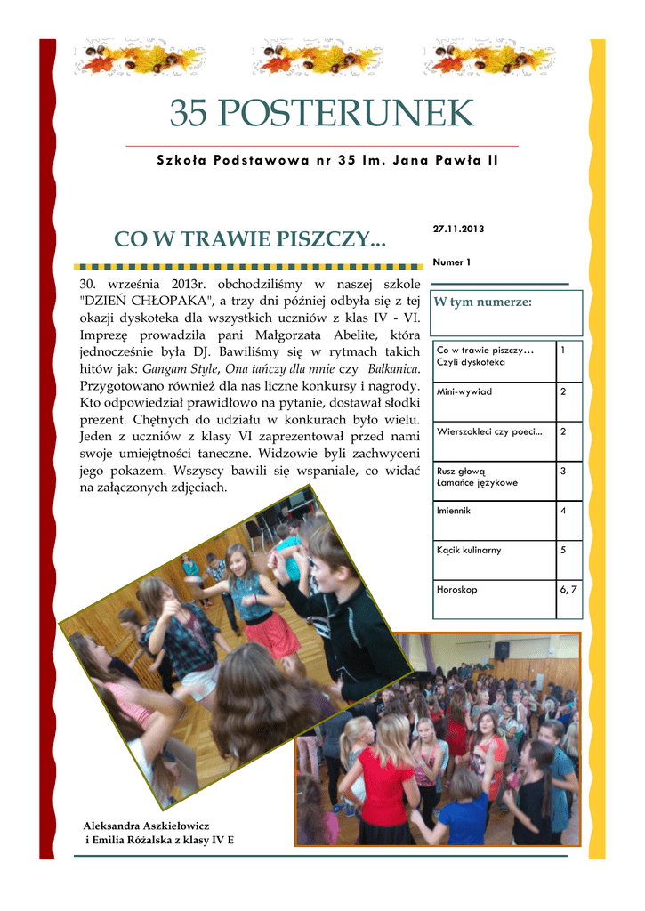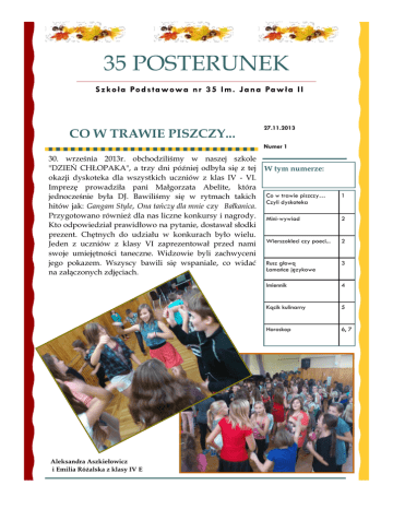 35 POSTERUNEK S z koła Pods ta wow a nr 35 Im . J a n a Pa w ła I I CO W TRAWIE PISZCZY... 27.11.2013 Numer 1 30. września 2013r. obchodziliśmy w naszej szkole "DZIEŃ CHŁOPAKA", a trzy dni później odbyła się z tej okazji dyskoteka dla wszystkich uczniów z klas IV - VI. Imprezę prowadziła pani Małgorzata Abelite, która jednocześnie była DJ. Bawiliśmy się w rytmach takich hitów jak: Gangam Style, Ona tańczy dla mnie czy Bałkanica. Przygotowano również dla nas liczne konkursy i nagrody. Kto odpowiedział prawidłowo na pytanie, dostawał słodki prezent. Chętnych do udziału w konkurach było wielu. Jeden z uczniów z klasy VI zaprezentował przed nami swoje umiejętności taneczne. Widzowie byli zachwyceni jego pokazem. Wszyscy bawili się wspaniale, co widać na załączonych zdjęciach. Aleksandra Aszkiełowicz i Emilia Różalska z klasy IV E W tym numerze: Co w trawie piszczy… Czyli dyskoteka 1 Mini-wywiad 2 Wierszokleci czy poeci... 2 Rusz głową Łamańce językowe 3 Imiennik 4 Kącik kulinarny 5 Horoskop 6, 7 MINI-WYWIAD O pasji, życiu i zainteresowaniach … wywiad z panią Małgorzatą Abelite Już w dzieciństwie marzyłam o tym, by zostać nauczycielką. Jako mała dziewczynka często bawiłam się „w szkołę”. Dziś z wielką przyjemnością uczę informatyki w Szkole Podstawo wej nr 35 i przedmiotów informatycznych na Wydziale Matematyczno – Fizycznym Uniwersytetu Szczecińskiego. Największą przyjemnością dla mnie jest to, że wciąż mogę poznawać nowych ludzi. Lubię przyczyniać się do ich szczęścia i wskazywać ciekawe ścieżki rozwoju. Praca z uczniami i studentami daje mi wielką satysfakcję. Cieszą mnie momenty, gdy moi uczniowie zajmują pierwsze miejsca w konkursach. Doceniam również i te najmniejsze sukcesy, jakimi mogą się pochwalić. Moje osiągnięcia zawodowe zawdzięczam nie tylko uczniom, ale i ich rodzicom, za co pragnę przy okazji podziękować. Wielkim szacunkiem darzę również moje koleżanki i kolegów, z którymi pracuję. To dzięki nim tak wiele mogłam i nadal mogę się nauczyć. Zachęcam wszystkich przy okazji do wzięcia udziału w akcji charytatywnej „Iskierka Rado ści”. Po mo c drug iemu czło wieko wi po winna by ć dla nas naturalna. W ubiegłym roku otrzymałam prestiżową nagrodę w województwie zachodniopomorskim - „Belfer na 6”. W bieżącym roku „Głos szczeciński” wytypował mnie na „Belfra 2013”. Możecie wspomóc moją kandydaturę poprzez wysłanie sms-a pod numer 71466 o treści: GS.SP.1 Ilość smsów jest nieograniczona. Jeśli uda się wygrać, to będzie nasz wspólny sukces! WIERSZOKLECI CZY POECI... Magiczne słowa od dawna znam Przepraszać czasem muszę siostrę, i ich znaczenie zdradzę wam. kiedy użyję słowa ostre. ,,Dziękuję” mówię zawsze mamie, Zawsze znajomym pięknie się kłaniam, mówię ,,dzień dobry" i ,,do widzenia'', bo dzięki temu ten świat się zmienia. kiedy podaje mi śniadanie. Do taty mówię ,,proszę'', gdy potrzebuję jakieś grosze. Natalia Szalewska klasa IV B Str. 2 35 POSTERUNEK RUSZ GŁOWĄ Na ogonie złota głowa, smaczne ziarnka w sobie chowa. Daleki kuzyn pszczoły też ma silny jad, lepiej go unikaj, gdy w pobliżu siadł. Na jakiej trąbie nie można zagrać? Szli 2 ojcowie i 2 synowie, a po drodze znaleźli trzy jabłka. Podzielili je między siebie każdemu po jednym się dostało - jak to się stało? Kiedy jesteś w domu bez głowy? Gdzie są rzeki suche? Ojciec Teresy miał 5 córek, cztery miały na imię: Plipli, Papla, Pluplu, Ploplo. Jak miała na imię 5 córka? ODPOWIEDZI: Dynia Szerszeń Powietrznej Szedł ojciec z synem i wnuczkiem. Kiedy wyglądasz przez okno. Na mapie. Teresa Natalia Oniszczuk klasa IV B ŁAMAŃCE JĘZYKOWE Ćwicz razem z nami… tamta ją pchła. Chrząszcz brzmi w trzcinie w Szczebrzeszynie. Siedzi Jerzy na wierzy, że włos mu się na głowie jeży od pisków nietoperzy. Stół z powyłamywanymi nogami. Szedł Sasza suchą szosą,bo gdy susza, s zosa sucha. Wlej olej, wlej. Idzie wąż wąską dróżką, nie porusza żadną nóżką. Król Karol kupił królowej Karolinie korale Grymasiło koźle: i to źle i to źle. koloru koralowego. Masz waść maść. Ząb zupa zębowa, dąb zupa dębowa. Jola lojalna, lojalna Jola. Ćma,ćmę,ćmi. Żółta żaba żarła żur. Na ulicy Żyła żyła sobie żyła, jak tej żyle pękła żyła, to ta żył już nie żyła. Pchła pchłę pchła i ta pchła była zła, że Numer 1 Martyna Kułak klasa IV E Str. 3 IMIENNIK czyli znaczenie imion Szymon Szymon jest to imię pochodzenia hebrajskiego, od słów szim on co oznacza “Bóg wysłuchał”. Osoba nosząca to imię jest tajemnicza, posiada moc przekonywania innych. Jest tak poważny, że nieraz staje się nudny, ale się tym nie przejmuje. Za to jest doskonale zorganizowany i cierpliwy. Nie ulega wpływom, potrafi być obiektywny, a także poświęcić wszystko dla sprawy, gdy zajdzie taka potrzeba. Cechuje go pewność siebie. Chciałby badać coś, czego inni nie znają. Może być doskonałym szpiegiem, człowiekiem interesu, policjantem. Jakub Jakub jest to imię pochodzenia hebrajskiego, od słowa aqeb (pięta) lub skrót aramejskiego słowa ja’aqob’el (niech Bóg ochrania). Jakub jest osobą ruchliwą, aktywną i pełną energii. Do dobrego samopoczucia potrzebuje uczestnictwa w życiu świata – musi do wszystkiego się mieszać, doradzać, wybierać, zmieniać, inaczej czuje się niepotrzebny i nieszczęśliwy. Jego słabym punktem jest duma, pragnienie imponowania i zyskiwania aprobaty. Jakub nie jest dobrym przyjacielem. Szybko mu się nudzi oglądanie tych samych twarzy, poszukuje więc co chwila nowych. Julia Julia jest to imię pochodzenia rzymskiego, a imię to stało się popularne już od czasów Juliusza Cezara. Jako żeńska forma imienia Juliusz oznacza: promienista, młoda. W Polsce występuje od XVIII wieku. Kobieta o tym imieniu jest pełna majestatu i wdz