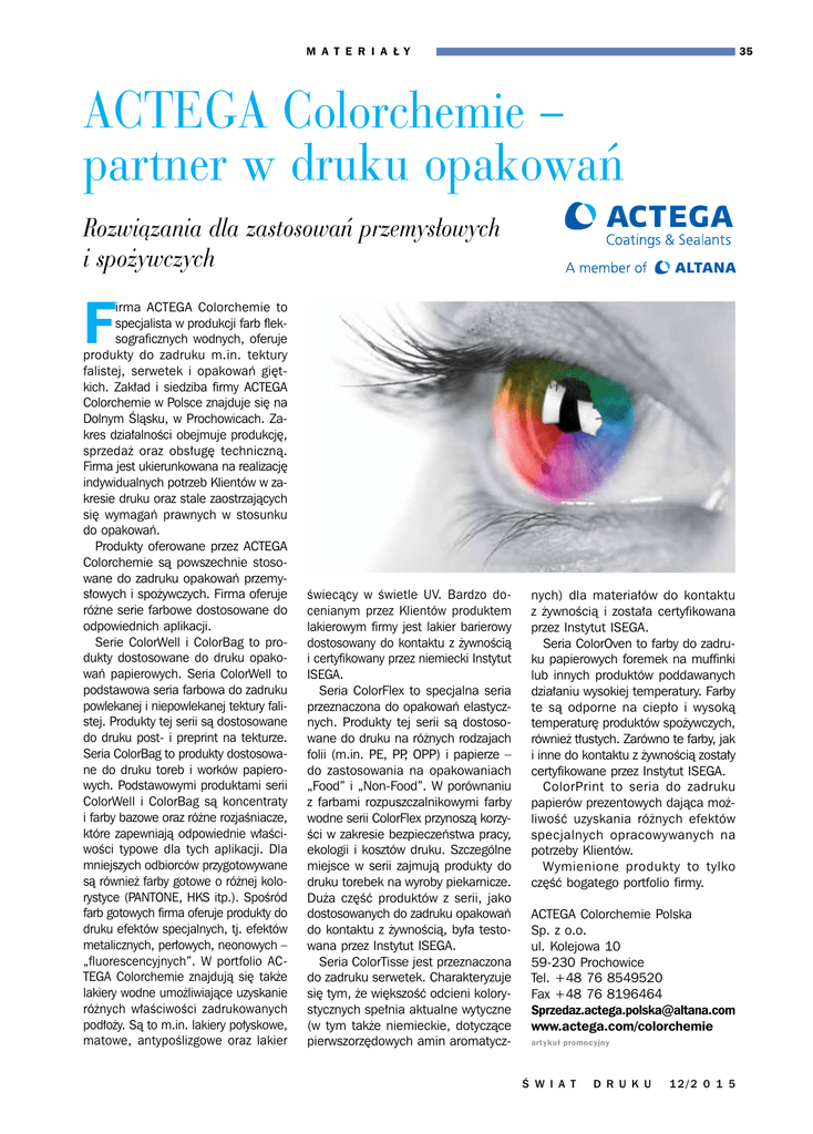 M A T E R I A Ł Y 35 ACTEGA Colorchemie – partner w druku opakowań Rozwiązania dla zastosowań przemysłowych i spożywczych F irma ACTEGA Colorchemie to specjalista w produkcji farb fleksograficznych wodnych, oferuje produkty do zadruku m.in. tektury falistej, serwetek i opakowań giętkich. Zakład i siedziba firmy ACTEGA Colorchemie w Polsce znajduje się na Dolnym Śląsku, w Prochowicach. Zakres działalności obejmuje produkcję, sprzedaż oraz obsługę techniczną. Firma jest ukierunkowana na realizację indywidualnych potrzeb Klientów w zakresie druku oraz stale zaostrzających się wymagań prawnych w stosunku do opakowań. Produkty oferowane przez ACTEGA Colorchemie są powszechnie stosowane do zadruku opakowań przemysłowych i spożywczych. Firma oferuje różne serie farbowe dostosowane do odpowiednich aplikacji. Serie ColorWell i ColorBag to produkty dostosowane do druku opakowań papierowych. Seria ColorWell to podstawowa seria farbowa do zadruku powlekanej i niepowlekanej tektury falistej. Produkty tej serii są dostosowane do druku post- i preprint na tekturze. Seria ColorBag to produkty dostosowane do druku toreb i worków papierowych. Podstawowymi produktami serii ColorWell i ColorBag są koncentraty i farby bazowe oraz różne rozjaśniacze, które zapewniają odpowiednie właściwości typowe dla tych aplikacji. Dla mniejszych odbiorców przygotowywane są również farby gotowe o różnej kolorystyce (PANTONE, HKS itp.). Spośród farb gotowych firma oferuje produkty do druku efektów specjalnych, tj. efektów metalicznych, perłowych, neonowych – „fluorescencyjnych”. W portfolio ACTEGA Colorchemie znajdują się także lakiery wodne umożliwiające uzyskanie różnych właściwości zadrukowanych podłoży. Są to m.in. lakiery połyskowe, matowe, antypoślizgowe oraz lakier świecący w świetle UV. Bardzo docenianym przez Klientów produktem lakierowym firmy jest lakier barierowy dostosowany do kontaktu z żywnością i certyfikowany przez niemiecki Instytut ISEGA. Seria ColorFlex to specjalna seria przeznaczona do opakowań elastycznych. Produkty tej serii są dostosowane do druku na różnych rodzajach folii (m.in. PE, PP, OPP) i papierze – do zastosowania na opakowaniach „Food” i „Non-Food”. W porównaniu z farbami rozpuszczalnikowymi farby wodne serii ColorFlex przynoszą korzyści w zakresie bezpieczeństwa pracy, ekologii i kosztów druku. Szczególne miejsce w serii zajmują produkty do druku torebek na wyroby piekarnicze. Duża część produktów z serii, jako dostosowanych do zadruku opakowań do kontaktu z żywnością, była testowana przez Instytut ISEGA. Seria ColorTisse jest przeznaczona do zadruku serwetek. Charakteryzuje się tym, że większość odcieni kolorystycznych spełnia aktualne wytyczne (w tym także niemieckie, dotyczące pierwszorzędowych amin aromatycz- nych) dla materiałów do kontaktu z żywnością i została certyfikowana przez Instytut ISEGA. Seria ColorOven to farby do zadruku papierowych foremek na muffinki lub innych produktów poddawanych działaniu wysokiej temperatury. Farby te są odporne na ciepło i wysoką temperaturę produktów spożywczych, również tłustych. Zarówno te farby, jak i inne do kontaktu z żywnością zostały certyfikowane przez Instytut ISEGA. ColorPrint to seria do zadruku papierów prezentowych dająca możliwość uzyskania różnych efektów specjalnych opracowywanych na potrzeby Klientów. Wymienione produkty to tylko część bogatego portfolio firmy. ACTEGA Colorchemie Polska Sp. z o.o. ul. Kolejowa 10 59-230 Prochowice Tel. +48 76 8549520 Fax +48 76 8196464 [email protected] www.actega.com/colorchemie artykuł promocyjny Ś W I A T D R U K U 12/2 0 1 5