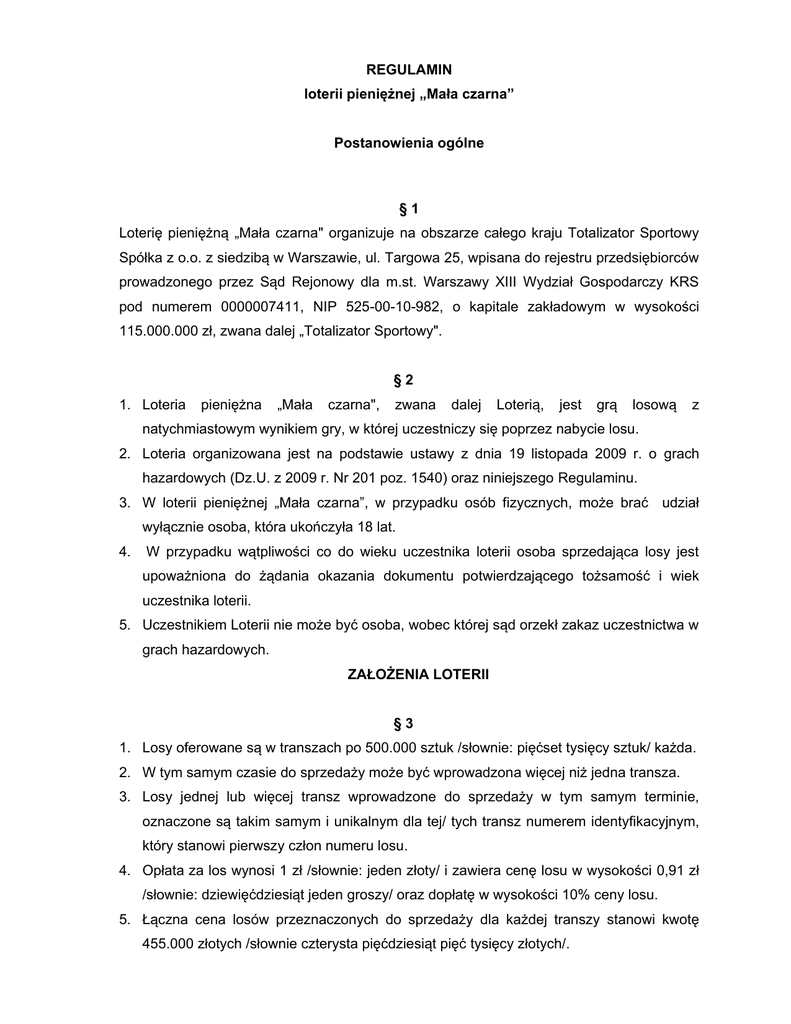 REGULAMIN loterii pieniężnej „Mała czarna” Postanowienia ogólne §1 Loterię pieniężną „Mała czarna" organizuje na obszarze całego kraju Totalizator Sportowy Spółka z o.o. z siedzibą w Warszawie, ul. Targowa 25, wpisana do rejestru przedsiębiorców prowadzonego przez Sąd Rejonowy dla m.st. Warszawy XIII Wydział Gospodarczy KRS pod numerem 0000007411, NIP 525-00-10-982, o kapitale zakładowym w wysokości 115.000.000 zł, zwana dalej „Totalizator Sportowy". §2 1. Loteria pieniężna „Mała czarna", zwana dalej Loterią, jest grą losową z natychmiastowym wynikiem gry, w której uczestniczy się poprzez nabycie losu. 2. Loteria organizowana jest na podstawie ustawy z dnia 19 listopada 2009 r. o grach hazardowych (Dz.U. z 2009 r. Nr 201 poz. 1540) oraz niniejszego Regulaminu. 3. W loterii pieniężnej „Mała czarna”, w przypadku osób fizycznych, może brać udział wyłącznie osoba, która ukończyła 18 lat. 4. W przypadku wątpliwości co do wieku uczestnika loterii osoba sprzedająca losy jest upoważniona do żądania okazania dokumentu potwierdzającego tożsamość i wiek uczestnika loterii. 5. Uczestnikiem Loterii nie może być osoba, wobec której sąd orzekł zakaz uczestnictwa w grach hazardowych. ZAŁOŻENIA LOTERII §3 1. Losy oferowane są w transzach po 500.000 sztuk /słownie: pięćset tysięcy sztuk/ każda. 2. W tym samym czasie do sprzedaży może być wprowadzona więcej niż jedna transza. 3. Losy jednej lub więcej transz wprowadzone do sprzedaży w tym samym terminie, oznaczone są takim samym i unikalnym dla tej/ tych transz numerem identyfikacyjnym, który stanowi pierwszy człon numeru losu. 4. Opłata za los wynosi 1 zł /słownie: jeden złoty/ i zawiera cenę losu w wysokości 0,91 zł /słownie: dziewięćdziesiąt jeden groszy/ oraz dopłatę w wysokości 10% ceny losu. 5. Łączna cena losów przeznaczonych do sprzedaży dla każdej transzy stanowi kwotę 455.000 złotych /słownie czterysta pięćdziesiąt pięć tysięcy złotych/. §4 1. Wysokość kapitału przeznaczonego na wygrane pieniężne wynosi dla każdej transzy 255.000 złotych /słownie dwieście pięćdziesiąt pięć tysięcy złotych/, co stanowi 56,04% łącznej ceny losów przeznaczonych do sprzedaży dla każdej transzy. 2. Ilość i wysokość wygranych dla każdej transzy w Loterii: Stopień wygranych Ilość wygranych Wartość wygranych Łączna wartość w złotych wygranych w złotych I 7 1 250 8 750 II 250 30 7 500 III 1 250 15 18 750 IV 5 625 10 56 250 V 10 625 5 53 125 VI 22 500 2 45 000 VII 65 625 1 65 625 Razem wygranych: 105.882 sztuki dla każdej transzy. ZNAMIONA LOSÓW §5 Losy Loterii wykonane są w formie prostokąta o wymiarach 5,08 cm x 10,16 cm. §6 Na pierwszej stronie losu wydrukowano: 1) nazwę losu, 2) oznaczenie opłaty za los, 3) logo loterii pieniężnych Totalizatora Sportowego, 4) instrukcje dla uczestników Loterii, 5) pole gry pokryte w całości ścieralną warstwą ochronną, 6) numer identyfikacyjny losu. §7 Na drugiej stronie losu wydrukowano: 1) tabelę wygranych, 2) informacje o organizatorze Loterii i sposobie odbioru wygranej pieniężnej, 3) kody kreskowe i numery służące do identyfikacji losu, 4) logo Totalizatora Sportowego. WARUNKI SPRZEDAŻY LOSÓW §8 1. Termin rozpoczęcia sprzedaży losów oraz ilość transz Loterii, oznaczonych takim samym i unikalnym dla tej/ tych transz numerem identyfikacyjnym, który stanowi pierwszy człon numeru losu, każdorazowo określa Totalizator Sportowy i podaje do publicznej wiadomości grających z co najmniej 3 – dniowym wyprzedzeniem. 2. Termin zakończenia sprzedaży losów Loterii, oznaczonych takim samym i unikalnym dla tej/ tych transz numerem identyfikacyjnym, który stanowi pierwszy człon numeru losu, każdorazowo określa Totalizator Sportowy i podaje do publicznej wiadomości grających z co najmniej 7 – dniowym wyprzedzeniem. §9 Totalizator Sportowy prowadzi sprzedaż losów Loterii za pośrednictwem kolektur oraz innych sieci dystrybucji. § 10 1. Przy zakupie losu uczestnik Loterii obowiązany jest sprawdzić, czy los spełnia wymogi określone w § 5 -7 niniejszego regulaminu. 2. W przypadku stwierdzenia przez uczestnika Loterii, że los nie spełnia wymogów określonych w § 5 -7 niniejszego regulaminu, nabywcy przysługuje zwrot ceny losu wraz z dopłatą w zamian za zwrócony los, w miejscu i momencie jego nabycia, pod warunkiem, że zwracany los nie nosi cech dokonanych zdrapań. § 11 Nabycie losu jest równoznaczne z przyjęciem warunków uczestnictwa w Loterii określonych niniejszym regulaminem. ZASADY LOTERII § 12 1. Los bierze udział w grze o wygrane pieniężne. 2. W celu uzyskania wyniku gry, nabywca losu usuwa ścieralną warstwę ochronną z pola gry i odczytuje znajdujące się na nim trzy symbole. Trzykrotne wystąpienie identycznych symboli oznacza uzyskanie wygranej o wysokości określonej w legendzie znajdującej się na drugiej stronie losu (rewers), gdzie określony symbol ma przypisaną kwotę wygranej w złotych. § 13 1. Realizacja wygranych dla losów z jednej lub więcej transz Loterii, oznaczonych takim samym i unikalnym dla tej/ tych transz numerem identyfikacyjnym, który stanowi pierwszy człon numeru losu, odbywa się począwszy od daty rozpoczęcia sprzedaży losów tej/ tych transz Loterii. 2. Wygrane dla losów z jednej lub więcej transz Loterii, oznaczonych takim samym i unikalnym dla tej/ tych transz numerem identyfikacyjnym, który stanowi pierwszy człon numeru losu, wypłacane są w okresie do 30 dni od daty zakończenia sprzedaży tej/ tych transz losów Loterii. § 14 1. W terminach, o których mowa w § 13, wygrane w wysokości do 30 zł /słownie: trzydziestu złotych/ włącznie, są wypłacane we wszystkich punktach sprzedaży losów Loterii. 2. W terminach, o których mowa w § 13, wygrane w wysokości do 1.250 zł /słownie: jednego tysiąca dwustu pięćdziesięciu złotych/ włącznie, są wypłacan