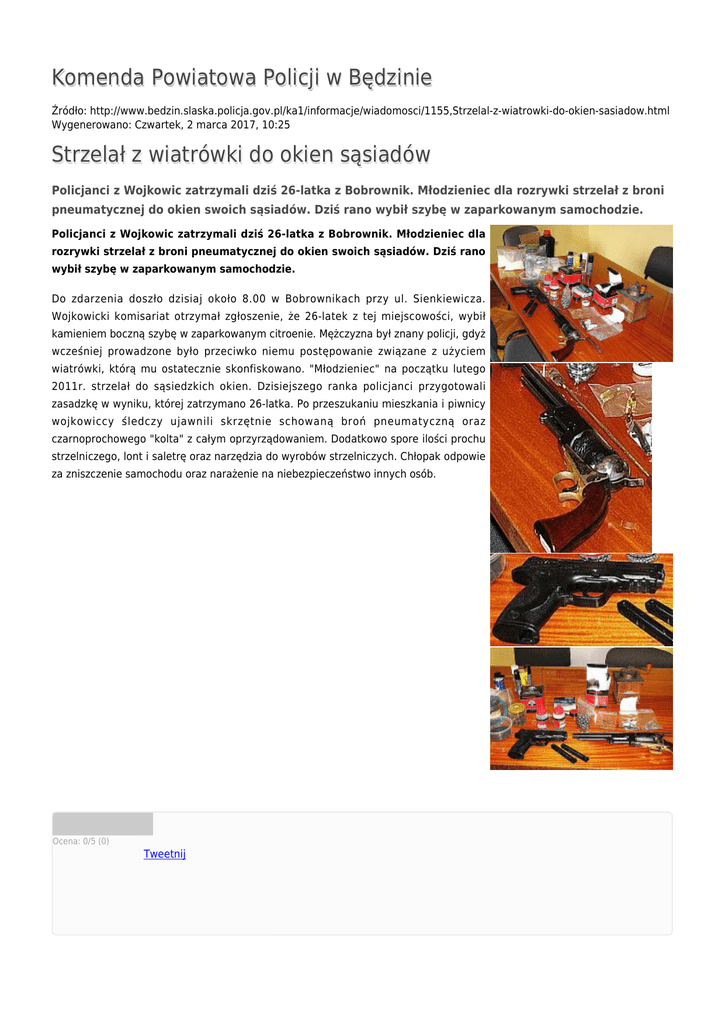 Komenda Powiatowa Policji w Będzinie Źródło: http://www.bedzin.slaska.policja.gov.pl/ka1/informacje/wiadomosci/1155,Strzelal-z-wiatrowki-do-okien-sasiadow.html Wygenerowano: Czwartek, 2 marca 2017, 10:25 Strzelał z wiatrówki do okien sąsiadów Policjanci z Wojkowic zatrzymali dziś 26-latka z Bobrownik. Młodzieniec dla rozrywki strzelał z broni pneumatycznej do okien swoich sąsiadów. Dziś rano wybił szybę w zaparkowanym samochodzie. Policjanci z Wojkowic zatrzymali dziś 26-latka z Bobrownik. Młodzieniec dla rozrywki strzelał z broni pneumatycznej do okien swoich sąsiadów. Dziś rano wybił szybę w zaparkowanym samochodzie. Do zdarzenia doszło dzisiaj około 8.00 w Bobrownikach przy ul. Sienkiewicza. Wojkowicki komisariat otrzymał zgłoszenie, że 26-latek z tej miejscowości, wybił kamieniem boczną szybę w zaparkowanym citroenie. Mężczyzna był znany policji, gdyż wcześniej prowadzone było przeciwko niemu postępowanie związane z użyciem wiatrówki, którą mu ostatecznie skonfiskowano. "Młodzieniec" na początku lutego 2011r. strzelał do sąsiedzkich okien. Dzisiejszego ranka policjanci przygotowali zasadzkę w wyniku, której zatrzymano 26-latka. Po przeszukaniu mieszkania i piwnicy wojkowiccy śledczy ujawnili skrzętnie schowaną broń pneumatyczną oraz czarnoprochowego "kolta" z całym oprzyrządowaniem. Dodatkowo spore ilości prochu strzelniczego, lont i saletrę oraz narzędzia do wyrobów strzelniczych. Chłopak odpowie za zniszczenie samochodu oraz narażenie na niebezpieczeństwo innych osób. Ocena: 0/5 (0) Tweetnij