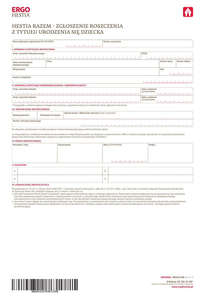 HESTIA RAZEM - ZGŁOSZENIE ROSZCZENIA Z TYTUŁU URODZENIA SIĘ DZIECKA Data wpłynięcia zgłoszenia (DD:MM:RRRR) Numer roszczenia I. INFORMACJE DOTYCZĄCE UBEZPIECZENIA Imię i nazwisko Ubezpieczonego PESEL Ulica Adres zamieszkania Ubezpieczonego Numer domu Miejscowość Kod Numer lokalu - Numer certyfikatu II. INFORMACJE DOTYCZĄCE URODZONEGO DZIECKA / URODZONYCH DZIECI* Imię i nazwisko dziecka Data urodzenia (DD:MM:RRRR) Imię i nazwisko dziecka Data urodzenia (DD:MM:RRRR) * W przypadku urodzenia więcej niż dwojga dzieci prosimy o wypełnienie danych na oddzielnym druku zgłoszenia roszczenia. III. OŚWIADCZENIE UBEZPIECZONEGO Rodzaj płatności Przelewem do banku Nazwa banku / Właściciel rachunku (imię i nazwisko) Numer rachunku bankowego W załączeniu przedstawiam wszelką dostępną mi dokumentację dotyczącą urodzenia dziecka / dzieci. Ja niżej podpisany, świadomy konsekwencji wprowadzenia w błąd Ubezpieczyciela, wynikających z postanowień art. 286 § 1 Kodeksu karnego oświadczam, iż wszystkie przedstawione przeze mnie informacje i dokumenty związane ze zgłoszeniem roszczenia są prawdziwe i kompletne. IV. PODPIS UBEZPIECZONEGO Nazwisko i imię Miejscowość Data (DD:MM:RRRR) Podpis V. ZAŁĄCZNIKI 1. 2. 3. 4. VI. OŚWIADCZENIE UBEZPIECZYCIELA Na podstawie art. 24 ust. 1 ustawy z dnia 29.08.1997 r. o ochronie danych osobowych (t. jedn. Dz. U. Nr 101 z 2002 r., poz. 926 z późn. zmianami), Sopockie Towarzystwo Ubezpieczeń na Życie Ergo Hestia SA z siedzibą w Sopocie, przy ul. Hestii 1, informuje, że: 1. jest administratorem Pana/i danych osobowych, obejmujących dane osobowe ujęte w niniejszym dokumencie. Pana/i dane osobowe będą przez nas przetwarzane w celu wykonania czynności ubezpieczeniowych, związanych z rozpatrywaniem roszczenia, w sytuacji kiedy został/a Pan/i wskazany/a jako Uprawniony/a do świadczenia ubezpieczeniowego oraz ewentualnie innych prawnie usprawiedliwionych celach, w tym dla potrzeb marketingu bezpośredniego naszych własnych produktów (usług), 2. służy Panu/i prawo wglądu do swoich danych osobowych oraz ich poprawiania, a przetwarzanie tych danych w celach innych, niż wymienione powyżej cele prawnie usprawiedliwione lub statutowe Sopockie Towarzystwo Ubezpieczeń na Życie Ergo Hestia SA z siedzibą w Sopocie albo osób trzecich, którym przekazywane są te dane - wymaga uzyskania Pana/i uprzedniej zgody. ORYGINAŁ ZR018/1208 str. 1 / 1 Infolinia 58 785 87 88* *opłata za połączenie zgodnie z cennikiem operatora www.ergohestia.pl