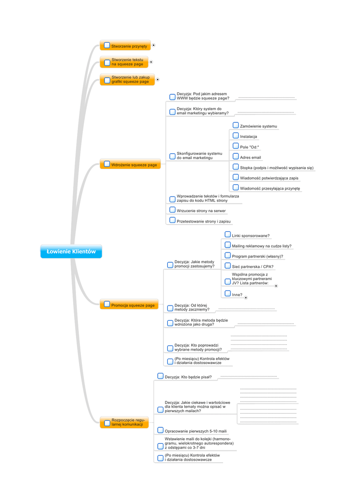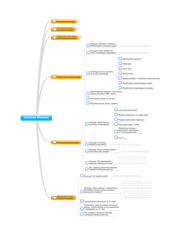 Stworzenie przyn!ty Stworzenie tekstu na squeeze page Stworzenie lub zakup grafiki squeeze page Decyzja: Pod jakim adresem WWW b!dzie squeeze page? ................................................. Decyzja: Który system do email marketingu wybieramy? ................................................. Zamówienie systemu Instalacja Pole "Od:" Skonfigurowanie systemu do email marketingu Adres email Wdro"enie squeeze page Stopka (podpis i mo"liwo#$ wypisania si!) Wiadomo#$ potwierdzaj%ca zapis Wiadomo#$ przesy&aj%ca przyn!t! Wprowadzenie tekstów i formularza zapisu do kodu HTML strony Wrzucenie strony na serwer Przetestowanie strony i zapisu Linki sponsorowane? Mailing reklamowy na cudze listy? !owienie Klientów Program partnerski (w&asny)? Decyzja: Jakie metody promocji zastosujemy? Sie$ partnerska / CPA? Wspólna promocja z kluczowymi partnerami JV? Lista partnerów: Inne? Promocja squeeze page Decyzja: Od której metody zaczniemy? ................................................. Decyzja: Która metoda b!dzie wdro"ona jako druga? Decyzja: Kto poprowadzi wybrane metody promocji? ................................................. ................................................. ................................................. ................................................. ................................................. (Po miesi%cu) Kontrola efektów i dzia&ania dostosowawcze Decyzja: Kto b!dzie pisa&? ................................................. Decyzja: Jakie ciekawe i warto#ciowe dla klienta tematy mo"na opisa$ w pierwszych mailach? Rozpocz!cie regularnej komunikacji Opracowanie pierwszych 5-10 maili Wstawienie maili do kolejki (harmonogramu, wielokrotnego autorespondera) z odst!pami co 3-7 dni (Po miesi%cu) Kontrola efektów i dzia&ania dostosowawcze ................................................. ................................................. ................................................. ................................................. ................................................. ................................................. ................................................. .................................................