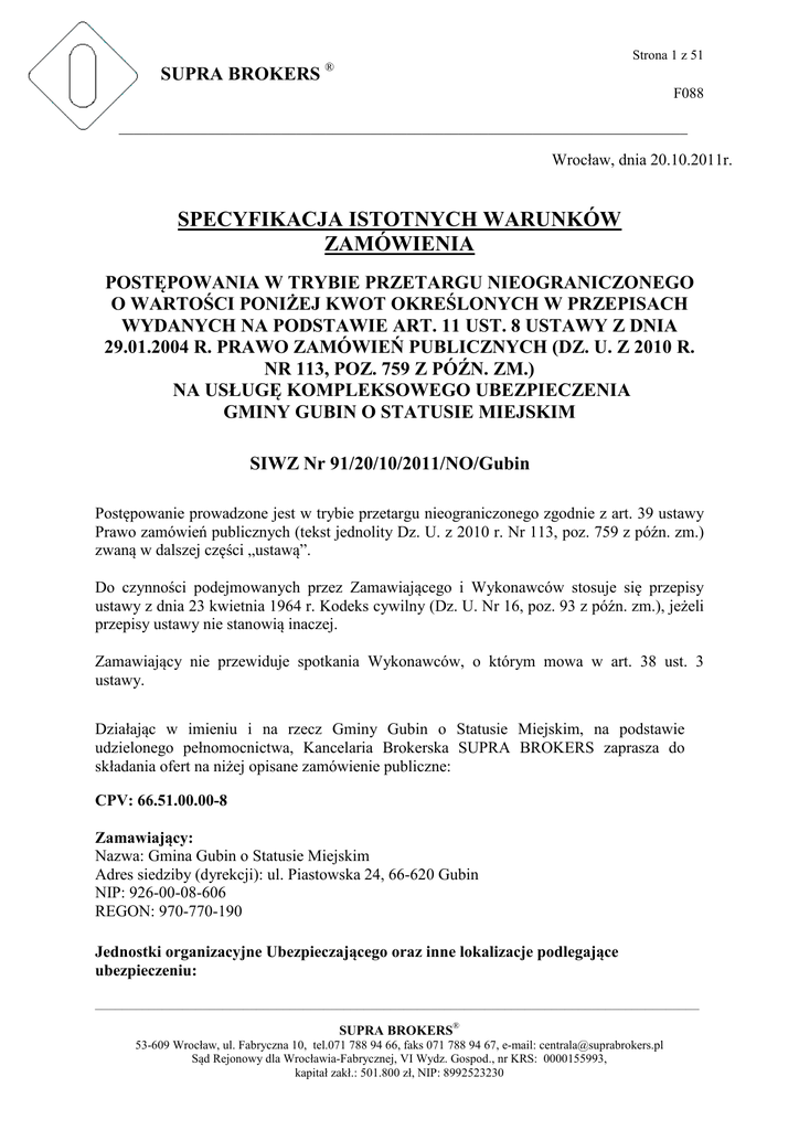Strona 1 z 51 SUPRA BROKERS ® F088 _____________________________________________________________________________ Wrocław, dnia 20.10.2011r. SPECYFIKACJA ISTOTNYCH WARUNKÓW ZAMÓWIENIA POSTĘPOWANIA W TRYBIE PRZETARGU NIEOGRANICZONEGO O WARTOŚCI PONIŻEJ KWOT OKREŚLONYCH W PRZEPISACH WYDANYCH NA PODSTAWIE ART. 11 UST. 8 USTAWY Z DNIA 29.01.2004 R. PRAWO ZAMÓWIEŃ PUBLICZNYCH (DZ. U. Z 2010 R. NR 113, POZ. 759 Z PÓŹN. ZM.) NA USŁUGĘ KOMPLEKSOWEGO UBEZPIECZENIA GMINY GUBIN O STATUSIE MIEJSKIM SIWZ Nr 91/20/10/2011/NO/Gubin Postępowanie prowadzone jest w trybie przetargu nieograniczonego zgodnie z art. 39 ustawy Prawo zamówień publicznych (tekst jednolity Dz. U. z 2010 r. Nr 113, poz. 759 z późn. zm.) zwaną w dalszej części „ustawą”. Do czynności podejmowanych przez Zamawiającego i Wykonawców stosuje się przepisy ustawy z dnia 23 kwietnia 1964 r. Kodeks cywilny (Dz. U. Nr 16, poz. 93 z późn. zm.), jeżeli przepisy ustawy nie stanowią inaczej. Zamawiający nie przewiduje spotkania Wykonawców, o którym mowa w art. 38 ust. 3 ustawy. Działając w imieniu i na rzecz Gminy Gubin o Statusie Miejskim, na podstawie udzielonego pełnomocnictwa, Kancelaria Brokerska SUPRA BROKERS zaprasza do składania ofert na niżej opisane zamówienie publiczne: CPV: 66.51.00.00-8 Zamawiający: Nazwa: Gmina Gubin o Statusie Miejskim Adres siedziby (dyrekcji): ul. Piastowska 24, 66-620 Gubin NIP: 926-00-08-606 REGON: 970-770-190 Jednostki organizacyjne Ubezpieczającego oraz inne lokalizacje podlegające ubezpieczeniu: __________________________________________________________________________________________ SUPRA BROKERS® 53-609 Wrocław, ul. Fabryczna 10, tel.071 788 94 66, faks 071 788 94 67, e-mail: [email protected] Sąd Rejonowy dla Wrocławia-Fabrycznej, VI Wydz. Gospod., nr KRS: 0000155993, kapitał zakł.: 501.800 zł, NIP: 8992523230 Strona 2 z 51 SUPRA BROKERS ® F088 _____________________________________________________________________________ 1. Gmina Gubin o Statusie Miejskim, ul Piastowska 24, 66-620 Gubin 2. Zespół Szkół im. Mikołaja Kopernika Gimnazjum nr 1 z Oddziałami Integracyjnymi, ul. Racławicka 2, 66-620 Gubin 3. Zespół Szkół w Gubinie Szkoła Podstawowa nr 1, ul. Racławicka 2, 66-620 Gubin 4. Szkoła Podstawowa nr 2, ul. Świerczewskiego 1, 66-620 Gubin 5. Szkoła Podstawowa nr 3 z Oddziałami Integracyjnymi , ul. Kresowa 48, 66-620 Gubin 6. Zespół Szkół Ogólnokształcących, ul. Piastowska 26, 66-620 Gubin 7. Przedszkole Miejskie nr 1, ul. Piastowska 20, 66-620 Gubin 8. Przedszkole Miejskie nr 2, ul. Kunickiego 8A, 66-620 Gubin 9. Przedszkole Miejskie nr 3, ul. Wojska Polskiego 16, 66-620 Gubin 10. Miejski Zakład Usług Komunalnych, ul. Piastowska 2, 66-620 Gubin 11. Gubiński Dom Kultury, ul. Westerplatte 14, 66-620 Gubin 12. Miejska Biblioteka Publiczna, ul. Westerplatte 14, 66-620 Gubin 13. Miejski Ośrodek Sportu, ul. II Armii Wojska Polskiego 5, 66-620 Gubin 14. Miejski Ośrodek Pomocy Społecznej, ul. Gdańska 17, 66-620 Gubin 15. Warsztaty Terapii Zajęciowej, ul. Gdańska 17, 66-620 Gubin oraz parki, skwery, place zabaw będące w zarządzaniu w/w jednostek, a także wszystkie lokalizacje wymienione w załączniku nr 5 do SIWZ I. OPIS PRZEDMIOTU ZAMÓWIENIA Zamówienie zostało podzielone na następujące części (pakiety). Zamawiający dopuszcza możliwość złożenia oferty wyłącznie na jeden pakiet lub na oba pakiety. PAKIET I: Ubezpieczenia wspólne dla wszystkich jednostek wymienionych w SIWZ 1. Ubezpieczenie odpowiedzialności cywilnej z tytułu prowadzonej działalności i posiadanego mienia 2. Ubezpieczenie szyb i przedmiotów szklanych od stłuczenia 3. Ubezpieczenie mienia od kradzieży z włamaniem i rabunku oraz ryzyka dewastacji Ubezpieczenia dla poszczególnych jednostek wymienionych w SIWZ 1. 2. 3. 4. 5. 6. 7. Ubezpieczenie odpowiedzialności cywilnej z tytułu administrowania drogami Ubezpieczenie mienia od ognia i innych żywiołów Ubezpieczenie sprzętu elektronicznego w systemie Wszystkich Ryzyk Ubezpieczenie odpowiedzialności cywilnej zarządcy nieruchomości Ubezpieczenie następstw nieszczęśliwych wypadków członków Straży Miejskiej Ubezpieczenie odpowiedzialności cywilnej nauczycieli Ubezpieczenie następstw nieszczęśliwych wypadków dzieci PAKIET II: __________________________________________________________________________________________ SUPRA BROKERS® 53-609 Wrocław, ul. Fabryczna 10, tel.071 788 94 66, faks 071 788 94 67, e-mail: [email protected] Sąd Rejonowy dla Wrocławia-Fabrycznej, VI Wydz. Gospod., nr KRS: 0000155993, kapitał zakł.: 501.800 zł, NIP: 8992523230 Strona 3 z 51 SUPRA BROKERS ® F088 _____________________________________________________________________________ 1. Ubezpieczenia komunikacyjne (OC, AC, NW, Assistance, Ubezpieczenie szyb) II. SZCZEGÓŁOWE WARUNKI ZAMÓWIENIA PAKIET I: UBEZPIECZENIA WSPÓLNE DLA WSZYSTKICH JEDNOSTEK WYMIENIONYCH W SIWZ W przypadku ustalenia płatności składki przez poszczególne jednostki osobno – brak opłaty części składki przez któregokolwiek z płatników nie wstrzymuje ochrony ubezpieczeniowej w stosunku do pozostałych płatników, którzy opłacili składkę (dotyczy ubezpieczeń odpowiedzialności cywilnej z tytułu prowadzonej działalności i posiadanego mienia, kradzieży z włamaniem i rabunku oraz szyb i przedmiotów szklanych od stłuczenia). 1. UBEZPIECZENIE ODPOWIEDZIALNOŚCI CYWILNEJ Dotyczy wszystkich jednostek wymienionych na str. 2 SIWZ oraz każdej lokalizacji, w której te jednostki prowadzą działalność. Suma gwarancyjna na jedno i wszystkie zdarzenia: 500 00 zł Podana suma gwarancyjna dotyczy każdej jednostki i stanowi górną granicę odpowiedzialności Ubezpieczyciela dla każdej jednostki z osobna ujętej w SIWZ. Przedmiot i zakres ubezpieczenia Odpowiedzialność cywilna deliktowa za szkody powstałe w związku z prowadzoną działalnością i posiadanym mieniem ruchomym i nieruchomym. Odpowiedzialn