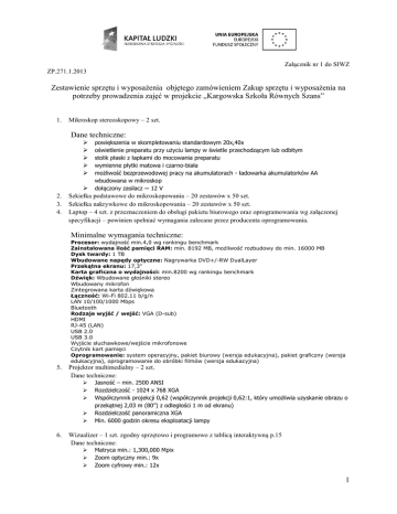 Załącznik nr 1 do SIWZ ZP.271.1.2013 Zestawienie sprzętu i wyposażenia objętego zamówieniem Zakup sprzętu i wyposażenia na potrzeby prowadzenia zajęć w projekcie „Kargowska Szkoła Równych Szans” 1. Mikroskop stereoskopowy – 2 szt. Dane techniczne: 2. 3. 4. powiększenia w skompletowaniu standardowym 20x,40x oświetlenie preparatu przy użyciu lampy w świetle przechodzącym lub odbitym stolik płaski z łapkami do mocowania preparatu wymienne płytki matowa i czarno-biała możliwość bezprzewodowej pracy na akumulatorach - ładowarka akumulatorków AA wbudowana w mikroskop dołączony zasilacz ~ 12 V Szkiełka podstawowe do mikroskopowania – 20 zestawów x 50 szt. Szkiełka nakrywkowe do mikroskopowania – 20 zestawów x 50 szt. Laptop – 4 szt. z przeznaczeniem do obsługi pakietu biurowego oraz oprogramowania wg załączonej specyfikacji – powinien spełniać wymagania zalecane przez producenta oprogramowania. Minimalne wymagania techniczne: Procesor: wydajność min.4,0 wg rankingu benchmark Zainstalowana ilość pamięci RAM: min. 8192 MB, możliwość rozbudowy do min. 16000 MB Dysk twardy: 1 TB Wbudowane napędy optyczne: Nagrywarka DVD+/-RW DualLayer Przekątna ekranu: 17,3" Karta graficzna o wydajności: min.8200 wg rankingu benchmark Dźwięk: Wbudowane głośniki stereo Wbudowany mikrofon Zintegrowana karta dźwiękowa Łączność: Wi-Fi 802.11 b/g/n LAN 10/100/1000 Mbps Bluetooth Rodzaje wyjść / wejść: VGA (D-sub) HDMI RJ-45 (LAN) USB 2.0 USB 3.0 Wyjście słuchawkowe/wejście mikrofonowe Czytnik kart pamięci Oprogramowanie: system operacyjny, pakiet biurowy (wersja edukacyjna), pakiet graficzny (wersja edukacyjna), oprogramowanie do obróbki filmów (wersja edukacyjna) 5. Projektor multimedialny – 2 szt. Dane techniczne: 6. Jasność – min. 2500 ANSI Rozdzielczość - 1024 x 768 XGA Współczynnik projekcji 0,62 (współczynnik projekcji 0,62:1, który umożliwia uzyskanie obrazu o przekątnej 2,03 m (80”) z odległości 1 m od ekranu) Rozdzielczość panoramiczna XGA Min. 6000 godzin okresu eksploatacji lampy Wizualizer – 1 szt. zgodny sprzętowo i programowo z tablicą interaktywną p.15 Dane techniczne: Matryca min.: 1,300,000 Mpix Zoom optyczny min.: 9x Zoom cyfrowy min.: 12x 1 7. 8. 9. 10. 11. Rozdzielczość: SXGA (1280x1024) Powierzchnia wyświetlania: ≥13.5″×10.6″ Komputerowy interface do ćwiczeń z inżynierii genetycznej – 1 szt. Waga laboratoryjna szkolna z zestawem odważników – 1 szt. Konduktometr z zestawem elektrod – 1 szt. Oprogramowanie Autocad (wersja edukacyjna) – 2 szt. Mikser konsola (element zestawu nagłaśniającego) – 1 szt. Dane techniczne: 12 kanałów z 60mm tłumikami 6x wejście mikrofonowe z 48V zasilaniem Wewnętrzny 24-bitowy procesor Fx z 16 2x wejście stereo 7 pasmowy korektor 3-band EQ Zasilacz wewnętrzny Interface audio USB 12. Kolumna głośnikowa aktywna (element zestawu nagłaśniającego) – 2 szt. Dane techniczne: Moc 1000W Głośniki 15” + 1” 2 wejścia MIC/Line Odtwarzacz MP3 z portem USB 2 pasmowy korektor Wyjścia LINE Gniazdo montażowe 35mm (na statyw) Zakres częstotliwości 45Hz – 20kHz 13. Mikrofony (element zestawu nagłaśniającego) – 2 szt. Dane techniczne: Dynamiczne, kardioidalne, z wbudowanymi nadajnikami Odbiorniki z podwójnym systemem antenowym eliminującym zakłócenia falowe Zasilanie mikrofonów bateriami AA 14. Mikrofony (element zestawu nagłaśniającego) – 1 szt. Dane techniczne: Osługiwane nośniki: CD-Audio/CD-MP3/USB/SD Obsługiwane formaty: Audio CD/MP3 Podświetlany niebieski wyświetlacz LCD Porty: 2x CD, 2x USB, 2x czytnik kart SD, 1x kanał LINE W pełni programowalna pętle z funkcją RELOOP 3 tryby pokrętła JOG: Pitch Bend/Scratch/Szukaj Funkcja SCRATCH i DSP Kontrola Pitch Natychmiastowy start CUE z podglądem Zasilanie: 230V AC, 60Hz Obudowa umożliwiająca zamocowanie sprzętu w systemie Rack 15. Tablica interaktywna z oprogramowaniem – 2 szt. Specyfikacja tablicy interaktywnej : Parametry sprzętowe: Technologia odczytu położenia pisaka: elektromagnetyczna pasywna (bez emisji pola elektromagnetycznego przez powierzchnię tablicy) Powierzchnia tablicy : twarda, przeznaczona do projekcji i rysowania pisakami suchościeralnymi. 2 Rozdzielczość sprzętowa: rozdzielczość wewnętrzna: 4096 punktów (linii) na cal rozdzielczość wyjściowa: 1000 linii na cal (39,4 linii na mm) Wymiary obszaru roboczego: min.63 cale na 47,5 cala Przekątna obszaru roboczego: min.78,9 cala Format obszaru roboczego: 4:3 Prędkość odczytu współrzędnych: 150 współrzędnych na sekundę, 250 cali na sekundę Czułość zbliżeniowa tablicy: 0,4 cala (9,76 mm) Komunikacja z komputerem: przewodowa: poprzez port RS-232C albo USB (oba porty zamontowane bezpośrednio w tablicy), bez konieczności używania adapterów i specjalnych kabli Oprogramowanie i sterowniki : Win 98/Me/NT/2000/XP/Vista/Windows 7 (32 i 64 bit) Mac OS X (w tym Snow Leopard) Linux oprogramowanie do każdego z tych systemów w języku polskim Zasilanie tablicy: tablica zasilana bezpośrednio poprzez port USB, zasilacz jest konieczny tylko w przypadku korzystania z komunikacji bezprzewodowej oraz do zasilania ładowarki do pisaków Zasilanie pisaków: pisak elektroniczny zasilany przez wbudowany akumulator. Ładowanie pisaków za pomocą ładowarki znajdującej się w wyposażeniu standardowym tablicy interaktywnej bez konieczności wyjmowania akumulatora z pisaka elektronicznego (przez złącze zainstalowane w pisaku) Czas pracy pisaków pomiędzy ładowaniami: min. 40 godz. Ilość zestawów pisaków: min. 2 dla każdej tablicy Sprzętowa emulacja myszki: Pisaki wyposażone są w przyciski realizujące sprzętowo funkcje: lewy i prawy klawisz, podwójne kliknięcie, drag&drop) bez programowej emulacji i konieczności naciskania dodatkowych przycisków na tablicy Programowalne przyciski bezpośrednio na tablicy: 18 przycisków po jednej stronie tablicy z najważniejszymi
