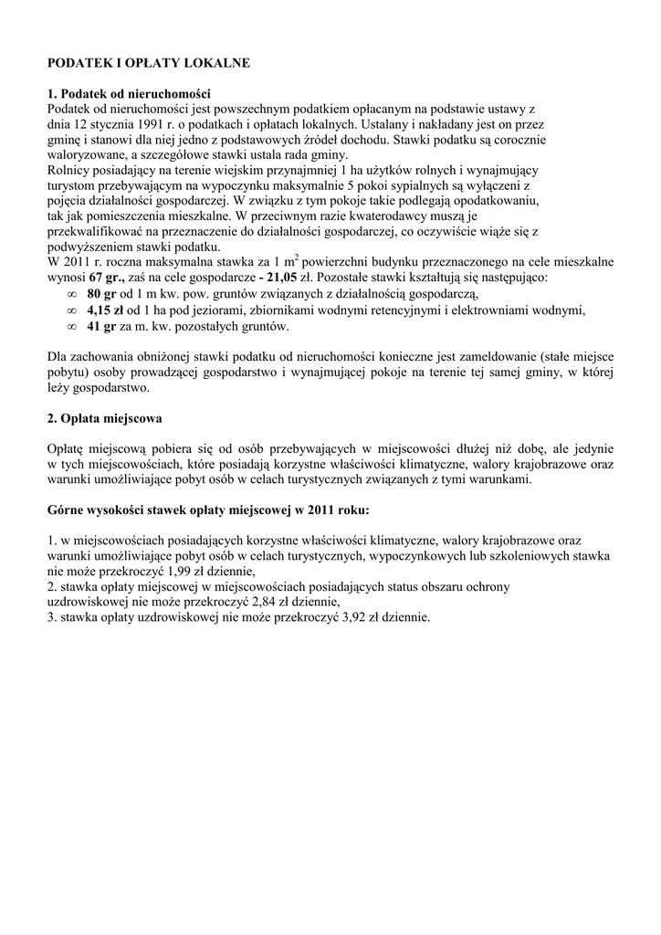 PODATEK I OPŁATY LOKALNE 1. Podatek od nieruchomości Podatek od nieruchomości jest powszechnym podatkiem opłacanym na podstawie ustawy z dnia 12 stycznia 1991 r. o podatkach i opłatach lokalnych. Ustalany i nakładany jest on przez gminę i stanowi dla niej jedno z podstawowych źródeł dochodu. Stawki podatku są corocznie waloryzowane, a szczegółowe stawki ustala rada gminy. Rolnicy posiadający na terenie wiejskim przynajmniej 1 ha użytków rolnych i wynajmujący turystom przebywającym na wypoczynku maksymalnie 5 pokoi sypialnych są wyłączeni z pojęcia działalności gospodarczej. W związku z tym pokoje takie podlegają opodatkowaniu, tak jak pomieszczenia mieszkalne. W przeciwnym razie kwaterodawcy muszą je przekwalifikować na przeznaczenie do działalności gospodarczej, co oczywiście wiąże się z podwyższeniem stawki podatku. W 2011 r. roczna maksymalna stawka za 1 m2 powierzchni budynku przeznaczonego na cele mieszkalne wynosi 67 gr., zaś na cele gospodarcze - 21,05 zł. Pozostałe stawki kształtują się następująco: • 80 gr od 1 m kw. pow. gruntów związanych z działalnością gospodarczą, • 4,15 zł od 1 ha pod jeziorami, zbiornikami wodnymi retencyjnymi i elektrowniami wodnymi, • 41 gr za m. kw. pozostałych gruntów. Dla zachowania obniżonej stawki podatku od nieruchomości konieczne jest zameldowanie (stałe miejsce pobytu) osoby prowadzącej gospodarstwo i wynajmującej pokoje na terenie tej samej gminy, w której leży gospodarstwo. 2. Opłata miejscowa Opłatę miejscową pobiera się od osób przebywających w miejscowości dłużej niż dobę, ale jedynie w tych miejscowościach, które posiadają korzystne właściwości klimatyczne, walory krajobrazowe oraz warunki umożliwiające pobyt osób w celach turystycznych związanych z tymi warunkami. Górne wysokości stawek opłaty miejscowej w 2011 roku: 1. w miejscowościach posiadających korzystne właściwości klimatyczne, walory krajobrazowe oraz warunki umożliwiające pobyt osób w celach turystycznych, wypoczynkowych lub szkoleniowych stawka nie może przekroczyć 1,99 zł dziennie, 2. stawka opłaty miejscowej w miejscowościach posiadających status obszaru ochrony uzdrowiskowej nie może przekroczyć 2,84 zł dziennie, 3. stawka opłaty uzdrowiskowej nie może przekroczyć 3,92 zł dziennie.
