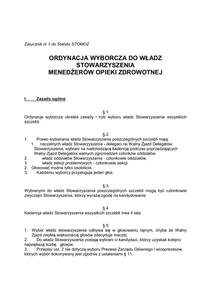 Załącznik nr 1 do Statutu STOMOZ ORDYNACJA WYBORCZA DO WŁADZ STOWARZYSZENIA MENEDŻERÓW OPIEKI ZDROWOTNEJ I. Zasady ogólne §1 Ordynacja wyborcza określa zasady i tryb wyboru władz Stowarzyszenia wszystkich szczebli. 1. 2. 3. 2. 3. §2 Prawo wybierania władz Stowarzyszenia poszczególnych szczebli mają: 1. naczelnych władz Stowarzyszenia - delegaci na Walny Zjazd Delegatów Stowarzyszenia, wybrani na nadchodzącą kadencję podczas poprzedzających Walny Zjazd Delegatów walnych zgromadzeń członków oddziałów władz oddziałów Stowarzyszenia - członkowie oddziałów, władz sekcji problemowych - członkowie sekcji. Głosować można tylko osobiście. Każdemu wyborcy przysługuje jeden głos. §3 Wybranymi do władz Stowarzyszenia poszczególnych szczebli mogą być członkowie zwyczajni Stowarzyszenia, którzy wyrażą zgodę na kandydowanie. §4 Kadencja władz Stowarzyszenia wszystkich szczebli trwa 4 lata. §5 1. Wybór władz stowarzyszenia odbywa się w głosowaniu tajnym, chyba że Walny Zjazd zwykłą większością głosów zdecyduje inaczej. 2. Do władz Stowarzyszenia zostają wybrani ci kandydaci, którzy uzyskali kolejno największą liczbę głosów. 3. Przepisy ust. 2 nie dotyczą wyboru Prezesa Zarządu Głównego i wiceprezesów, których wybór dokonywany jest zgodnie z ustaleniami § 11. 4. Jeżeli dwóch lub więcej kandydatów otrzyma w głosowaniu równą liczbę głosów i nie można ustalić, który z tych kandydatów wchodzi do władz lub drugiej tury wyborów, przeprowadza się na tych kandydatów głosowania dodatkowe do skutku. 5. W sytuacji określonej w ust. 4 można odstąpić od ponownego głosowania, jeżeli kandydaci zgłoszą rezygnację z kandydowania na rzecz jednego z pozostałych kandydatów. 6. Z kandydatów, którzy nie weszli do władz komisja skrutacyjna sporządza listę rezerwową wg kolejności uzyskanych głosów. §6 1. skreślony 2. Członkowie Głównej Komisji Rewizyjnej i Głównego Sądu Koleżeńskiego oraz sądów koleżeńskich i komisji rewizyjnych oddziałów nie mogą pełnić innych funkcji w Stowarzyszeniu. II. Wybór Prezesa Zarządu Głównego. §7 Wyboru dokonuje Walny Zjazd Delegatów Stowarzyszenia. §8 Prezesem Zarządu Głównego może zostać kandydat, który: 1. jest członkiem zwyczajnym, 2. uzyskał mandat delegata na Walny Zjazd. 1. 2. 3. 2. 3. §9 Uprawnionymi do wysuwania kandydatur są: 1. Zarząd Główny, zarządy oddziałów, delegaci na Walny Zjazd. Listy kandydatów składane są do Komisji Wyborczej Walnego Zjazdu . Komisja Wyborcza sporządza i przedstawia alfabetyczną listę kandydatów na stanowisko Prezesa Zarządu Głównego Stowarzyszenia. § 10 Przeprowadzenie wyborów zarządza Prezydium Walnego Zjazdu a przeprowadza Komisja Mandatowo-Skrutacyjna. § 11 1. Prezes Zarządu Głównego i Wiceprezesi wybierani są w I turze bezwzględną większością głosów. 2. Jeżeli żaden lub część z kandydatów nie otrzymała w I turze wymaganej większości głosów, zarządza się II turę wyborów. 3. W przypadku wyboru Prezesa Zarządu Głównego do II tury stają 2 kandydaci, którzy otrzymali największą liczbę głosów. 4. W II turze Prezesa Zarządu Głównego i wiceprezesów wybiera się zwykłą większością głosów. III. Wybór naczelnych władz Stowarzyszenia. § 12 Wyboru dokonuje Walny Zjazd Delegatów Stowarzyszenia § 13 Walny Zjazd dokonuje wyboru: 1) 5 wiceprezesów Zarządu Głównego, 5 członków Głównej Komisji Rewizyjnej, 3 członków Głównego Sądu Koleżeńskiego. § 14 Do władz Stowarzyszenia mogą kandydować członkowie zwyczajni będący delegatami na Walny Zjazd z zastrzeżeniem przepisów § 6. § 15 Przeprowadzenie wyborów zarządza Prezydium Walnego Zjazdu a przeprowadza je Komisja Mandatowo-Skrutacyjna. IV. Wybór władz oddziałów Stowarzyszenia. § 16 Wyboru dokonuje Walne Zgromadzenie Członków Oddziału. § 17 Walne Zgromadzenie wybiera: 1) Prezesa Zarządu Oddziału, 3-8 członków zarządu oddziału, 3 członków komisji rewizyjnej oddziału, 3 członków sądu koleżeńskiego oddziału. § 18 skreślony § 19 1. Członkami władz oddziału, mogą zostać członkowie zwyczajni danego oddziału biorący udział w Walnym Zgromadzeniu, z zastrzeżeniem ust. 2. Członek zwyczajny, który zamierza kandydować do władz oddziału, ale z usprawiedliwionej przyczyny nie może uczestniczyć w Walnym Zgromadzeniu, może na ręce Prezesa Zarządu Oddziału złożyć pisemne oświadczenie woli o wyrażeniu zgody na kandydowanie na określoną funkcję. § 20 1. Uprawnionymi do wysuwania kandydatur są uczestnicy Walnego Zgromadzenia będący członkami zwyczajnymi. 2. Listy kandydatów składane są do Komisji Wyborczej Walnego Zgromadzenia. Komisja wyborcza sporządza i przedstawia alfabetyczne listy kandydatów do poszczególnych władz. § 21 Przeprowadzenie wyborów zarządza Prezydium przeprowadza je Komisja Mandatowo-Skrutacyjna. Walnego Zgromadzenia a V. Wybór delegatów na Walny Zjazd. § 22 Na Walnych Sprawozdawczo-Wyborczych Zgromadzeniach Członków Oddziału poprzedzających Walne Zjazdy Delegatów Stowarzyszenia wybierani są delegaci oddziału na Zjazd. § 23 1. Przed każdym Walnym Zgromadzeniem Sprawozdawczo-Wyborczym Członków Oddziału Zarząd Główny określa liczbę członków zwyczajnych oddziału, stanowiącą podstawę do wyboru delegatów. 2. Liczba, o której mowa w ust.1 jest ilorazem liczby członków zwyczajnych wg stanu na dzień zgłoszenia na Walny Zjazd i liczby 8. W przypadku ułamka ilorazu, liczbę delegatów zaokrągla się do jedności wg schematu : poniżej 0,5 = brak delegata, powyżej 0,5 = 1 delegat. § 24 1. Delegatem może zostać każdy członek zwyczajny oddziału. 2. Wybory przeprowadza się zgodnie z zapisami § 3 i § 5. § 25 1. Jeśli w czasie kadencji zmieni się ilość oddziałów przez podział lub zmianę zasięgu oddziałów istniejących, to delegaci zachowują swoje mandaty w nowo powstałyc