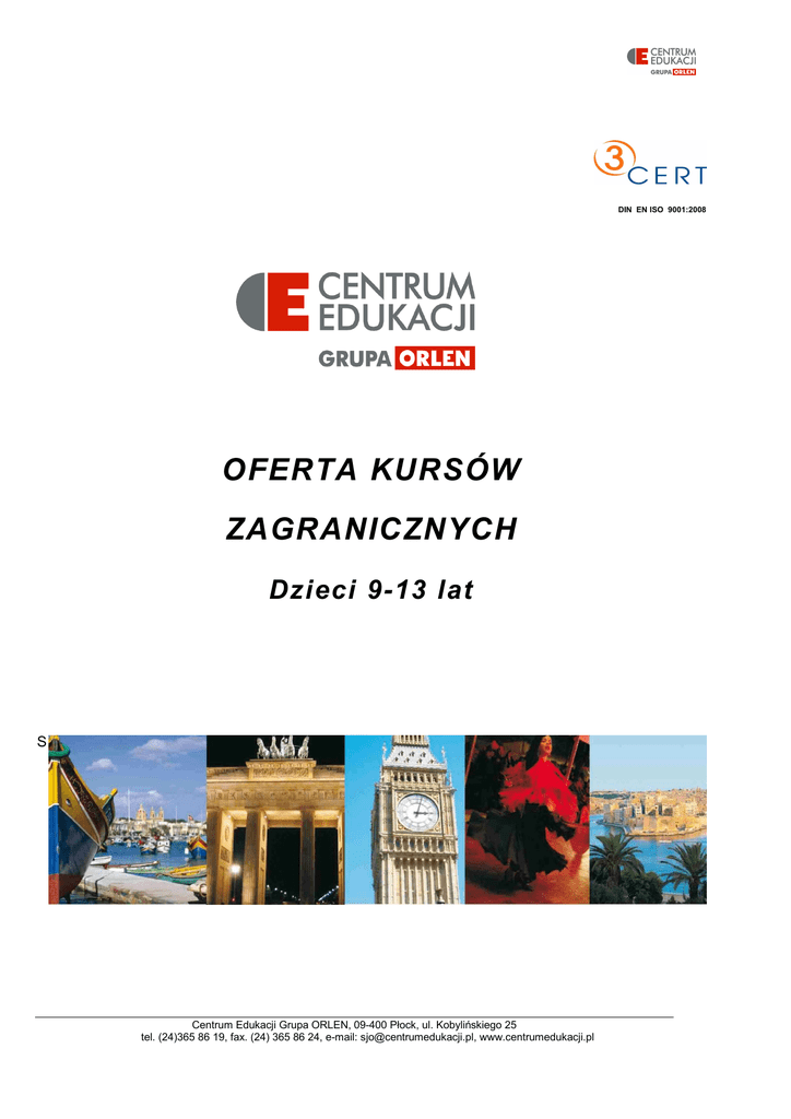 DIN EN ISO 9001:2008 OFERTA KURSÓW ZAGRANICZNYCH Dzieci 9-13 lat S Centrum Edukacji Grupa ORLEN, 09-400 Płock, ul. Kobylińskiego 25 tel. (24)365 86 19, fax. (24) 365 86 24, e-mail: [email protected], www.centrumedukacji.pl Cambridge Academy of English powstała w 1975r. i od dawna posiada akredytację British Council. Od wielu lat z powodzeniem prowadzi kursy dla młodych ludzi. W kursach biorą udział dzieci i młodzież z całego świata – wielu słuchaczy powraca rok później – i bierze udział w zróżnicowanych, atrakcyjnych i oryginalnych programach letnich. MORETON HALL Kursy stacjonarne dla dzieci w wieku 9-13 lat Moreton Hall to prywatna szkoła z internatem, która latem zamienia się w centrum kursów stacjonarnych dla juniorów. Mieści się w małym gościnnym miasteczku Bury St. Edmunds położonym 35 minut drogi samochodem z Cambridge. Kurs przeznaczony jest dla dzieci w wieku 9 – 13 lat, które chciałyby się świetnie bawić przy nauce języka angielskiego. Uczestnicy kursu spędzają czas pracowicie i przyjemnie, ucząc się wraz z rówieśnikami z całego świata oraz poznając nowe sporty i nowych kolegów. INFORMACJE OGÓLNE: • 12,5 godzin lekcji tygodniowo • Pełen program lekcji i zajęć pozalekcyjnych • Proporcja nauczycieli do słuchaczy: 1:6 • Wielkość grupy – maksymalnie 12 osób • Nie ma dużych grup z jednego kraju • Jedna całodniowa i jedna kilkugodzinna wycieczka co 2 tygodnie • Prywatne korty tenisowe, hala sportowa, boiska piłkarskie i ogrzewany basen • Wszystkie koszty wliczone w cenę kursu Centrum Edukacji Grupa ORLEN, 09-400 Płock, ul. Kobylińskiego 25 tel. (24)365 86 19, fax. (24) 365 86 24, e-mail: [email protected], www.centrumedukacji.pl PRZYKŁADOWY ROZKŁAD ZAJĘĆ w MORETON HALL Rano: 8:00 pobudka 8:30 śniadanie 9:15 angielski: nowy język/ zabawa gramatyczna 10:10 przerwa 10:30 angielski: czytanie i pisanie – opowieść w grupie 11:20 przerwa 11:35 angielski: słuchanie i mówienie – film video i odgrywanie scenek 12:20 lunch 13:00 czas wolny/ pływanie Popołudnie: 14:00 zajęcia pozalekcyjne – lepienie garnków, malowanie koszulek, muzyka, robienie bransoletek 15:15 przerwa – podwieczorek 15:45 zajęcia sportowe – tenis, krykiet, piłka nożna, koszykówka 17:00 czas wolny/ pływanie 18:00 praca domowa Wieczór: 18:30 posiłek wieczorny i czas wolny 19:30 podchody i inne zabawy 21:45 pora spania Cennik MORETON HALL Kurs 2-tygodniowy £1 920 Terminy kursu: MH1 07.07 – 18.07.2013 MH2 21.07 – 01.08.2013 Do powyższych cen należy doliczyć 400 PLN opłaty manipulacyjnej CENA ZAWIERA: • Zakwaterowanie • Kurs językowy • Wyżywienie • Zajęcia pozalekcyjne • Transfer z/na lotnisko • Wycieczki • Ubezpieczenie Centrum Edukacji Grupa ORLEN, 09-400 Płock, ul. Kobylińskiego 25 tel. (24)365 86 19, fax. (24) 365 86 24, e-mail: [email protected], www.centrumedukacji.pl Zakwaterowanie Moreton Hall to letnia szkoła z internatem, co oznacza, że uczniowie będą spać we wspólnej sypialni z 3-9 innymi uczniami. Wyżywienie Wszystkie posiłki uczniowie jedzą w szkole razem z kolegami i nauczycielami (chyba, że w planie dnia znajduje się całodniowa wycieczka – wtedy dzieci otrzymują prowiant na drogę) Zajęcia Zajęcia nie odbywają się w formie do jakiej uczniowie są przyzwyczajeni. Kursanci będą mieli możliwość nauczenia się słownictwa, gramatyki i wymowy zupełnie nową metodą opartą na „projektach”: będą pisać dla gazety, opracowywać przewodniki turystyczne, projektować wzory tapet, prowadzić program radiowy, nauczą się języka angielskiego robiąc rzeczy, które ich interesują. Zajęcia pozalekcyjne Obie szkoły mają świetne zaplecze sportowe. Prywatny basen, korty tenisowe oraz dużą halę sportową do koszykówki, siatkówki, badmintona oraz innych sportów halowych. Szkoły posiadają także liczne boiska, na których można grać w piłkę nożną, koszykówkę, krykieta i rugby oraz oferuje zajęcia plastyczne, aerobik, żonglowanie, malowanie koszulek, malowanie twarzy, emaliowanie, kółko aktorskie i muzyczne, a wieczorem…. wyjścia do kina, na kręgle, imprezy tematyczne, podchody, quizy, karaoke i filmy na video. Wycieczki Wycieczki są organizowane w każdy weekend: w soboty - wycieczki całodniowe, na przykład do Londynu, gdzie dzieci będą mogły pozwiedzać słynne atrakcje turystyczne w niedziele - kilkugodzinne wycieczki do atrakcji położonych w pobliżu szkoły, na przykład do Cambridge. Nauczyciele Nauczyciele są energiczni, świetnie wykwalifikowani i doświadczeni w kontaktach z dziećmi i młodzieżą. Będą nie tylko prowadzić zajęcia z angielskiego, ale też zajęcia sportowe i z innych dziedzin. Kieszonkowe Ile pieniędzy dzieci powinny ze sobą zabrać? Zabierz tylko kieszonkowe na słodycze, pamiątki i prezenty – wszystkie inne koszty są już opłacone. Na życzenie rodziców szkoła może przechowywać kieszonkowe dzieci. Centrum Edukacji Grupa ORLEN, 09-400 Płock, ul. Kobylińskiego 25 tel. (24)365 86 19, fax. (24) 365 86 24, e-mail: [email protected], www.centrumedukacji.pl Poniżej znajdą Państwo najczęściej pojawiające się pytania: Odbiór z lotniska Po wszystkie dzieci na lotnisko wychodzą pracownicy CAE z dużymi tablicami identyfikacyjnymi. Nasi pracownicy nie opuszczą lotniska, dopóki nie odbiorą wszystkich dzieci lub nie otrzymają od Państwa lub Państwa agenta potwierdzenia, że dziecko nie przyjedzie. Po zakończeniu kursu dzieci są odwożone na lotnisko i personel szkoły czeka, aż ich samolot wystartuje. W cenę kursu wliczony jest transport z lotniska, pod warunkiem, że Państwa dziecko przyleci w godzinach 9:00 – 19:00 w niedzielę przed rozpoczęciem kursu i odleci w sobotę po zakończeniu kursu w tych samych godzinach. Natomiast jeżeli życzą sobie Państwo, żeby dziecko przybyło na miejsce lub wróciło do domu o innej godzinie lub innego dnia, należy się liczyć z do