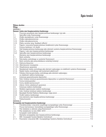 Spis treści Wykaz skrótów ................................................................................................................................................ 7 Wstęp .............................................................................................................................................................. 9 ROZDZIAŁ I Geneza i istota sieci bezpieczeństwa bankowego .......................................................................................... 13 1. 1.1. 1.2. 1.2.1. 1.2.2. 1.2.3. 1.3. 1.4. 1.5. 1.5.1. 1.5.2. 2. 2.1. 2.1.1. 2.1.2. 2.1.2.1. 2.1.2.2. 2.1.2.3. 2.1.3. 2.1.4. 2.1.5. 2.2. 2.2.1. 2.2.2. 2.2.3. 2.2.4. 2.3. 2.3.1. 2.3.2. 2.3.3. 2.3.4. 2.4. 2.5. Przyczyny powstania sieci bezpieczeństwa bankowego i jej cele...................................................... 13 Specyfika rynku finansowego .......................................................................................................... 13 Źródła niestabilności rynku finansowego .......................................................................................... 16 Źródła makroekonomiczne ................................................................................................................ 17 Źródła mikroekonomiczne ................................................................................................................ 19 Efekty zwrotne (ang. feedback effects) ............................................................................................ 22 Pojęcie i znaczenie bezpieczeństwa (stabilności) rynku finansowego................................................ 23 Kryzysy bankowe i ich skutki ............................................................................................................ 25 Sieć bezpieczeństwa bankowego jako element systemu bezpieczeństwa finansowego .................. 28 Pojęcie i cele sieci bezpieczeństwa bankowego .............................................................................. 28 Specyfika sieci bezpieczeństwa bankowego .................................................................................... 33 Elementy sieci bezpieczeństwa bankowego .................................................................................... 36 Bank centralny.................................................................................................................................. 36 Rola banku centralnego w systemie finansowym ............................................................................ 36 Bank centralny jako pożyczkodawca ostatniej instancji .................................................................... 38 Doktryna klasyczna .......................................................................................................................... 39 Alternatywne rozwiązania ................................................................................................................ 43 Współczesne spojrzenie .................................................................................................................. 44 Niezależność banku centralnego jako element wpływający na stabilność systemu finansowego ........ 47 Nadzór banku centralnego nad systemami płatniczymi .................................................................... 51 Polityka informacyjna banku centralnego jako element wpływający na stabilność sektora bankowego .................................................................................................... 53 Instytucja gwarantowania depozytów .............................................................................................. 58 Rola i funkcje instytucji gwarantowania depozytów w systemie finansowym .................................. 58 Forma instytucjonalna ...................................................................................................................... 61 Formy działań pomocowych ............................................................................................................ 64 Zakres i limity udzielanych gwarancji ................................................................................................ 65 Instytucja nadzoru bankowego ........................................................................................................ 70 Modele organizacyjne nadzoru bankowego ...................................................................................... 70 Cele i funkcje instytucji nadzoru bankowego .................................................................................... 78 Bazylejski Komitet Nadzoru Bankowego i jego prace ........................................................................ 82 Środki nadzoru bankowego .............................................................................................................. 88 Inne elementy sieci bezpieczeństwa bankowego ............................................................................ 92 Podsumowanie ................................................................................................................................ 96 ROZDZIAŁ II Europejska sieć bezpieczeństwa bankowego ................................................................................................ 99 1. 1.1. 1.2. 1.3. 1.4. 2. 2.1. 2.1.1. Charakterystyka i znaczenie wspólnego europejskiego rynku finansowego ...................................... 99 Proces harmonizacji i konsolidacji europejskiego rynku finansowego ................................................ 99 Plan działania w zakresie usług finansowych .................................................................................. 104 Plan działalności na lata 2005–2010 .............................................................................................. 106 Europejski rynek bankowy .............................................................................................................. 108 Elementy europej