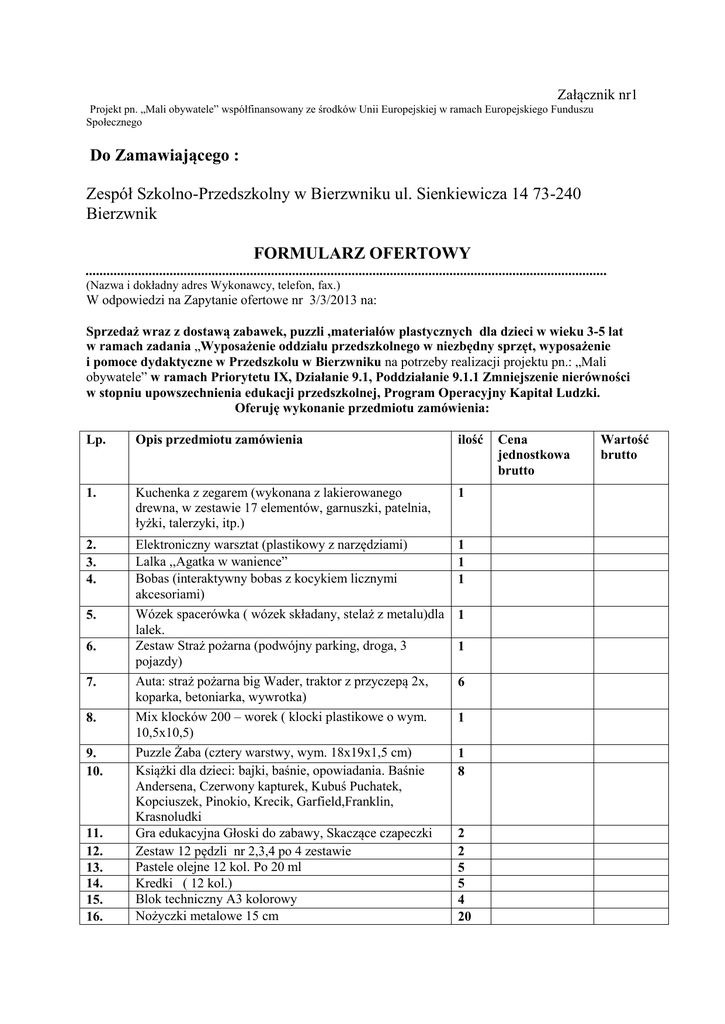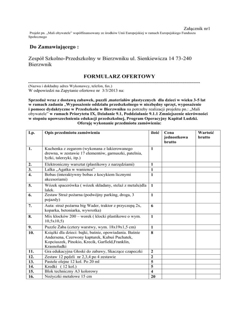 Załącznik nr1 Projekt pn. „Mali obywatele” współfinansowany ze środków Unii Europejskiej w ramach Europejskiego Funduszu Społecznego Do Zamawiającego : Zespół Szkolno-Przedszkolny w Bierzwniku ul. Sienkiewicza 14 73-240 Bierzwnik FORMULARZ OFERTOWY ..................................................................................................................................................... (Nazwa i dokładny adres Wykonawcy, telefon, fax.) W odpowiedzi na Zapytanie ofertowe nr 3/3/2013 na: Sprzedaż wraz z dostawą zabawek, puzzli ,materiałów plastycznych dla dzieci w wieku 3-5 lat w ramach zadania „Wyposażenie oddziału przedszkolnego w niezbędny sprzęt, wyposażenie i pomoce dydaktyczne w Przedszkolu w Bierzwniku na potrzeby realizacji projektu pn.: „Mali obywatele” w ramach Priorytetu IX, Działanie 9.1, Poddziałanie 9.1.1 Zmniejszenie nierówności w stopniu upowszechnienia edukacji przedszkolnej, Program Operacyjny Kapitał Ludzki. Oferuję wykonanie przedmiotu zamówienia: Lp. Opis przedmiotu zamówienia ilość 1. Kuchenka z zegarem (wykonana z lakierowanego drewna, w zestawie 17 elementów, garnuszki, patelnia, łyżki, talerzyki, itp.) 1 2. 3. 4. Elektroniczny warsztat (plastikowy z narzędziami) Lalka ,,Agatka w wanience” Bobas (interaktywny bobas z kocykiem licznymi akcesoriami) Wózek spacerówka ( wózek składany, stelaż z metalu)dla lalek. Zestaw Straż pożarna (podwójny parking, droga, 3 pojazdy) 1 1 1 7. Auta: straż pożarna big Wader, traktor z przyczepą 2x, koparka, betoniarka, wywrotka) 6 8. Mix klocków 200 – worek ( klocki plastikowe o wym. 10,5x10,5) 1 9. 10. Puzzle Żaba (cztery warstwy, wym. 18x19x1,5 cm) Książki dla dzieci: bajki, baśnie, opowiadania. Baśnie Andersena, Czerwony kapturek, Kubuś Puchatek, Kopciuszek, Pinokio, Krecik, Garfield,Franklin, Krasnoludki Gra edukacyjna Głoski do zabawy, Skaczące czapeczki Zestaw 12 pędzli nr 2,3,4 po 4 zestawie Pastele olejne 12 kol. Po 20 ml Kredki ( 12 kol.) Blok techniczny A3 kolorowy Nożyczki metalowe 15 cm 1 8 5. 6. 11. 12. 13. 14. 15. 16. 1 1 2 2 5 5 4 20 Cena jednostkowa brutto Wartość brutto 17. 18. 19. 20. 21. 22. 23. 24. 25. 26. 27. 28. 29. 30. Plastelina w laseczkach 12 kolorów . Farby plakatowe pastelowe 500 ml w kolorach: żółta, pomarańczowa, czerwona, fioletowa, niebieska, zielona Łóżeczko z pościelą (wymiary:26x59x28) Kolorowe rolki krepiny 10 rolek w 10 kolorach Filc kreatywny (54 arkusze w 18 różnych kolorach) 15 6 Serwis do herbaty (zestaw 17 elementów) plastyk do zabawy Zestaw naczyń z suszarką (25 elementów)- różnorodne naczynia plastykowe do zabawy w kuchnię. Kasa zabawkowa do zabawy w sklep z wyświetlanym monitorkiem ceny. Stragan na kółkach (wysokość 130cm x szer.79cm x gł. 49 cm, gł. Blatu 40cm, stragan wykonany ze sklejki) Zestaw z mostem (100- elementowy zestaw szyn z mostem wraz z pojazdami, lokomotywą itp. Wszystkie elementy wykonane z drewna bukowego) Zestaw – Miasteczko (wymiary: 125x190cm) plansza miasteczka z domkami ulicami do zabawy. Klocki ażurowe w słoiku (170szt.) Zwierzątka i ich dom (puzzle drewniane) Puzzle zwierzaki I, II (komplet 5 + 6 wizerunków zwierzaków 1 1 1 1 1 1 1 1 1 1 1 1+1 za łączne wynagrodzenie: netto …………………………………… słownie: …………………………………………………………………………………. podatek VAT …. % ………………………. słownie: …………………………………………………………………………………. brutto …………………………………… słownie: …………………………………………………………………………………. Oświadczam, że: 1. Znajduję się w sytuacji ekonomicznej i finansowej umożliwiającej wykonanie zamówienia. 2. Zapoznałem się z warunkami podanymi przez Zamawiającego w Zapytaniu ofertowym, w tym w Opisie przedmiotu zamówienia i nie wnoszę do nich żadnych zastrzeżeń. 3. Uzyskałem wszelkie niezbędne informacje do przygotowania oferty i wykonania zamówienia. 4. Uważam się związany niniejszą ofertą przez 30 dni od dnia upływu terminu składania ofert. 5. W przypadku udzielenie zamówienia, zobowiązuję się do zawarcia umowy w miejscu i terminie wskazanym przez Zamawiającego oraz do wykonania zamówienia zgodnie z wymaganiami Zamawiającego. 6. Zaproponowane przeze mnie wynagrodzenie obejmuje wszystkie koszty realizacji przedmiotu zamówienia, w tym koszt dostawy i wniesienia mebli i wyposażenia do oddziału przedszkolnego w Przedszkolu w Bierzwniku ......................................., dnia ............................ ....................................................................... podpis osoby/osób uprawnionej/ych do reprezentowania oferenta Projekt pn. „Mali obywatele” współfinansowany ze środków Unii Europejskiej w ramach Europejskiego Funduszu Społecznego