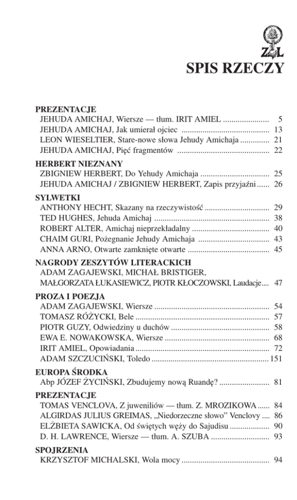 SPIS RZECZY PREZENTACJE JEHUDA AMICHAJ, Wiersze — tłum. IRIT AMIEL ...................... 5 JEHUDA AMICHAJ, Jak umierał ojciec .......................................... 13 LEON WIESELTIER, Stare−nowe słowa Jehudy Amichaja .............. 21 JEHUDA AMICHAJ, Pięć fragmentów ............................................ 22 HERBERT NIEZNANY ZBIGNIEW HERBERT, Do Yehudy Amichaja ................................. 25 JEHUDA AMICHAJ / ZBIGNIEW HERBERT, Zapis przyjaźni ...... 26 SYLWETKI ANTHONY HECHT, Skazany na rzeczywistość ............................... TED HUGHES, Jehuda Amichaj ....................................................... ROBERT ALTER, Amichaj nieprzekładalny ..................................... CHAIM GURI, Pożegnanie Jehudy Amichaja .................................. ANNA ARNO, Otwarte zamknięte otwarte ....................................... 29 38 40 43 45 NAGRODY ZESZYTÓW LITERACKICH ADAM ZAGAJEWSKI, MICHAŁ BRISTIGER, MAŁGORZATA ŁUKASIEWICZ, PIOTR KŁOCZOWSKI, Laudacje.... 47 PROZA I POEZJA ADAM ZAGAJEWSKI, Wiersze ....................................................... 54 TOMASZ RÓŻYCKI, Bele ................................................................ 57 PIOTR GUZY, Odwiedziny u duchów ............................................... 58 EWA E. NOWAKOWSKA, Wiersze .................................................. 68 IRIT AMIEL, Opowiadania ................................................................ 72 ADAM SZCZUCIŃSKI, Toledo ........................................................ 151 EUROPA ŚRODKA Abp JÓZEF ŻYCIŃSKI, Zbudujemy nową Ruandę? ........................ 81 PREZENTACJE TOMAS VENCLOVA, Z juweniliów — tłum. Z. MROZIKOWA ...... ALGIRDAS JULIUS GREIMAS, „Niedorzeczne słowo” Venclovy .... ELŻBIETA SAWICKA, Od świętych węży do Sajudisu ................... D. H. LAWRENCE, Wiersze — tłum. A. SZUBA ............................ 84 86 90 93 SPOJRZENIA KRZYSZTOF MICHALSKI, Wola mocy .......................................... 94 WSPOMNIENIA JULIA HARTWIG, WISŁAWA SZYMBORSKA, Pożegnanie Ryszarda Kapuścińskiego ...................................... 105 ANDERS BODEGÅRD, Lęk wysokości .......................................... 106 MARTA HERLING, Kapuściński i Herling−Grudziński ................... 112 MAREK EDELMAN, Antek i Celina ............................................... 114 JADWIGA WEŁYKANOWICZ, Lwowski rodowód........................ 117 WSPOMINKI JACEK WOŹNIAKOWSKI, KUL w PRL........................................ 131 WARIACJE NA TEMAT TOMASZ CYZ, Powrót Dionizosa.................................................... 133 ALBUM BRODNICKIE MARIAN BIZAN, Moja muzyka. Z zapisków pamięci (VIII) ......... 140 PORTRETY MIAST ROBERTO SALVADORI, Boston dzisiaj ......................................... 144 ZOBACZONE, PRZECZYTANE TOMASZ CYZ, GRZEGORZ JÓZEFCZUK, JACEK MAJ, JANUSZ MAJCHEREK, ANNA TENCZYŃSKA, ELŻBIETA TOSZA, RAFAŁ WĘGRZYNIAK, ADAM ZAGAJEWSKI ......................................................................154 O KSIĄŻKACH JULIA HARTWIG, O ,,Wierszach zebranych” St. Barańczaka ........ 164 EWA BIEŃKOWSKA, Korespondencja Hesse / Mann .................... 169 JULIUSZ KURKIEWICZ, Wiek XVIII według Starobinskiego ...... 175 MAREK ZAGAŃCZYK, Noty o książkach (IV).............................. 179 LESZEK SZARUGA, Świat poetycki (XXXIV) .............................. 182 NOTATKI MARCIN GMYS, Fonoteka .............................................................. 186 RED. „ZL”, Herbert w Ameryce ....................................................... 191 JANUSZ MAJCHEREK, Mrożek krzepi .......................................... 191 TOMASZ CYZ, ,,Oresteja” wg Klaty ............................................... 193 ZOFIA KRÓL, Drugi cud .................................................................. 195 RAFAŁ WĘGRZYNIAK, Między Gwatemalą a Londynem ............ 197 JUSTYNA GUZE, Wielkie wystawy. Rok 2006 ............................... 198 MARIA STAUBER, Paryskie wystawy............................................. 200 ANNA SOBIESKA, Apokryf o Jurodiwym i Samozwańcu.............. 202 MAGDALENA LUBELSKA, Nowe rozkosze Jerzego Pilcha ......... 204 GRZEGORZ JÓZEFCZUK, Festiwal Schulza w Drohobyczu......... 206 NAGRODY LITERACKIE, KRONIKA, LISTY DO I OD RED. „ZL”: BARBARA TORUŃCZYK, ŁUKASZ WITKOWSKI........................... 207 KOMUNIKATY, ODPOWIEDZI REDAKCJI ............................... 214 NOWE PUBLIKACJE ...................................................................... 215 NOTY O AUTORACH, ZESZYTY LITERACKIE 2006.............. 218