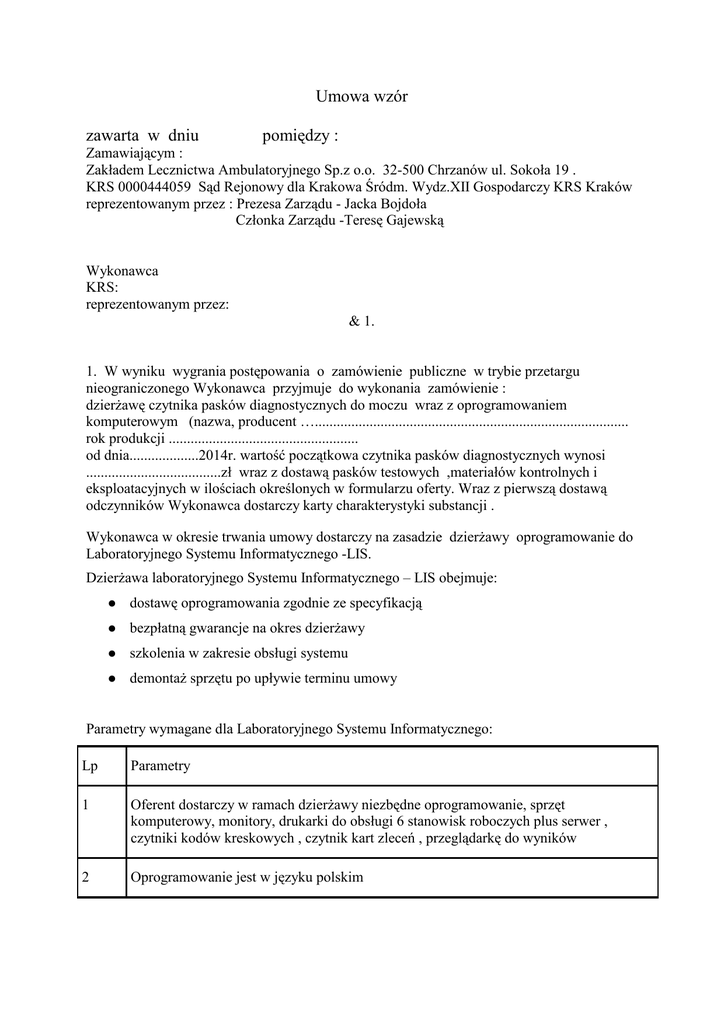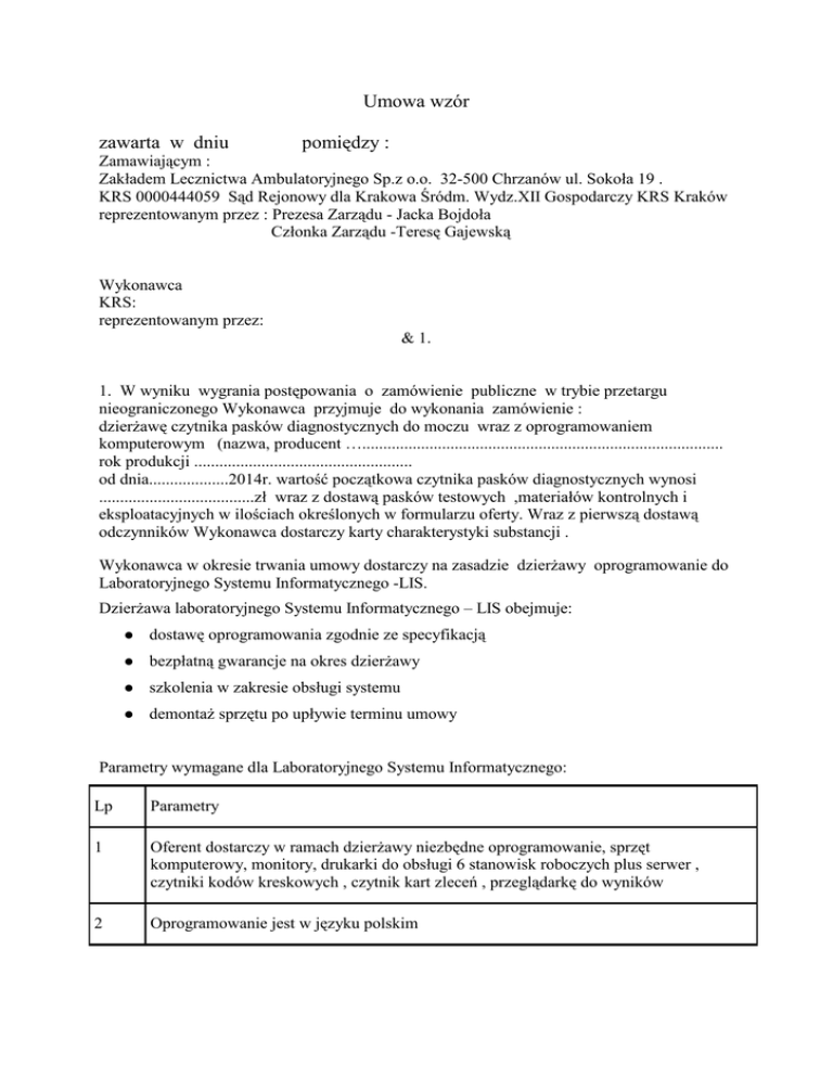 Umowa wzór zawarta w dniu pomiędzy : Zamawiającym : Zakładem Lecznictwa Ambulatoryjnego Sp.z o.o. 32-500 Chrzanów ul. Sokoła 19 . KRS 0000444059 Sąd Rejonowy dla Krakowa Śródm. Wydz.XII Gospodarczy KRS Kraków reprezentowanym przez : Prezesa Zarządu - Jacka Bojdoła Członka Zarządu -Teresę Gajewską Wykonawca KRS: reprezentowanym przez: & 1. 1. W wyniku wygrania postępowania o zamówienie publiczne w trybie przetargu nieograniczonego Wykonawca przyjmuje do wykonania zamówienie : dzierŜawę czytnika pasków diagnostycznych do moczu wraz z oprogramowaniem komputerowym (nazwa, producent …...................................................................................... rok produkcji .................................................... od dnia...................2014r. wartość początkowa czytnika pasków diagnostycznych wynosi .....................................zł wraz z dostawą pasków testowych ,materiałów kontrolnych i eksploatacyjnych w ilościach określonych w formularzu oferty. Wraz z pierwszą dostawą odczynników Wykonawca dostarczy karty charakterystyki substancji . Wykonawca w okresie trwania umowy dostarczy na zasadzie dzierŜawy oprogramowanie do Laboratoryjnego Systemu Informatycznego -LIS. DzierŜawa laboratoryjnego Systemu Informatycznego – LIS obejmuje: dostawę oprogramowania zgodnie ze specyfikacją bezpłatną gwarancje na okres dzierŜawy szkolenia w zakresie obsługi systemu demontaŜ sprzętu po upływie terminu umowy Parametry wymagane dla Laboratoryjnego Systemu Informatycznego: Lp Parametry 1 Oferent dostarczy w ramach dzierŜawy niezbędne oprogramowanie, sprzęt komputerowy, monitory, drukarki do obsługi 6 stanowisk roboczych plus serwer , czytniki kodów kreskowych , czytnik kart zleceń , przeglądarkę do wyników 2 Oprogramowanie jest w języku polskim 3 Oferent zapewni bezpłatnie w ramach dzierŜawy połączenie wspólnym serwerem analizatorów , wdroŜenie oraz szkolenie z zakresu obsługi systemu 4 System powinien spinać w sieć oferowany czytnik do moczu oraz aparaty posiadane przez laboratorium : - COBAS Integra 400 firmy Roche ( biochemia) - COBAS e 411 firmy Roche ( immunologia) - COAG Chrom 3003 firmy BioKsel ( koagulologia ) - SYSMEX 1000 i firmy Sysmex ( hematologia) - czytnik OB ESR 48 firmy Kabe 5 System umoŜliwia manualne wpisywanie osadu moczu, wynik z oznaczenia elektrolitów ( Na, Cl, K ), rozmaz krwi, komentarz 6 Rejestracja pacjentów i zleceń moŜliwa manualnie i przy pomocy kodów kreskowych 7 Rejestracja próbek za pomoca skanera do kart zleceń 8 System umoŜliwia autoryzację uŜytkowników oraz wyników 9 MoŜliwość wprowadzenia podpisu elektronicznego wraz z modernizacją systemu 10 System umozliwia prowadzenie wewnątrzlaboratoryjnej kontroli jakości ( wykresy , SD, CV )wg zasad Westgarda 11 System umoŜliwia drukowanie wyników pojedynczo oraz zbiorowo 12 System posiada mozliwość prowadzenia kartotek zleceniodawców oraz pacjentów 13 System posiada znakowanie matariału kodami kreskowymi umoŜliwiającymi jednoznaczną identyfikację próbki ze zleceniem 14 System posiada moŜliwość tworzenia archiwum 15 System umoŜliwia zarządzanie informacją ( tworzenie list roboczych, księgi głównej , sterowanie przepływem zleceń pomiędzy stanowiskami komputerowymi a analizatorami) 16 System umoŜliwia kontrolę procesu walidacji wyników ( wyświetla wartości referencyjne z uwzględnieniem wieku i płci , flaguje wyniki patologiczne ) 17 UmoŜliwia prowadzenie delta Check pacjenta 18 MoŜliwość automatycznego obliczania testów obliczeniowych w oparciu o stosowane w diagnostyce laboratoryjnej wzory 19 System posiada moŜliwość konfigurowania wydruków wyników badań ( moŜliwość wpisywania i edycji następujących danych : nr zlecenia, kod zleconego badania, data i godzina pobrania, data rejestracji i wykonania badania, pesel, imię i nazwisko , data urodzenia , płeć , wiek oraz adres pacjenta, jednostka kierujaca , lekarz kierujący ) 20 MoŜliwość wykonywania obliczeń statystycznych liczby zleceń , badań, oznaczeń ogółem i dla poszczególnych kontrahentów 21 Raportowanie ilości wykonanych badań w wybranym przedziale czasowym dla wybranego kontrahenta 22 System umoŜliwia obsługę rozliczeń finansowych z kontrahentami, zleceniodawcami , z pacjentami wykonującymi badania odpłatne 23 System umoŜliwi elektroniczny dostęp innych uŜytkowników( lekarze ZLA ) do wyników badań laboratoryjnych z wykorzystaniem przeglądarki 24 MoŜliwość zabezpieczenia bazy danych przez cykliczne i automatyczne tworzenie kopii zapasowych systemu wraz z danymi laboratorium i osobowymi pacjenta ( minimum jeden niezaleŜny nośnik elektroniczny) 25 Wykonawca zapewni w ramach czynszu dzierŜawnego serwisowanie systemu przez cały okres uŜytkowania 26 WdroŜenie – czas wdroŜenia max. 21 dni roboczych od dnia podpisania umowy 27 W przypadku zaoferowania innego oprogramowania niŜ dotychczas uŜywane („PSM”) w celu obsługi bazy archiwalnej oferent zapewni integralność danych archiwalnych z ostatnich 3 lat z dotychczas uŜywanego oprogramowania analitycznego z zachowaniem ich dotychczasowej dostępności i funkcjonalności . Ewentualne przeniesienie bazy danych do innego oprogramowania musi nastąpić jednorazowo przy zachowaniu ciągłości pracy laboratorium. 2. DzierŜawa czytnika testów do moczu powinna obejmować: dostarczenie odczynników do badań z koniecznymi materiałami kontrolnymi, kalibracyjnymi i innymi zuŜywalnymi niezbędnymi do wykonania badania mocz moŜliwość dzierŜawienia laboratoryjnego systemu informatycznego LIS podłączenie aparatu do systemu LIS Wymagania techniczne i inne dotyczące czytnika pasków diagnostycznych do moczu: Lp Parametry wymagane 1 Czytnik pasków do moczu nie starszy niŜ rok produkcji 2011 przeznaczony do analizy następujących parametrów fiz-chem. badania ogólnego moczu: glukoza, białko, bilirubina, ciała ketonowe, urobilinog