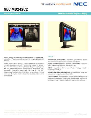 NEC MD242C2 2MP Medical Certified Diagnostic Display Numer porządkowy: 60003333 System kolorowych monitorów o rozdzielczości 2,3 megapiksela i przekątnej 24” przeznaczony do podstawowej medycznej diagnostyki obrazowej Systemy monitorów NEC MD242C2 z płaskim panelem przeznaczone do wyświetlania obrazów cyfrowych w kolorze i skali szarości na potrzeby diagnozowania przez wykwalifikowanych lekarzy. Mogą być wykorzystywane m.in. do przeglądania obrazów diagnostycznych w radiografii oraz w technikach obrazowania medycznego takich jak TK i MRI. Aby zagwarantować zgodność parametrów obrazu ze specyfikacją, monitora można używać wyłącznie z kartami sterownika monitora zaakceptowanymi przez firmę NEC. ZALETY Ustabilizowana jakość obrazu - Wbudowany czujnik przedni reguluje luminancję monitora w krótszej oraz w dłuższej skali czasowej. Szybkie i wygodne sprawdzanie zgodności z normą DICOM - Na ekranie można przeprowadzić ad-hoc test zgodności z DICOM. DICOM na wyposażeniu - Monitor jest skalibrowany fabrycznie zgodnie z normą DICOM, część 14. Rozwiązania przyjazne dla środowiska - Mniejsze zużycie energii oraz bezrtęciowy system podświetlenia diodami LED. Łatwa konserwacja - Oprogramowanie GammaComp MD QA dołączone do monitora umożliwia łatwe kalibrowanie, konserwowanie i zapewnianie jakości, gwarantując wydajność urządzenia w całym okresie eksploatacji. Prawa autorskie do niniejszego dokumentu są przy © copyright 2015 NEC Display Solutions Europe GmbH. Wszelkie prawa zastrzeżone na rzecz ich właścicieli. Wszystkie nazwy sprzętu i oprogramowania to nazwy własne marek i/lub zastrzeżonych znaków towarowych odpowiednich producentów. Wszystkie specyfikacje mogą podlegać zmianom bez uprzedniego powiadamiania. Zastrzega się możliwość wystąpienia błędów i niekompletności danych. 19.04.2016 www.nec-display-solutions.com NEC MD242C2 - Dane techniczne Rodzaj panelu Monitor IPS TFT z podświetleniem W-LED Wielkość ekranu [cale/cm] 24.1 / 61.2 Proporcje obrazu 16:10 Rozmiar plamki [mm] 0.270 x 0.270 Luminancja [cd/m²] 180 (po kalibracji); 350 (max) Kontrast 1000:1 Kąty widzenia [°] 178 poziomo / 178 pionowo (CR 10:1) Czas reakcji [ms] 14 (tr - tf) Programowalna korekcja gamma 14-bitowa Fabryczna kalibracja 180 cd/m² dla poziomu bieli; Korekcja gamma zgodnie z normą DICOM GSDF przy 140 cd/m²; Temperatura barw 7500K Częstotliwość pozioma [kHz] 31.5 - 91.2 and 118.4 (analog) Częstotliwość pionowa [Hz] 50 - 85 ROZDZIELCZOŚĆ Rozdzielczość optymalna 1920 x 1200 przy 60 Hz MOŻLIWOŚCI PODŁĄCZANIA Cyfrowe 1 x DisplayPort; 1 x DVI-D; 1 x HDMI Analogowe 1 x D-sub 15 pin Pobór mocy [W] 22,7 (wysyłka); 29,5 (maks.) Tryb Power Save [W] < 1.5 Zasilanie 0.83 A/0.47 A; 100-240 V; zintegrowany zasilacz Temperatura otoczenia podczes pracy [°C] +5 do +35 Wilgotność otoczenia podczas pracy [%] 30 to 80 (non-condensing) ERGONOMIA Regulacja wysokości[mm] 150 PARAMETRY MECHANICZNE Wymiary [mm] 363 x 573 - 626 x 228 (Portrait mode); 557 x 378 - 528 x 228 (Landscape mode) Waga [kg] 10.2 Mocowanie VESA [mm] 100 x 100 (4 otwory) Cechy Specjalne Automatyczne sterowanie podświetleniem z czujnikiem 3 kolorów z przodu zapewnia stabilną jasność bieli i punkt bieli; Indywidualna krzywa korekcji gamma DICOM kalibrowana fabrycznie; Multiple OSD Lock-Out Modes; Precise DICOM GSDF Calibration using internal 14-bit look-up tables Złącze Kensington tak Zawartość opakowania Approved Display Controller Drivers; Display; GammaCompMD Client QA Software; Kabel DisplayPort Bezpieczeństwo i ergonomia CCC; CE-MDD (EN60601-1, EN60601-1-2); DIN V 6868-57 / DIN 6868-157 (for Fluoroscopy and CT); FDA510(k); TÜV Approved Medical Device (TÜV GM) Gwarancja 3 lata (w tym na podświetlenie ekranu); opcjonalne przedłużenie gwarancji na 4. i 5. rok Różne karty sterownika monitora AMD; Nvidia Oprogramowanie GammaCompMD QA Opcje Przyrząd kalibracyjny (MDSVSENSOR3) WYŚWIETLACZ CZĘSTOTLIWOŚĆ SYNCHRONIZACJI PARAMETRY ELEKTRYCZNE WARUNKI OTOCZENIA DODATKOWE FUNKCJE KONFIGURACJE SYSTEMU Rejestracja wyrobu medycznego ma istotne znaczenie dla zachowania zgodności z obowiązkowymi przepisami UE dotyczącymi systemu monitorowania bezpieczeństwa medycznego. Ponadto rejestracja produktu gwarantuje uzyskanie najlepszego wsparcia posprzedażnego oraz najkorzystniejszych warunków gwarancji. Prosimy o rejestrację wyrobu medycznego firmy NEC na stronie http://medical.nec-display-solutions.com/medregistration Deklaracja CE-MDD jest zgodna z dyrektywą europejską nr 93/42/EWG (dyrektywa o wyrobach medycznych). Systemy monitorów NEC serii MD są zarejestrowane jako wyroby medyczne w DIMDI oraz pomyślnie przeszły wstępną kwalifikację pod kątem badań dopuszczających na mocy niemieckiego rozporządzenia dotyczącego promieniowania rentgenowskiego zgodnie z normą DIN 6868-157.