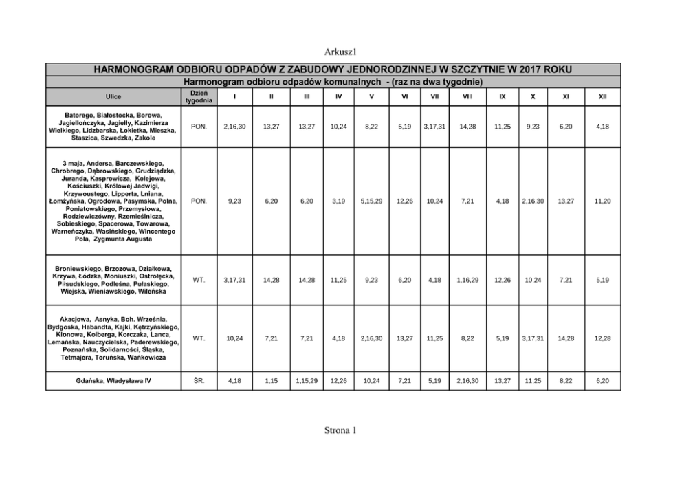 Arkusz1 Strona 1 HARMONOGRAM ODBIORU ODPADÓW Z