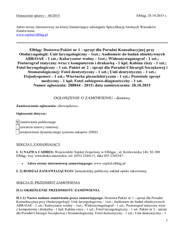 Oznaczenie sprawy – 40/2015 Elbląg, 28.10.2015 r. Adres strony internetowej, na której Zamawiający udostępnia Specyfikację Istotnych Warunków Zamówienia: www.szpital.elblag.pl Elbląg: Dostawa:Pakiet nr 1 - sprzęt dla Poradni Konsultacyjnej przy Otolaryngologii: Unit laryngologiczny - 1szt.; Audiometr do badań obiektywnych ABR/OAE - 1 szt.; Kaloryzator wodny - 1szt.; Wideonystagmograf - 1 szt.; Posturograf statyczny wraz z komputerem i drukarką - 1 kpl; Kabina ciszy - 1 szt.; Fotel laryngologiczny - 1 szt. Pakiet nr 2 - sprzęt dla Poradni Chirurgii Szczękowej i Stomatologicznej: Fotel dentystyczny - 1 szt.; Unit dentystyczny - 1 szt.; Fizjodyspenser - 1 szt.; Wiertarka piezoelektryczna - 1 szt.; Pozostały sprzęt medyczny - 1 kpl; Fotel zabiegowo-diagnostyczny - 1 szt. Numer ogłoszenia: 288844 - 2015; data zamieszczenia: 28.10.2015 OGŁOSZENIE O ZAMÓWIENIU - dostawy Zamieszczanie ogłoszenia: obowiązkowe. Ogłoszenie dotyczy: V zamówienia publicznego zawarcia umowy ramowej ustanowienia dynamicznego systemu zakupów (DSZ) SEKCJA I: ZAMAWIAJĄCY I. 1) NAZWA I ADRES: Wojewódzki Szpital Zespolony w Elblągu , ul. Królewiecka 146, 82-300 Elbląg, woj. warmińsko-mazurskie, tel. (055) 2344111, faks 055 2345547. Adres strony internetowej zamawiającego: www.szpital.elblag.pl I. 2) RODZAJ ZAMAWIAJĄCEGO: Samodzielny publiczny zakład opieki zdrowotnej. SEKCJA II: PRZEDMIOT ZAMÓWIENIA II.1) OKREŚLENIE PRZEDMIOTU ZAMÓWIENIA II.1.1) Nazwa nadana zamówieniu przez zamawiającego: Dostawa:Pakiet nr 1 - sprzęt dla Poradni Konsultacyjnej przy Otolaryngologii: Unit laryngologiczny - 1szt.; Audiometr do badań obiektywnych ABR/OAE - 1 szt.; Kaloryzator wodny - 1szt.; Wideonystagmograf - 1 szt.; Posturograf statyczny wraz z komputerem i drukarką - 1 kpl; Kabina ciszy - 1 szt.; Fotel laryngologiczny - 1 szt. Pakiet nr 2 - sprzęt dla Poradni Chirurgii Szczękowej i Stomatologicznej: Fotel dentystyczny - 1 szt.; Unit dentystyczny - 1 1 szt.; Fizjodyspenser - 1 szt.; Wiertarka piezoelektryczna - 1 szt.; Pozostały sprzęt medyczny - 1 kpl; Fotel zabiegowo-diagnostyczny - 1 szt.. II.1.2) Rodzaj zamówienia: dostawy. II.1.4) Określenie przedmiotu oraz wielkości lub zakresu zamówienia: Dostawa: Pakiet nr 1 - sprzęt dla Poradni Konsultacyjnej przy Otolaryngologii: Unit laryngologiczny - 1szt.; Audiometr do badań obiektywnych ABR/OAE - 1 szt.; Kaloryzator wodny - 1szt.; Wideonystagmograf - 1 szt.; Posturograf statyczny wraz z komputerem i drukarką - 1 kpl; Kabina ciszy - 1 szt.; Fotel laryngologiczny - 1 szt. Pakiet nr 2 - sprzęt dla Poradni Chirurgii Szczękowej i Stomatologicznej: Fotel dentystyczny - 1 szt.; Unit dentystyczny - 1 szt.; Fizjodyspenser - 1 szt.; Wiertarka piezoelektryczna - 1 szt.; Pozostały sprzęt medyczny - 1 kpl; Fotel zabiegowo-diagnostyczny - 1 szt.. II.1.5) przewiduje się udzielenie zamówień uzupełniających Określenie przedmiotu oraz wielkości lub zakresu zamówień uzupełniających II.1.6) Wspólny Słownik Zamówień (CPV): 33.10.00.00-1, 33.12.60.00-9, 33.13.11.00-8. II.1.7) Czy dopuszcza się złożenie oferty częściowej: tak, liczba części: 2. II.1.8) Czy dopuszcza się złożenie oferty wariantowej: nie. II.2) CZAS TRWANIA ZAMÓWIENIA LUB TERMIN WYKONANIA: Okres w dniach: 63. SEKCJA III: INFORMACJE O CHARAKTERZE PRAWNYM, EKONOMICZNYM, FINANSOWYM I TECHNICZNYM III.2) ZALICZKI III.3) WARUNKI UDZIAŁU W POSTĘPOWANIU ORAZ OPIS SPOSOBU DOKONYWANIA OCENY SPEŁNIANIA TYCH WARUNKÓW III. 3.1) Uprawnienia do wykonywania określonej działalności lub czynności, jeżeli przepisy prawa nakładają obowiązek ich posiadania Opis sposobu dokonywania oceny spełniania tego warunku W celu potwierdzenia, warunku udziału Wykonawca załączy do oferty - Oryginał oświadczenia o spełnieniu warunków udziału w postępowaniu zgodnie z art. 22 ust. 1 Ustawy Prawo zamówień publicznych - wzór stanowi Załącznik nr 4 do SIWZ. III.3.2) Wiedza i doświadczenie o Opis sposobu dokonywania oceny spełniania tego warunku o W celu potwierdzenia, warunku udziału Wykonawca załączy do oferty - Oryginał oświadczenia o spełnieniu warunków udziału w postępowaniu zgodnie z art. 22 ust. 1 Ustawy Prawo zamówień publicznych - wzór stanowi Załącznik nr 4 do SIWZ. 2 III.3.3) Potencjał techniczny Opis sposobu dokonywania oceny spełniania tego warunku W celu potwierdzenia, warunku udziału Wykonawca załączy do oferty - Oryginał oświadczenia o spełnieniu warunków udziału w postępowaniu zgodnie z art. 22 ust. 1 Ustawy Prawo zamówień publicznych - wzór stanowi Załącznik nr 4 do SIWZ. III.3.4) Osoby zdolne do wykonania zamówienia o Opis sposobu dokonywania oceny spełniania tego warunku W celu potwierdzenia, warunku udziału Wykonawca załączy do oferty - Oryginał oświadczenia o spełnieniu warunków udziału w postępowaniu zgodnie z art. 22 ust. 1 Ustawy Prawo zamówień publicznych - wzór stanowi Załącznik nr 4 do SIWZ. III.3.5) Sytuacja ekonomiczna i finansowa o Opis sposobu dokonywania oceny spełniania tego warunku o W celu potwierdzenia, warunku udziału Wykonawca załączy do oferty - Oryginał oświadczenia o spełnieniu warunków udziału w postępowaniu zgodnie z art. 22 ust. 1 Ustawy Prawo zamówień publicznych - wzór stanowi Załącznik nr 4 do SIWZ. III.4) INFORMACJA O OŚWIADCZENIACH LUB DOKUMENTACH, JAKIE MAJĄ DOSTARCZYĆ WYKONAWCY W CELU POTWIERDZENIA SPEŁNIANIA WARUNKÓW UDZIAŁU W POSTĘPOWANIU ORAZ NIEPODLEGANIA WYKLUCZENIU NA PODSTAWIE ART. 24 UST. 1 USTAWY III.4.1) W zakresie wykazania spełniania przez wykonawcę warunków, o których mowa w art. 22 ust. 1 ustawy, oprócz oświadczenia o spełnianiu warunków udziału w postępowaniu należy przedłożyć: III.4.2) W zakresie potwierdzenia niepodlegania wykluczeniu na podstawie art. 24 ust. 1 ustawy, należy przedłożyć: oświadczenie o braku podstaw do wykluczenia; aktualny odpis z właściwego rejestru lub z centralnej ewidencji i informacji o działalności go
