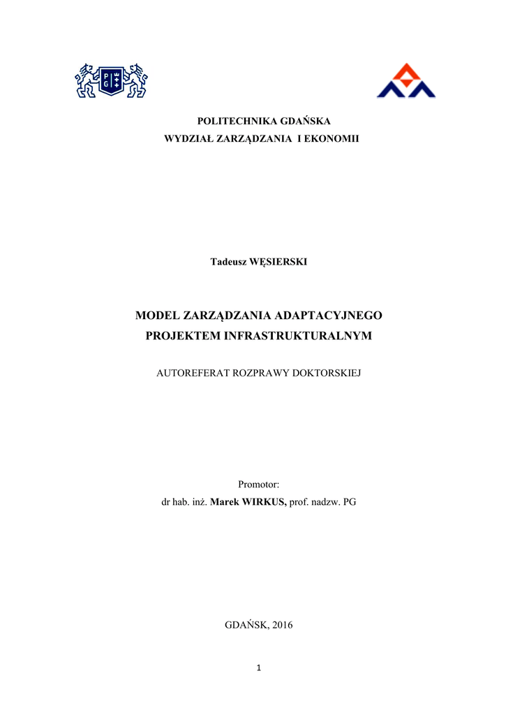 POLITECHNIKA GDAŃSKA WYDZIAŁ ZARZĄDZANIA I EKONOMII Tadeusz WĘSIERSKI MODEL ZARZĄDZANIA ADAPTACYJNEGO PROJEKTEM INFRASTRUKTURALNYM AUTOREFERAT ROZPRAWY DOKTORSKIEJ Promotor: dr hab. inż. Marek WIRKUS, prof. nadzw. PG GDAŃSK, 2016 1 Spis treści Wstęp 2 1. Rozpoznanie teoretyczno – metodologicznych podstaw badań własnych 4 2. Rozpoznanie zakresu unormowania zachowań w sytuacjach projektowych przez zasady zarządzania projektem infrastrukturalnym 10 3. Sformułowanie założeń do modelowania i opracowanie koncepcji modelu ZAPI 14 4. Weryfikacja koncepcji modelu ZAPI 20 5. Konstrukcja modelu odwzorowującego najistotniejsze cechy ZAPI 23 6. Zastosowanie modelu ZAPI w badaniach projektów infrastrukturalnych 26 7. Podsumowanie. Weryfikacja hipotez badawczych i wnioski 28 Definicje 31 Spis treści w rozprawie doktorskiej 32 2 Wstęp Praca doktorska pt. „Model zarządzania adaptacyjnego projektem infrastrukturalnym” dotyka problematyki zwinności, która od blisko dwu dekad nurtuje obszar zarządzania projektem. Zwinność w ujęciu prakseologicznym to zdolność do poruszania się dokładnie z powziętym zamiarem. Zwinność na poziomie ekstremalnym jest tożsama z podejściem sytuacyjnym, które zakłada adekwatność zachowań do bieżących warunków zarządzania. Postępowanie dokładnie z zamiarem w turbulentnym środowisku projektowym jest wyzwaniem dla ludzi w projekcie ze względu na zdolności adaptacji, które muszą być wystarczające, by poradzić sobie z różnorodnością sytuacji wyborów. Zjawisko „niedokładności w projektowaniu przedsięwzięć infrastrukturalnych” zostało naukowo rozpoznane1 (B. Flyvbjerg, M. Holm, S. Buhl, 2002, 2005) i powiązane ze zjawiskiem „złudzenia planowania” (D. Kahneman, A. Tversky, 1977). Wyniki badań unaoczniły jego skalę. Zachowania, których wynikiem są nierealistyczne plany i prognozy mają miejsce w 90% projektów infrastrukturalnych. Pokazuje to, w jak trudnej sytuacji znajdują się ludzie występujący w tych projektach w rolach wymagających predykcji. Wychodząc z założenia, że problematyka zarządzania projektem infrastrukturalnym jest ważna dla funkcjonowania społeczeństwa i gospodarki w rozprawie poddano analizie i ocenie różne koncepcje złożoności środowiska projektowego, modele cyklu zarządzania projektem oraz zasady zarządzania projektem. Zebrane w ten sposób wnioski wskazały podstawy, na których należało oprzeć konstrukcję usprawniającą zarządzanie projektem infrastrukturalnym. Uwzględnienie w niej procesów umożliwiających zastosowanie narzędzia (technologii) informacyjnego modelowania budowy (ang. Building Information Modeling, BIM) może prowadzić do ograniczenia wpływu zjawiska „niedokładności projektowania”. Narzędzie BIM daje możliwość szybkiego poznania skutków ilościowych wprowadzanych zmian jakościowych w projekcie zanim one realnie wystąpią i może być stosowane w sytuacjach wyborów w całym cyklu rozwojowym inwestycji. Zarządzanie adaptacyjne wykorzystuje zwinne zachowania do wprowadzenia zmiany adaptacyjnej (modyfikacji) w środowisku projektowym w celu zachowania ciągłości Badania statystyczne przeprowadzone na próbach: 258 projektów infrastrukturalnych o łącznej wartości 90 mld $, zrealizowanych w 20 krajach, na pięciu kontynentach (2002) oraz 210 projektów infrastruktury transportowej o łącznej wartości 59 mld $, zrealizowanych w 14 krajach (2005). 1 3 procesu inwestycyjnego. Z prakseologicznego punktu widzenia zmiany adaptacyjne są najbardziej racjonalne oraz najlepiej dostosowują projekt do sytuacji. W tym kontekście należy widzieć problem badawczy, który ujęto w formie pytania: czy organiczna całość zarządzania adaptacyjnego projektem infrastrukturalnym ma w zarządzaniu projektem swój model, który byłby pomocny w standaryzowaniu zachowań projektowych adekwatnie do dynamicznej złożoności sytuacji biznesowych, administracyjno - technicznych i wykonawstwa? Celem pracy badawczej o charakterze jakościowym było opracowanie modelu zarządzania adaptacyjnego projektem infrastrukturalnym w warunkach podejścia sytuacyjnego, który spełniać będzie funkcje użyteczne ze względu na przeznaczenie dla praktyki menedżerskiej. Osiągnięcie tego celu wymagało sformułowania wstępnej syntezy charakteryzującej podejście sytuacyjne w zarządzaniu projektem, opracowania metodyki badań sytuacji projektowych oraz zweryfikowania w postępowaniu badawczym trzech hipotez niekierunkowych: 1) H1: pomimo różnorodności projektów infrastrukturalnych możliwe jest wskazanie zawsze do siebie podobnych zachowań projektowych adekwatnych do dynamicznej złożoności konkretnych sytuacji projektowych, 2) H2: zarządzanie adaptacyjne projektem infrastrukturalnym realizuje się przez zmiany adaptacyjne środowiska projektowego, 3) H3: odwzorowanie zarządzania adaptacyjnego projektem infrastrukturalnym spełnia funkcje użyteczne ze względu na praktykę menedżerską. Przedmiotem badań były sytuacje zarządzania projektem infrastrukturalnym. Podmiotem badań były organizacje realizujące duże projekty infrastrukturalne na terenie województwa pomorskiego i dla porównania na Słowacji. Charakterystyka etapów badań zajmuje w niniejszym autoreferacie najwięcej miejsca. Wyeksponowano w niej elementy, które mogą uzasadniać postępowanie badawcze oraz bronić osiągnięte w nim rezultaty. 4 1. Rozpoznanie teoretyczno – metodologicznych podstaw badań własnych Motywy, którymi się kierowano rozpoznając teoretyczne podstawy badań własnych wiązały się z potrzebą dostosowania siatki pojęciowej do współczesnej fazy rozwoju zarządzania projektem. Zbudowano ją na przesłance podejścia sytuacyjnego: sprawność zarządzania projektem zależy od sytuacji projektowych, powziętego zamiaru oraz zdolności do zachowań niezbędnych do ich rozwiązania. Siatkę pokazano na rys. 1. Rys. 1. Siatka pojęciowa zwi