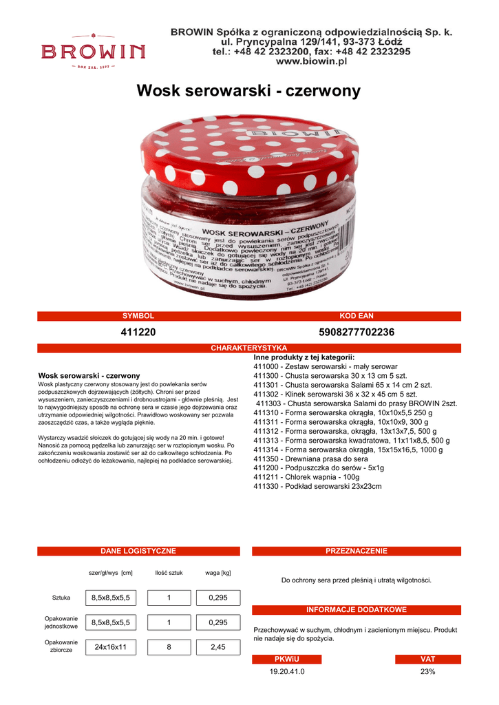 Wosk serowarski - czerwony SYMBOL KOD EAN 411220 5908277702236 CHARAKTERYSTYKA Inne produkty z tej kategorii: 411000 - Zestaw serowarski - mały serowar 411300 - Chusta serowarska 30 x 13 cm 5 szt. Wosk serowarski - czerwony Wosk plastyczny czerwony stosowany jest do powlekania serów 411301 - Chusta serowarska Salami 65 x 14 cm 2 szt. podpuszczkowych dojrzewających (żółtych). Chroni ser przed 411302 - Klinek serowarski 36 x 32 x 45 cm 5 szt. wysuszeniem, zanieczyszczeniami i drobnoustrojami - głównie pleśnią. Jest 411303 - Chusta serowarska Salami do prasy BROWIN 2szt. to najwygodniejszy sposób na ochronę sera w czasie jego dojrzewania oraz 411310 - Forma serowarska okrągła, 10x10x5,5 250 g utrzymanie odpowiedniej wilgotności. Prawidłowo woskowany ser pozwala 411311 - Forma serowarska okrągła, 10x10x9, 300 g zaoszczędzić czas, a także wygląda pięknie. 411312 - Forma serowarska, okrągła, 13x13x7,5, 500 g Wystarczy wsadzić słoiczek do gotującej się wody na 20 min. i gotowe! 411313 - Forma serowarska kwadratowa, 11x11x8,5, 500 g Nanosić za pomocą pędzelka lub zanurzając ser w roztopionym wosku. Po 411314 - Forma serowarska okrągła, 15x15x16,5, 1000 g zakończeniu woskowania zostawić ser aż do całkowitego schłodzenia. Po 411350 - Drewniana prasa do sera ochłodzeniu odłożyć do leżakowania, najlepiej na podkładce serowarskiej. 411200 - Podpuszczka do serów - 5x1g 411211 - Chlorek wapnia - 100g 411330 - Podkład serowarski 23x23cm DANE LOGISTYCZNE szer/gł/wys [cm] Ilość sztuk PRZEZNACZENIE waga [kg] Do ochrony sera przed pleśnią i utratą wilgotności. Sztuka 8,5x8,5x5,5 1 0,295 INFORMACJE DODATKOWE Opakowanie jednostkowe 8,5x8,5x5,5 1 0,295 Opakowanie zbiorcze 24x16x11 8 2,45 Przechowywać w suchym, chłodnym i zacienionym miejscu. Produkt nie nadaje się do spożycia. PKWiU VAT 19.20.41.0 23%