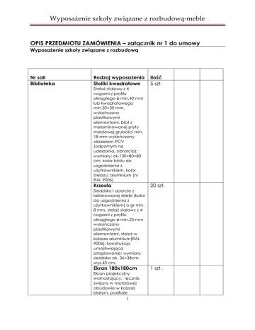 Wyposażenie szkoły związane z rozbudową-meble OPIS PRZEDMIOTU ZAMÓWIENIA – załącznik nr 1 do umowy WyposaŜenie szkoły związane z rozbudową Nr sali Biblioteka Rodzaj wyposaŜenia Stoliki kwadratowe Ilość 5 szt. StelaŜ stalowy z 4 nogami z profilu okrągłego ǿ min.40 mm lub kwadratowego min.30×30 mm, wykończony plastikowymi elementami, blat z melaminowanej płyty meblowej grubości min. 18 mm wykończony obrzeŜem PCV (odpornym na uderzania, obtarcia); wymiary: ok.130×80×80 cm, kolor blatu do uzgodnienia z uŜytkownikiem, kolor stelaŜu; aluminium (nr RAL 9006) Krzesła 20 szt. Siedzisko i oparcie z lakierowanej sklejki (kolor do uzgodnienia z uŜytkownikiem) o gr min. 8 mm, stelaŜ stalowy z 4 nogami z profilu okrągłego ǿ min.25 mm wykończony plastikowymi elementami, stelaŜ w kolorze aluminium(RAL 9006); konstrukcja umoŜliwiająca sztaplowanie; wymiary: siedzisko ok. 36×38cm, wys.43 cm. Ekran 180x180cm Ekran projekcyjny wolnostojący, ręcznie zwijany w metalowej obudowie w kolorze białym, podłoŜe 1 1 szt. Wyposażenie szkoły związane z rozbudową-meble projekcyjne Matt WhiteE Tablice korkowe 2 szt. w ramie drewnianej o wym. ok.100x150×2cm Pufy do siedzenia 4 szt. Obicie z tkaniny łatwej do utrzymania w czystości (bez dodatku ftalanów), pufa wypełniona granulatem, dopasowująca się do kształtu osoby siedzącej; ǿ ok.100cm, waga ok.4kg, kolor do uzgodnienia z uŜytkownikiem. W standardzie siedziska typu gruszka mała firmy insGraf Regał do ekspozycji czasopism 1 szt. StelaŜ stalowy z profilu okrąglego lub stalowego w kolorze aluminium, z pólkami z lakierowanej sklejki, regulowana wysokość półek, min. ObciąŜenie Pólki-70 kg, brak ostrych krawędzi, półki skośne zakończone ogranicznikiem; wym. ok.190×30×135 cm. Kolor do uzgodnienia z uzytkownikem Biurko z szufladami Wykonane z melaminowanej płyty meblowej grubości min. 18mm, stelaŜ i nogi z rury stalowej o przekroju okrągłym lub prostokątnym; blat grubości min.25mm, pod blatem z jednej strony kontener z szafką , wszystkie krawędzie blatu zabezpieczone przed uszkodzeniami spowodowanymi 2 1 szt. Wyposażenie szkoły związane z rozbudową-meble uderzeniami, obtarciami itd.; biurko od frontu zabezpieczone stalowa blend, szuflady zamykane na klucz, otwór na okablowanie; wym. blatu:ok. 116×76cm; wym. kontenera:38×56×46cm; kolor płyty meblowej do uzgodnienia z uŜytkownikiem; kolor stelaŜu: aluminium Fotel do biurka 1 szt. Fotel obrotowy kubełkowy z podłokietnikami, tapicerowany skórą dwoinową, lub sztucznym tworzywem latwym do utrzymania w czystości; kolor obicia do uzgodnienia z uŜytkownikiem. Mechanizm umoŜliwiający blokadę fotela w pozycji do pracy, kąt nachylenia oparcia oraz regulację wysokości siedziska. Wym. ok. siedzisko szer.45cm,głęb. 40-53cm wys. 39-51cm Biurka komputerowe Wykonane z me laminowanej płyty meblowej gr. Min.18mm, blat gr.min.25mm z wysuwana szuflada na klawiaturę; pod blatem z jednej strony półka na komputer, wszystkie krawędzie blatu odporne na uszkodzenia spowodowane uderzeniami, obtarciami itd.;wym. blatu;ok.58×76cm;kolor płyty meblowej do uzgodnienia z uŜytkownikiem; stelaŜ stalowy, nogi z profilu 3 4 szt. Wyposażenie szkoły związane z rozbudową-meble 30×30mm, kolor stelaŜu: aluminium Krzesła do stolików komputerowych 4 szt. Krzesła obrotowe, tapicerowane siedzisko i oparcie tkaniną o wysokiej wytrzymałości na ścieranie, łatwej w czyszczeniu; regulowana wysokość, bez podłokietników, nogi wykończone kółkami; wym.(szer.siedziska) dopasowane do biurek; kolorystyka do uzgodnienia z uzytkownikiem Półka ekspozycyjna 1 szt. Wykonany z płyty laminowanej, z pólkami do ekspozycji ksiąŜek i czasopism, wym. ok. 180×86×37cm, kolor do uzgodnienia z uzytkownikiem Szafa zamykana Wykonana ma laminowanej płyty meblowej gr. Min.18mm, w dolnej części szafy szuflady lub szuflady + otwarte półki, szuflady zamykane na klucz; w górnej części szafy szafki z drzwiczkami zamykanymi na klucz lub szafki z drzwiczkami+otwarte półki : skrzydla drzwiowe pelne w jednolitej tonacji kolorystycznej; ściana tylna płyta hdf3 mm; uchwyty nierdzewne stalowe; cokoły pełne z płyty meblowej; wymiary szafy ok.80×40×200cm. Układ półek, szafek, szuflad oraz kolorystyka do uzgodnienia z 4 1 szt. Wyposażenie szkoły związane z rozbudową-meble uŜytkownikiem. Szafa z witryną Sala konferencyjna 1 szt. Wykonana ma laminowanej płyty meblowej gr. min.18mm, w dolnej części szafy szuflady lub szuflady + otwarte półki lub szafka z pólkami; szuflady, szafki zamykane na klucz; w górnej części szafy dwuskrzydłowe przeszklone drzwiczki z półkami wewnątrz, zamykane na klucz; skrzydła drzwiowe dolne pełne w jednolitej tonacji kolorystycznej; ściana tylna płyta hdf3 mm; uchwyty nierdzewne stalowe; cokoły pełne z płyty meblowej; wymiary szafy ok.80×40×200cm. Układ półek, szafek, szuflad oraz kolorystyka do uzgodnienia z uŜytkownikiem. Regały biblioteczne 45 szt. ze stelaŜem metalowym 209x85x35cm Rama metalowa z rury okrągłej fi 32, półki laminowane, zawieszone na ramach za pomocą haczyków Jednostronne- 13szt Dwustronne-16szt Łącznie: Ekran ścienny manualny 200x250cm Ekran projekcyjny ręcznie zwijany w metalowej obudowie w kolorze białym, mechanizm zwijający z napędem spręŜynowym; podłoŜe projekcyjne Matt White E 5 1 szt. Wyposażenie szkoły związane z rozbudową-meble Stoły konferencyjne ( 6 osobowe) 6 szt. Wykonane z płyty meblowej melaminowanej gr 25mmwykończony obrzeŜem PCV(odpornym na uderzenia,obtarcia); stelaŜ metalowy lakierowany proszkowo na kolor aluminium (RAL9006), nogi okrągłe Ø35mm, wym.ok.180×80×76cm; kolor do uzgodnienia z uŜytkownikiem Dostawka ½ koła do stołu konferencyjnego z nogą-1szt Łącznik ¼ koła do stołu konferencyjnego z nogą-1szt Krzesła konferencyjne 40 szt. StelaŜ krzesła wykonany z rury okrągłej w kolorze srebrnym wykończone plastik