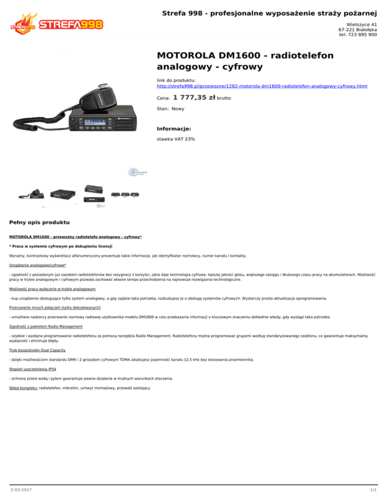Strefa 998 - profesjonalne wyposażenie straży pożarnej Wietszyce 41 67-221 Białołęka tel: 723 895 900 MOTOROLA DM1600 - radiotelefon analogowy - cyfrowy link do produktu: http://strefa998.pl/przewozne/1282-motorola-dm1600-radiotelefon-analogowy-cyfrowy.html Cena: 1 777,35 zł brutto Stan: Nowy Informacje: stawka VAT 23% Pełny opis produktu MOTOROLA DM1600 - przewoźny radiotelefo analogowy - cyfrowy* * Praca w systemie cyfrowym po dokupieniu licencji Wyraźny, kontrastowy wyświetlacz alfanumeryczny prezentuje takie informacje, jak identyfikator rozmówcy, numer kanału i kontakty. Urządzenie analogowe/cyfrowe* - zgodność z posiadanym już zasobem radiotelefonów bez rezygnacji z korzyści, jakie daje technologia cyfrowa: lepszej jakości głosu, większego zasięgu i dłuższego czasu pracy na akumulatorach. Możliwość pracy w trybie analogowym i cyfrowym pozwala zachować własne tempo przechodzenia na najnowsze rozwiązania technologiczne. Możliwość pracy wyłącznie w trybie analogowym - kup urządzenie obsługujące tylko system analogowy, a gdy zajdzie taka potrzeba, rozbudujesz je o obsługę systemów cyfrowych. Wystarczy prosta aktualizacja oprogramowania. Przerywanie innych połączeń (tylko dekodowanych) - umożliwia nadzorcy przerwanie rozmowy radiowej użytkownika modelu DM1600 w celu przekazania informacji o kluczowym znaczeniu dokładnie wtedy, gdy wystąpi taka potrzeba. Zgodność z pakietem Radio Management - szybkie i wydajne programowanie radiotelefonu za pomocą narzędzia Radio Management. Radiotelefony można programować grupami według standaryzowanego szablonu, co gwarantuje maksymalną wydajność i eliminuje błędy. Tryb bezpośredni Dual Capacity - dzięki możliwościom standardu DMR i 2 gniazdom cyfrowym TDMA zdublujesz pojemność kanału 12,5 kHz bez stosowania przemiennika. Stopień uszczelnienia IP54 - ochrona przed wodą i pyłem gwarantuje pewne działanie w trudnych warunkach otoczenia. Skład kompletu: radiotelefon, mikrofon, uchwyt montażowy, przewód zasilający 2-03-2017 1/1