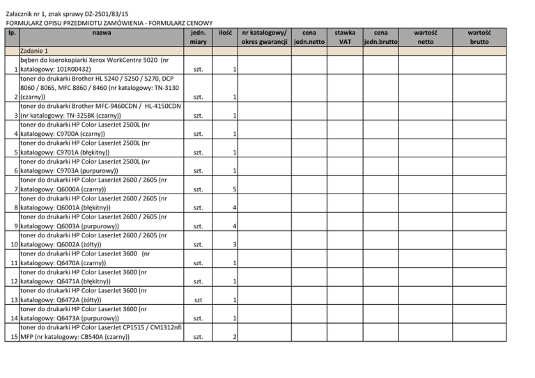 Załacznik nr 1, znak sprawy DZ-2501/83/15 FORMULARZ OPISU PRZEDMIOTU ZAMÓWIENIA - FORMULARZ CENOWY lp. nazwa jedn. ilość nr katalogowy/ cena miary okres gwarancji jedn.netto Zadanie 1 bęben do kserokopiarki Xerox WorkCentre 5020 (nr szt. 1 1 katalogowy: 101R00432) toner do drukarki Brother HL 5240 / 5250 / 5270, DCP 8060 / 8065, MFC 8860 / 8460 (nr katalogowy: TN-3130 szt. 1 2 (czarny)) toner do drukarki Brother MFC-9460CDN / HL-4150CDN szt. 1 3 (nr katalogowy: TN-325BK (czarny)) toner do drukarki HP Color LaserJet 2500L (nr szt. 1 4 katalogowy: C9700A (czarny)) toner do drukarki HP Color LaserJet 2500L (nr szt. 1 5 katalogowy: C9701A (błękitny)) toner do drukarki HP Color LaserJet 2500L (nr szt. 1 6 katalogowy: C9703A (purpurowy)) toner do drukarki HP Color LaserJet 2600 / 2605 (nr szt. 5 7 katalogowy: Q6000A (czarny)) toner do drukarki HP Color LaserJet 2600 / 2605 (nr szt. 4 8 katalogowy: Q6001A (błękitny)) toner do drukarki HP Color LaserJet 2600 / 2605 (nr szt. 4 9 katalogowy: Q6003A (purpurowy)) toner do drukarki HP Color LaserJet 2600 / 2605 (nr szt. 3 10 katalogowy: Q6002A (żółty)) toner do drukarki HP Color LaserJet 3600 (nr szt. 1 11 katalogowy: Q6470A (czarny)) toner do drukarki HP Color LaserJet 3600 (nr szt. 1 12 katalogowy: Q6471A (błękitny)) toner do drukarki HP Color LaserJet 3600 (nr szt 1 13 katalogowy: Q6472A (żółty)) toner do drukarki HP Color LaserJet 3600 (nr szt. 1 14 katalogowy: Q6473A (purpurowy)) toner do drukarki HP Color LaserJet CP1515 / CM1312nfi szt. 2 15 MFP (nr katalogowy: CB540A (czarny)) stawka VAT cena jedn.brutto wartość netto wartość brutto toner do drukarki HP Color LaserJet CP1515 / CM1312nfi 16 MFP (nr katalogowy: CB541A (błękitny)) toner do drukarki HP Color LaserJet CP1515 / CM1312nfi 17 MFP (nr katalogowy: CB542A (żółty)) szt. 2 szt. 2 toner do drukarki HP Color LaserJet CP1515 / CM1312nfi 18 MFP (nr katalogowy: CB543A (purpurowy)) szt. 2 toner do drukarki HP Color LaserJet CP2025N / 19 CM2320fxi MFP (nr katalogowy: CC531A (błękitny)) szt. 1 szt. 1 szt. 1 szt. 2 szt. 1 szt. 1 szt. 1 szt. 2 szt. 4 szt. 3 szt. 6 szt. 1 szt. 1 20 21 22 23 24 25 26 27 28 29 30 31 toner do drukarki HP Color LaserJet CP2025N / CM2320fxi MFP (nr katalogowy: HP CC532A (żółty)) toner do drukarki HP Color LaserJet CP2025N / CM2320fxi MFP (nr katalogowy: HP CC533A (purpurowy)) toner do drukarki HP Color LaserJet CP2025N / CM2320fxi MFP (nr katalogowy: CC530A (czarny)) toner do drukarki HP Color LaserJet CP3525 (nr katalogowy: CE252A (żółty)) toner do drukarki HP Color LaserJet CP3525 (nr katalogowy: CE250X (czarny)) toner do drukarki HP Color LaserJet CP3525 (nr katalogowy: CE253A (purpurowy)) toner do drukarki HP LaserJet 1000 / 1005 (nr katalogowy: C7115A (czarny)) toner do drukarki HP LaserJet 1015 / 1018 / 1020 (nr katalogowy: Q2612A (czarny)) toner do drukarki HP LaserJet 1200 (nr katalogowy: C7115X (czarny)) toner do drukarki HP LaserJet 1320 (nr katalogowy: Q5949X (czarny)) toner do drukarki HP LaserJet 1606 (nr katalogowy: CE278A (czarny)) toner do drukarki HP LaserJet 2300 (nr katalogowy: Q2610A (czarny)) 32 33 34 35 36 37 38 39 40 41 toner do drukarki HP LaserJet 5 / 5M (nr katalogowy: 92298X (czarny)) toner do drukarki HP LaserJet 5200n (nr katalogowy: Q7516A (czarny)) toner do drukarki HP LaserJet P1005 / P1006 (nr katalogowy: CB435A (czarny)) toner do drukarki HP LaserJet P2014 / P2015 (nr katalogowy: Q7553X (czarny)) toner do drukarki HP LaserJet P2035 (nr katalogowy: CE505A (czarny)) toner do drukarki HP LaserJet P2055 (nr katalogowy: CE505X (czarny)) toner do drukarki Lexmark C770 (nr katalogowy: C7700KH (czarny)) toner do kserokopiarki Canon iR-1133A (nr katalogowy: C-EXV40 (czarny)) toner do kserokopiarki Xerox WorkCentre 5016 / 5020 (nr katalogowy: 106R01277) toner do kserokopiarki Xerox WorkCentre M118 (nr katalogowy: 006R01179) szt. 1 szt. 1 szt. 2 szt. 7 szt 1 szt. 2 szt. 2 szt. 1 szt. 4 szt. 1 RAZEM: