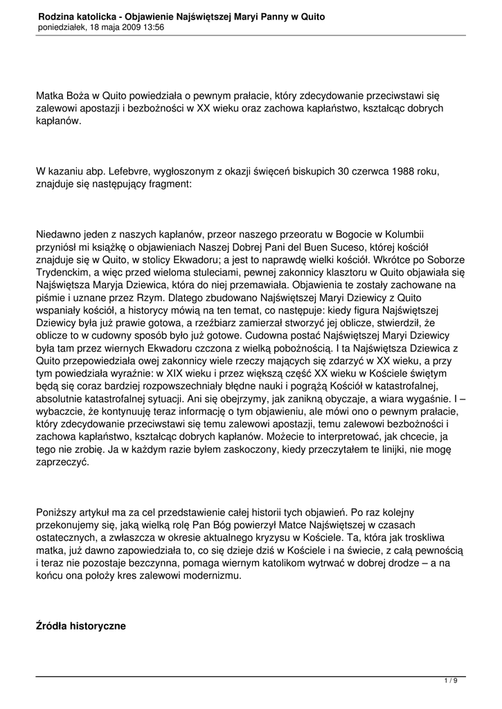 Rodzina katolicka - Objawienie Najświętszej Maryi Panny w Quito poniedziałek, 18 maja 2009 13:56 Matka Boża w Quito powiedziała o pewnym prałacie, który zdecydowanie przeciwstawi się zalewowi apostazji i bezbożności w XX wieku oraz zachowa kapłaństwo, kształcąc dobrych kapłanów. W kazaniu abp. Lefebvre, wygłoszonym z okazji święceń biskupich 30 czerwca 1988 roku, znajduje się następujący fragment: Niedawno jeden z naszych kapłanów, przeor naszego przeoratu w Bogocie w Kolumbii przyniósł mi książkę o objawieniach Naszej Dobrej Pani del Buen Suceso, której kościół znajduje się w Quito, w stolicy Ekwadoru; a jest to naprawdę wielki kościół. Wkrótce po Soborze Trydenckim, a więc przed wieloma stuleciami, pewnej zakonnicy klasztoru w Quito objawiała się Najświętsza Maryja Dziewica, która do niej przemawiała. Objawienia te zostały zachowane na piśmie i uznane przez Rzym. Dlatego zbudowano Najświętszej Maryi Dziewicy z Quito wspaniały kościół, a historycy mówią na ten temat, co następuje: kiedy figura Najświętszej Dziewicy była już prawie gotowa, a rzeźbiarz zamierzał stworzyć jej oblicze, stwierdził, że oblicze to w cudowny sposób było już gotowe. Cudowna postać Najświętszej Maryi Dziewicy była tam przez wiernych Ekwadoru czczona z wielką pobożnością. I ta Najświętsza Dziewica z Quito przepowiedziała owej zakonnicy wiele rzeczy mających się zdarzyć w XX wieku, a przy tym powiedziała wyraźnie: w XIX wieku i przez większą część XX wieku w Kościele świętym będą się coraz bardziej rozpowszechniały błędne nauki i pogrążą Kościół w katastrofalnej, absolutnie katastrofalnej sytuacji. Ani się obejrzymy, jak zanikną obyczaje, a wiara wygaśnie. I – wybaczcie, że kontynuuję teraz informację o tym objawieniu, ale mówi ono o pewnym prałacie, który zdecydowanie przeciwstawi się temu zalewowi apostazji, temu zalewowi bezbożności i zachowa kapłaństwo, kształcąc dobrych kapłanów. Możecie to interpretować, jak chcecie, ja tego nie zrobię. Ja w każdym razie byłem zaskoczony, kiedy przeczytałem te linijki, nie mogę zaprzeczyć. Poniższy artykuł ma za cel przedstawienie całej historii tych objawień. Po raz kolejny przekonujemy się, jaką wielką rolę Pan Bóg powierzył Matce Najświętszej w czasach ostatecznych, a zwłaszcza w okresie aktualnego kryzysu w Kościele. Ta, która jak troskliwa matka, już dawno zapowiedziała to, co się dzieje dziś w Kościele i na świecie, z całą pewnością i teraz nie pozostaje bezczynna, pomaga wiernym katolikom wytrwać w dobrej drodze – a na końcu ona położy kres zalewowi modernizmu. Źródła historyczne 1/9 Rodzina katolicka - Objawienie Najświętszej Maryi Panny w Quito poniedziałek, 18 maja 2009 13:56 Matka Najświętsza objawiła się kilkakrotnie przełożonej sióstr Niepokalanego Poczęcia w Quito (stolica Ekwadoru), M. Marianie Francisce de Jesús Torres y Berriochoa (1563–1635). źródła historyczne o tych objawieniach dotarły do nas w następujący sposób: z powodu tak niezwykłych wydarzeń kierownik duchowny oraz biskup Quito wymagali od niej w imię posłuszeństwa spisania autobiografii. Tekst ten został aprobowany przez biskupa Pedro de Oviedo, dziesiątego biskupa ordynariusza Quito. Po jej śmierci, kierownik duchowy i spowiednik o. Michael Romero OFM napisał jej biografię. Dokumenty te razem z życiorysami wszystkich innych sióstr założycielek klasztoru w Ekwadorze zachowane są w wielkim tomie pt. El Cuadernon. Na podstawie tego źródła o. Manueal Souza Pereira, prowincjał Ojców Franciszkanów w Quito, napisał w 1790 roku książkę pt. Cudowny żywot Matki Marianny de Jesús Torres, hiszpańskiej zakonnicy i jednej z założycielek Królewskiego Klasztoru Niepokalanego Poczęcia w mieście św. Franciszka de Quito. Dzieło to przetłumaczono na język angielski w 1988 roku przez Marian Therese Horvat, która wydała książkę na temat objawień Matki Bożej. Wizjonerka: Mariana de Jesús Torres Mariana Francisca urodziła się w Hiszpanii 1563 roku jako pierwsze dziecko gorliwej katolickiej rodziny. Z powodu jej głębokiej pobożności, została dopuszczona do I Komunii już 8 grudnia 1572, kiedy miała zaledwie 9 lat2. Podczas Komunii Mariana otrzymała łaskę powołania oraz wewnętrzną pewność, że będzie przeznaczona na misje. W 1577 roku opuściła Hiszpanię razem z ciotką, matką Marią de Jesús Taboada i czterema innymi zakonnicami, aby założyć klasztor w stolicy Ekwadoru. Rozpoczęła tam swe życie zakonne, które płynęło wedle ówczesnych zwyczajów w atmosferze surowych umartwień. Matki założycielki były zachwycone „doskonałym przestrzeganiem reguł zakonnych i praktyką cnót” młodej nowicjuszki, inne siostry jednak okazywały zazdrość, prześladowały ją i rozsiewały oszczerstwa. Dwukrotnie zmarła i powróciła do życia. Po śmierci pierwszej przełożonej w 1593 roku, została wybrana na przeoryszę. Było to w chwili, kiedy w Quito wybuchła rewolucja, której skutki miały dotknąć również zakony. Właśnie wówczas pewna zakonnica, zwana La Capitana, z pomocą niektórych duchownych zawiązała spisek przeciw przełożonej i razem z innymi siostrami domagała się złagodzenia reguły i zwolnienia od kierownictwa duchowego Ojców Franciszkanów, uważanych za bardzo gorliwych i surowych zakonników. 2/9 Rodzina katolicka - Objawienie Najświętszej Maryi Panny w Quito poniedziałek, 18 maja 2009 13:56 W tej trudnej sytuacji matka Mariana uciekła się do modlitwy. Wówczas Matka Boża ukazała się jej po raz pierwszy i powiedziała: „Jestem María del Buen Suceso, Królowa nieba i ziemi. Przyszłam, aby pocieszyć twoje udręczone serce! Szatan próbuje zniszczyć to Boże dzieło, posługując się Moimi niewiernymi córkami, lecz nie osiągnie celu, bo Ja jestem Królową zwycięstwa i Matką Dobrego Zdarzenia, i pod tym tytułem pragn