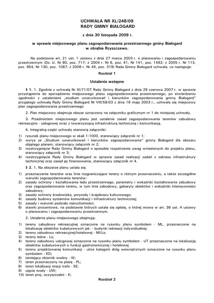 UCHWAŁA NR XL/248/09 RADY GMINY BIAŁOGARD z dnia 30 listopada 2009 r. w sprawie miejscowego planu zagospodarowania przestrzennego gminy Białogard w obrębie Rzyszczewo. Na podstawie art. 21 ust. 1 ustawy z dnia 27 marca 2003 r. o planowaniu i zagospodarowaniu przestrzennym (Dz. U. Nr 80, poz. 717; z 2004 r. Nr 6, poz. 41, Nr 141, poz. 1492; z 2005 r. Nr 113, poz. 954, Nr 130, poz. 1087; z 2006 r. Nr 45, poz. 319) Rada Gminy Białogard uchwala, co następuje: Rozdział 1 Ustalenia wstępne § 1. 1. Zgodnie z uchwałą Nr XI/71/07 Rady Gminy Białogard z dnia 29 czerwca 2007 r. w sprawie przystąpienia do sporządzenia miejscowego planu zagospodarowania przestrzennego, po stwierdzeniu zgodności z ustaleniami „studium uwarunkowań i kierunków zagospodarowania gminy Białogard” przyjętego uchwałą Rady Gminy Białogard Nr VIII/58/03 z dnia 16 maja 2003 r., uchwala się miejscowy plan zagospodarowania przestrzennego 2. Plan miejscowy obejmuje obszar oznaczony na załączniku graficznym nr 1 do niniejszej uchwały. 3. Przedmiotem miejscowego planu jest ustalenie zasad zagospodarowania terenów zabudowy rekreacyjno - usługowej wraz z towarzyszącą infrastrukturą techniczną i komunikacją. 4. Integralną część uchwały stanowią załączniki: 1) 2) 3) 4) rysunek planu miejscowego w skali 1:1000, stanowiący załącznik nr 1; wyrys ze „Studium uwarunkowań i kierunków zagospodarowania” gminy Białogard dla obszaru objętego planem, stanowiący załącznik nr 2; rozstrzygnięcie Rady Gminy Białogard o sposobie rozpatrzenia uwag wniesionych do projektu planu, stanowiący załącznik nr 3; rozstrzygnięcie Rady Gminy Białogard w sprawie zasad realizacji zadań z zakresu infrastruktury technicznej oraz zasad jej finansowania, stanowiący załącznik nr 4. § 2. 1. Na obszarze planu ustala się: 1) 2) 3) 4) 5) 6) przeznaczenie terenów oraz linie rozgraniczające tereny o różnym przeznaczeniu, a także szczególne warunki zagospodarowania terenów; zasady ochrony i kształtowania ładu przestrzennego, parametry i wskaźniki kształtowania zabudowy oraz zagospodarowania terenu, w tym linie zabudowy, gabaryty obiektów i wskaźniki intensywności zabudowy; zasady ochrony środowiska, przyrody i krajobrazu kulturowego; zasady budowy systemów komunikacji i infrastruktury technicznej; zasady i warunki podziału nieruchomości; stawki procentowe, na podstawie których ustala się opłatę, o której mowa w art. 36 ust. 4 ustawy o planowaniu i zagospodarowaniu przestrzennym. 2. Ustalenia planu miejscowego obejmują: 1) tereny zabudowy rekreacyjnej oznaczone na rysunku planu symbolem - ML, przeznaczone na lokalizację obiektów kubaturowych jak: - budynki rekreacji indywidualnej; 2) tereny zabudowy rekreacyjnej/hotelowej - Ml/Ls; 3) tereny leśne - Ls; 4) tereny zabudowy usługowej oznaczone na rysunku planu symbolem - UT przeznaczone na lokalizację obiektów kubaturowych o funkcji gastronomicznej i hotelowej 5) tereny projektowanej komunikacji - ulice kategorii dróg wewnętrznych oznaczone na rysunku planu symbolem - KD; 6) istniejący zbiornik wodny - W; 7) teren przeznaczony na plażę - PL; 8) teren lokalizacji stacji trafo - EE; 9) ujęcie wody - UW; 10) teren proj. oczyszczalni - K; Rozdział 2 Ustalenia ogólne § 3. Rygory dotyczące ochrony dziedzictwa kulturowego i zabytków: na terenie objętym planem miejscowym: nie występują zabytkowe układy urbanistyczne, obiekty zabytkowe i udokumentowane stanowiska archeologiczne. § 4. Rygory dotyczące środowiska przyrodniczego i krajobrazu kulturowego: 1) 2) 3) 4) teren objęty projektem planu znajduje się w strefie obszaru Natura 2000 oraz w strefie projektowanego Obszaru Chronionego Krajobrazu - Dolina Parsęty; na terenie objętym planem nie występują: – użytki ekologiczne istniejące i przewidziane do ochrony, – zespoły przyrodniczo-krajobrazowe, – pomniki przyrody; na terenie objętym planem wprowadza się całkowity zakaz: – używania silników spalinowych na jednostkach pływających – ruchu pojazdów spalinowych wzdłuż jeziora, – używania poza pomieszczeniami zamkniętymi megafonów, nagłaśniających urządzeń muzycznych i innych źródeł hałasu uciążliwych dla otoczenia w związku z położeniem terenu w obszarze strefy ochronnej „Natura 2000” - planowane przedsięwzięcie wymagać może przeprowadzenia postępowania w sprawie oceny oddziaływania na środowisko. Opracowane zostały wcześniej: – podstawowe opracowanie ekofizjograficzne dla potrzeb miejscowego planu zagospodarowania przestrzennego gminy Białogard-2008 r., – opracowanie waloryzacji przyrodniczej gminy opracowanej przez Biuro Konserwacji Przyrody ZUW w Szczecinie § 5. Zasady budowy systemów infrastruktury technicznej i komunikacji: 1) 2) 3) 4) 5) ustala się następujące zasady obsługi w zakresie komunikacji: – projektowane drogi kategorii gminnej KD o szer. 10 m w liniach rozgraniczających obsługują wszystkie projektowane działki, – przewidziano drogi piesze KP, – dopuszcza się lokalizację sieci infrastruktury technicznej w liniach rozgraniczających dróg; zasady dostarczenia wody dla projektowanej inwestycji z ujęcia własnego, a w perspektywie podłączenie do projektowanej sieci wodociągowej gminnej; ścieki komunalne - obsługiwana będzie przez lokalną oczyszczalnię a w perspektywie do sieci kanalizacji sanitarnej gminnej; system energetyczny - przyłączenia do istniejącej sieci rozdzielczej Koncernu Energetycznego ENERGA S.A. - Zakład Energetyczny Oddział Koszalin, zespołu zabudowy rekreacyjno usługowej w miejscowości Rzyszczewo zgodnie z warunkami, – przewidziano teren pod lokalizację stacji trafo EE; usuwanie i recykling odpadów komunalnych - odpady komunalne z terenu planowanej inwestycji wywożone będą do Zakładu Oczyszczania PGK Koszalin w gminie Sianów, gdzie następuje segregacja i proces przetwarzania odpadów, łącznie z odgazowaniem złoża (jak wszystkie odpady