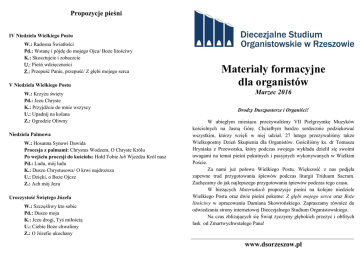 Propozycje pieśni IV Niedziela Wielkiego Postu W.: Radosna Światłości Pd.: Wstanę i pójdę do mojego Ojca/ Boże litościwy K.: Skosztujcie i zobaczcie U.: Pieśń wdzięczności Z.: Przepuść Panie, przepuść/ Z głębi mojego serca V Niedziela Wielkiego Postu W.: Krzyżu święty Pd.: Jezu Chryste K.: Przyjdźcie do mnie wszyscy U.: Upadnij na kolana Z.: Ogrodzie Oliwny Niedziela Palmowa W.: Hosanna Synowi Dawida Procesja z palmami: Chrystus Wodzem, O Chryste Królu Po wejściu procesji do kościoła: Hołd Tobie lub Wjeżdża Król nasz Pd.: Ludu, mój ludu K.: Duszo Chrystusowa/ O krwi najdroższa U.: Dzięki, o Boże Ojcze Z.: Ach mój Jezu Uroczystość Świętego Józefa W.: Szczęśliwy kto sobie Pd.: Duszo moja K.: Jezu drogi, Tyś miłością U.: Ciebie Boże chwalimy Z.: O Józefie ukochany Materiały formacyjne dla organistów Marzec 2016 Drodzy Duszpasterze i Organiści! W ubiegłym miesiącu przeżywaliśmy VII Pielgrzymkę Muzyków kościelnych na Jasną Górę. Chciałbym bardzo serdecznie podziękować wszystkim, którzy wzięli w niej udział. 27 lutego przeżywaliśmy także Wielkopostny Dzień Skupienia dla Organistów. Gościliśmy ks. dr Tomasza Hryniaka z Przeworska, który podczas swojego wykładu dzielił się swoimi uwagami na temat pieśni pokutnych i pasyjnych wykonywanych w Wielkim Poście. Za nami już połowa Wielkiego Postu. Większość z nas podjęła zapewne trud przygotowania śpiewów podczas liturgii Triduum Sacrum. Zachęcamy do jak najlepszego przygotowania śpiewów podczas tego czasu. W bieżących Materiałach propozycje pieśni na kolejne niedziele Wielkiego Postu oraz dwie pieśni pokutne: Z głębi mojego serca oraz Boże litościwy w opracowaniu Damiana Skowrońskiego. Zapraszamy również do odwiedzania strony internetowej Diecezjalnego Studium Organistowskiego. Na czas zbliżających się Świąt życzymy głębokich przeżyć i obfitych łask od Zmartwychwstałego Pana! www.dsorzeszow.pl Čȱï ¢ǰȱ£Ùȱ¿ȱȱ sł.: ks. S. ZiemiaĔski b j j j j & b b c œœ œ œœ œ œ˙ Antyfona Ȭ Č ? b c œœ bb Ȭ ï Ȭ œ œ œ œ Ȭ œ œ b j j j j & b b œœ œ œ˙ œ œ œœ ŗǯȱ ȬČ Ȭ ï Ȭ Ȭ ¢ǰ œ ? bb œ b bb & b œw œ nœ ˙ œ ˙ œ £ à £Čǯ ? bb ˙ b œ œ ˙ ˙ b j & b b œœ j œ j œœ £ œ ? b bb œ Ȭ œ ¢ǰ j œ j j œœ n œœ £ Ȭ Ù œ œ œ œ ¿ £Ȭ Ù ¿ Ȭ ǰ œ œ œ ˙œ œœ j œœ Ȭ ¢ £ Ȭ Ù Ȭ œ œ j œ œ œ œ œ œ œ £ȱ£ ˙ œ œœ Ȭ œ œ œ œœ œœ œ œœ œ œ œ œ & Ȭ Č Ȭ Ù Ȭ Ȭ £ǰ j j j œ œ˙ œ œ œœ £ȱȬ Ȭ Ȭ ¢ǰ œ œ ˙ ˙ œœ n ˙œ Ȭ œœ œ œ ˙˙ Ȭ # œœ # & c ˙ ˙ œœ Ȭ ǯ ˙ ˙ 2. WidzĊ i uznajĊ złoĞü mej nieprawoĞci. 3. Przeto siĊ okaĪesz prawy w swych wyrokach. WciąĪ mi przed oczyma stoi grzech. Słuszny, sprawiedliwy jest Twój sąd. Przeciw Tobiem zgrzeszył, zła siĊ dopuĞciłem, Otom siĊ narodził winą obciąĪony, którym Ty siĊ brzydzisz, BoĪe. Matka w grzechu mnie poczĊła. Ant.: BoĪe litoĞciwy... Ant.: BoĪe litoĞciwy... # ˙˙ ?# ˙ ˙ & ? # .. ˙ ˙ & Ȭ # ˙˙ ? # ˙˙ Ù ˙ ˙. œ œ œ ¿Č Ùǰ œ œ œœ œ œ œœ Ù àǰ # œœ œœ Ȭ Ȭ ˙ ˙ ˙˙ œ Ȭ œ œœ # œœ œ œ # . . ˙w œ ï° œ œ #œ ˙œ # œ Ȭ œ œ œ œ ˙˙ à ˙ ˙ ˙˙ ǰ ˙ ˙ ˙ ˙ Ȭ œ Ȭ œ œ #˙ ˙ ˙œ Ȭ œ ˙ ˙ ˙w # œœ œ ˙ ?# c ˙ ˙ œ œ j j j j œ˙ œ œ œ œœ œ m.: T. Klonowski opr.: Damian SkowroĔski sł.: Psalm 129 (128) ŗǯȱȱÙ¿ Ȭ ǯ œ œ n œœ j j j j œ œ œœ œ œ œ œ œœ œ œ œ œ œ ˙ m.: ks. J. Gelineau opr.: Damian SkowroĔski Ȭ j j j j œ˙ œ œ œ œ . œ œ £¢ Ȭ ï° nœ œ j œœ œ ȱÙ¿ȱȱ œ œ œ œ Ù œ Ȭ œ œ œ˙ œ œ œ œ ¢ Ȭ Ȭ ˙ ˙ œ #œ ˙ œ œ ¢ǰ ˙ œ # ˙˙ ˙. w ˙w œ ¢DZ Ȭ ǰ œœ Ȭ ˙˙ œœ # œœ Ȭ #˙ ˙ ˙. œœ œ œ ¢ œ œ ˙w œ œ œœ œœ œœ Ȭ ¢ #˙ ˙. w œ œ œ œœ œ ˙w ¢ Ȭ ˙ œ #œ œ # œœ œœ œœ ˙ œ .. Ȭ ǯ ˙˙ ˙ ˙ .. 3. PaĔskiemu słowu ufa moja dusza, 2. JeĞli uwaĪaü bĊdziesz nieprawoĞci: Īe grzech odpuĞci, gdy siĊ serce skrusza. KtóĪ wytrzyma, Panie, bo któĪ bez złoĞci? /NadziejĊ w dobrym Panu mam, Īe raczy /Ja widząc, Īe Bóg, Pan nasz, jest łaskawy, grzech mój odpuĞciü, gdy łzy me zobaczy./ (2x) chcĊ z serca Jego zachowaü ustawy./ (2x)