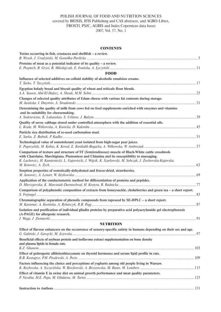 POLISH JOURNAL OF FOOD AND NUTRITION SCIENCES covered by BIOSIS, IFIS Publishing and CAS abstracts, and AGRO-Librex, FROSTI, PSJC, AGRIS and Index Copernicus data bases 2007, Vol. 57, No. 1 CONTENTS Toxins occurring in fish, crustacea and shellfish – a review. B. Wysok, J. Uradziński, M. Gomółka-Pawlicka ............................................................................................................................. 5 Proteins of meat as a potential indicator of its quality – a review. E. Pospiech, B. Grześ, B. Mikołajczak, E. Iwańska, A. Łyczyński ................................................................................................. 11 FOOD Influence of selected additives on colloid stability of alcoholic emulsion creams. T. Tarko, T. Tuszyński .................................................................................................................................................................... 17 Egyptian balady bread and biscuit quality of wheat and triticale flour blends. A.A. Yaseen, Abd-El-Hafeez, A. Shouk, M.M. Selim ..................................................................................................................... 25 Changes of selected quality attributes of Edam cheese with various fat contents during storage. M. Jasińska, I. Dmytrów, A. Stradomski ....................................................................................................................................... 31 Determining the quality of milk from cows fed on feed supplements enriched with enzymes and vitamins and its suitability for cheesemaking. A. Sederevicius, K. Lukauskas, S. Urbiene, J. Balsyte................................................................................................................... 39 Quality of savoy cabbage stored under controlled atmosphere with the addition of essential oils. L. Krala, M. Witkowska, A. Kunicka, D. Kalemba ....................................................................................................................... 45 Particle size distribution of re-used carbonation mud. E. Sarka, Z. Bubnik, P. Kadlec ...................................................................................................................................................... 51 Technological value of osmotolerant yeast isolated from high-sugar pear juices. E. Pogorzelski, M. Kobus, K. Kowal, E. Kordialik-Bogacka, A. Wilkowska, W. Ambroziak .......................................................... 57 Comparison of texture and structure of ST (Semitendinosus) muscle of Black-White cattle crossbreds with Charolaise, Marchigiana, Piemontese and Chianina and its susceptibility to massaging. K. Lachowicz, H. Kamieniecki, L. Gajowiecki, J. Wójcik, K. Szarkowski, M. Sobczak, J. Żochowska-Kujawska, M. Kotowicz, A. Żych ..................................................................................................................................................................... 63 Sorption properties of osmotically-dehydrated and freeze-dried, strawberries. M. Janowicz, A. Lenart, W. Idzikowska ......................................................................................................................................... 69 Application of the conductometric method for differentiation of proteins and peptides. D. Mierzejewska, K. Marciniak-Darmochwał, H. Kostyra, B. Rudnicka ....................................................................................... 77 Comparison of polyphenolic composition of extracts from honeysuckle, chokeberries and green tea – a short report. S. Frejnagel .................................................................................................................................................................................... 83 Chromatographic separation of phenolic compounds from rapeseed by SE-HPLC – a short report. M. Karamać, A. Kosińska, A. Rybarczyk, R.B. Pegg ..................................................................................................................... 87 Isolation and purification of individual gliadin proteins by preparative acid polyacrylamide gel electrophoresis (A-PAGE) for allergenic research. J. Waga, J. Zientarski .................................................................................................................................................................... 91 NUTRITION Effect of flavour enhancers on the occurrence of sensory-specific satiety in humans depending on their sex and age. G. Galiński, J. Gawęcki, M. Jeżewska ........................................................................................................................................... 97 Beneficial effects of soybean protein and isoflavone extract supplementation on bone density and plasma lipids in female rats. K.Z. Ghanem ............................................................................................................................................................................... 103 Effect of goitrogenic alliloisothiocyanate on thyroid hormones and serum lipid profile in rats. R.B. Kostogrys, P.M. Pisulewski, A. Pecio ................................................................................................................................... 109 Factors influencing the choice and perceptions of yoghurts among old people living in Warsaw. K. Kozłowska, A. Szczecińska, W. Roszkowski, A. Brzozowska, M. Raats, M. Lumbers ............................................................. 115 Effect of vitamin E in swine diet on animal growth performance and meat quality parameters. P. Niculita, M.E. Popa, M. Ghidurus, M. Turtoi .......................................................................................................................... 125 Instruction to Authors ................................................................................................................................