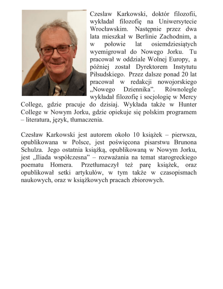 Czeslaw Karkowski, doktór filozofii, wykładał filozofię na Uniwersytecie Wrocławskim. Następnie przez dwa lata mieszkał w Berlinie Zachodnim, a w połowie lat osiemdziesiątych wyemigrował do Nowego Jorku. Tu pracował w oddziale Wolnej Europy, a później został Dyrektorem Instytutu Piłsudskiego. Przez dalsze ponad 20 lat pracował w redakcji nowojorskiego „Nowego Dziennika”. Równolegle wykładał filozofię i socjologię w Mercy College, gdzie pracuje do dzisiaj. Wykłada także w Hunter College w Nowym Jorku, gdzie opiekuje się polskim programem – literatura, język, tłumaczenia. Czesław Karkowski jest autorem około 10 książek – pierwsza, opublikowana w Polsce, jest poświęcona pisarstwu Brunona Schulza. Jego ostatnia książką, opublikowaną w Nowym Jorku, jest „Iliada współczesna” – rozważania na temat starogreckiego poematu Homera. Przetłumaczył też parę książek, oraz opublikował setki artykułów, w tym także w czasopismach naukowych, oraz w książkowych pracach zbiorowych. Książka “Fundacja Alfreda Jurzykowskiego w Nowym Jorku” poświęcona jest dziejom i działalności największej polskiej Fundacji, a także mocno zapomnianej dziś postaci jej założyciela, przedsiębiorcy i filantropa, Alfreda Jurzykowskiego. Książka przedstawia losy Fundacji na szerokim tle życia Polonii nowojorskiej od 1939 r. Fundacja Alfreda Jurzykowskiego finansowała mnóstwo kulturalnych przedsięwzięć polskich w Stanach Zjednoczonych i na zachodzie Europy; początkowo udzielała stypendia naukowe, by ostatecznie skoncentrować się na, między innymi, przyznawaniu Polakom (niezależnie od miejsca zamieszkania) nagród za wybitne osiągnięcia w naukach ścisłych, a także społecznych, humanistycznych oraz w sztuce. Ze względu na wszechstronny charakter wyróżnień oraz znaczenie (także finansowe) tych wyróżnień, zaczęto je określać mianem „Polskiego Nobla”. Książka przedstawia losy Fundacji na szerokim tle życia Polonii nowojorskiej, począwszy od 1939 roku. Jednym z ważnych wątków tej książki jest wieloletni związek Alfreda Jurzykowskiego i jego fundacji z Polskim Instytutem Naukowym w Nowym Jorku.
