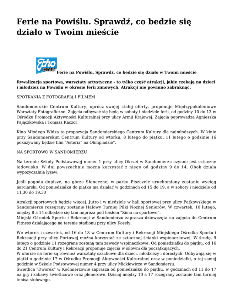 Ferie na Powiślu. Sprawdź, co bedzie się działo w Twoim mieście Ferie na Powiślu. Sprawdź, co bedzie się działo w Twoim mieście Rywalizacja sportowa, warsztaty artystyczne - to tylko część atrakcji, jakie czekają na dzieci i młodzież na Powiślu w okresie ferii zimowych. Atrakcji nie powinno zabraknąć. SPOTKANIA Z FOTOGRAFIĄ I FILMEM Sandomierskie Centrum Kultury, oprócz swojej stałej oferty, proponuje Międzypokoleniowe Warsztaty Fotograficzne. Zajęcia odbywać się będą w soboty i niedziele ferii, od godziny 10 do 13 w Ośrodku Promocji Aktywności Kulturalnej przy ulicy Armii Krajowej. Zajęcia poprowadzą Agnieszka Pajączkowska i Tomasz Kaczor. Kino Młodego Widza to propozycja Sandomierskiego Centrum Kultury dla najmłodszych. W kinie przy Sandomierskim Centrum Kultury od wtorku, 8 lutego do piątku, 11 lutego o godzinie 16 pokazywany będzie film "Asterix” na Olimpiadzie”. NA SPORTOWO W SANDOMIERZU Na terenie Szkoły Podstawowej numer 1 przy ulicy Okrzei w Sandomierzu czynne jest sztuczne lodowisko. W dni powszechnie można korzystać z niego od godziny 9 do 14. Obok działa wypożyczalnia łyżew. Jeśli pogoda dopisze, na górze Słonecznej w parku Piszczele uruchomiony zostanie wyciąg narciarski. Od poniedziałku do piątku ma działać w godzinach od 15 do 19, a w soboty i niedziele od 11.30 do 19.30 Atrakcji sportowych będzie więcej. Jutro i w niedzielę w hali sportowej przy ulicy Patkowskiego w Sandomierzu rozegrany zostanie Halowy Turniej Piłki Nożnej Seniorów. W czwartek, 10 lutego, między 8 a 14 odbędzie się tam impreza pod hasłem "Zima na sportowo”. Miejski Ośrodek Sportu i Rekreacji w Sandomierzu zaprasza dziewczęta na zajęcia do Centrum Fitness działającego na terenie stadionu przy ulicy Koseły. We wtorek i czwartek, od 16 do 18 w Centrum Kultury i Rekreacji Miejskiego Ośrodka Sportu i Rekreacji przy ulicy Portowej można korzystać ze sztucznej ścianki wspinaczkowej. W środę, 9 lutego o godzinie 11 rozegrane zostaną tam zawody wspinaczkowe. Od poniedziałku do piątku, od 16 do 21 Centrum Kultury i Rekreacji proponuje zajęcia w siłowni dla początkujących. W ofercie na ferie są również warsztaty szachowe dla dzieci, młodzieży i dorosłych. Odbywają się w piątki o godzinie 17 w Ośrodku Promocji Aktywności Kulturalnej oraz w poniedziałki, o tej samej godzinie w Szkole Podstawowej numer 4 przy ulicy Mickiewicza w Sandomierzu. Świetlica "Dworek” w Koćmierzowie zaprasza od poniedziałku do piątku, w godzinach od 11 do 17 na gry i zabawy świetlicowe oraz plenerowe. Dzisiaj między 10 a 17 rozegrany zostanie tam turniej tenisa stołowego. FERIE Z BIBLIOTECE Atrakcyjne zabawy i turnieje czekają na dzieci i młodzież w sandomierskich świetlicach socjoterapeutycznych. "Bajka” przy Portowej czynna jest od 11 do 13, "Przystań” przy ulicy Słowackiego od 11 do 14. Miejska Biblioteka Publiczna przy ulicy Parkowej w Sandomierzu proponuje w sobotę i poniedziałek, od 10 do 15 oraz od wtorku do piątku, od 9 do 18 bezpłatne korzystanie z Internetu (w czytelni). We wtorek, od 11 do 14 Oddział dla Dzieci zaprasza najmłodszych na czytanie i projekcje bajek, a w czwartek, w tych samych godzinach na rysowanie, malowanie, gry planszowe i układnie puzzli. W Filii numer 2 przy Portowej z Internetu można korzystać od poniedziałku do piątku, od 10 do 17. Od 14 do 15 odbywają się tam warsztaty komputerowe. We wtorek o 15 spotkają się członkowie Klubie Kubusia Puchatka. W czwartek, od 11 do 13 placówka proponuje spacer po Sandomierzu. W środę i piątek, od 11 do 12 w Filii numer 2 przy Armii Krajowej będzie czytanie bajek i opowieści. FERIE W STASZOWIE Staszowski Ośrodek Kultury już od soboty zaprasza mieszkańców Staszowa do spędzenia ferii zimowych. Dzisiaj o godzinie 17 w osiedlowym klubie "Iskierka” dyskoteka, a jutro, w sobotę zbiórka przy klub osiedlowym "Iskierka” i godzinie 13 zabawy na śniegu – kulig oraz ognisko z pieczeniem kiełbasek. W poniedziałek, 7 lutego od godziny 13 zabawy na śniegu – lepimy bałwana olbrzyma, w przypadku złych warunków pogodowych zajęcia z origami - "papierowe bałwany”. Od godziny 17 w klubie "Iskierka” wielki turniej gier planszowych - chińczyk, warcaby, szachy. We wtorek, 8 lutego w Staszowskim Ośrodku Kultury przy ulicy Parkowej w Staszowie od godziny 9 dzień otwarty z tańcem hip – hop, czyli zajęcia dla dzieci szkół podstawowych prowadzone przez instruktorów zespołów tanecznych "Kleks”. W klubie Iskierka od godziny 17 turniej tenisa stołowego z podziałem na kategorie wiekowe. W środę i czwartek, 9 i 10 lutego, od godziny 17 zajęcia bębniarskie - nauka gry na bębnach – klub Iskierka przy ulicy Jana Pawła II. W piątek, 11 lutego od godziny 17 "Wilk i zając” - spektakl dla dzieci w wykonaniu aktorów Studia Małych Form Teatralnych, Scenografii i Reżyserii "Art – Re” w Krakowie. W POŁAŃCU Publiczne Gimnazjum numer 1 w Połańcu w czasie ferii zaprasza od poniedziałku do czwartku w godzinach od 10 do 11.30 na piłkę nożną, do klubu Młodych Techników, na bilard, zajęcia rekreacyjno – sportowe, piłkę siatkową, kółko biblijne, do biblioteki oraz na zajęcia rekreacyjno – sportowe. Zespół Szkół w Połańcu zaprasza na piłkę siatkową, piłkę nożną, koszykową, do siłowni i pokoju fitness codziennie w godzinach 8-14. Publiczna Szkoła Podstawowa w Połańcu przez całe ferie w godzinach 9-13 oferuje zajęcia sportowe i świetlicowe. Zespół Placówek Oświatowych w Ruszczy w drugim tygodniu ferii proponuje w godzinach od 9 do 13 następujące atrakcje: gry i zabawy na sali gimnastycznej, konkursy: fotograficzny i pla-styczny, oglądanie filmów przyrodniczych i obserwacje mikro-skopowe, wykonywanie preparatów, gry językowe, karaoke w języku angielskim, zajęcia komputerowe "Moja własna strona internetowa”, zabawy papierem – zajęcia plastyczne, zajęcia sportowe (gry zespoł