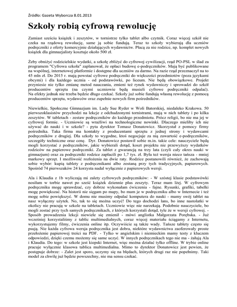 Źródło: Gazeta Wyborcza 8.01.2013 Szkoły robią cyfrową rewolucję Zamiast sześciu książek i zeszytów, w tornistrze tylko tablet albo czytnik. Coraz więcej szkół nie czeka na rządową rewolucję, same ją sobie fundują. Teraz to szkoły wybierają dla uczniów podręczniki z oferty komercyjnie działających wydawnictw. Płacą za nie rodzice, np. komplet nowych książek dla gimnazjalisty kosztuje około 500 zł. Żeby obniżyć rodzicielskie wydatki, a szkołę zbliżyć do cyfrowej cywilizacji, rząd PO-PSL w ślad za programem "Cyfrowa szkoła" zaplanował, że opłaci budowę e-podręczników. Mają być publikowane na wspólnej, internetowej platformie i dostępne dla uczniów za darmo. Na razie rząd przeznaczył na to 45 mln zł. Do 2015 r. mają powstać cyfrowe podręczniki do większości przedmiotów (poza językami obcymi) i dla każdego ucznia - od podstawówki, po liceum. Nie będą obowiązkowe. Projekt przyniesie nie tylko zmianę metod nauczania, zmieni też rynek wydawniczy i sprowadzi do szkół producentów sprzętu (na czymś uczniowie będą musieli cyfrowe podręczniki odpalać). Na efekty jednak nie trzeba będzie długo czekać. Szkoły już sobie fundują własną rewolucję z pomocą producentów sprzętu, wydawców oraz zupełnie nowych firm pośredników. Niewielkie, Społeczne Gimnazjum im. Lady Sue Ryder w Woli Batorskiej, niedaleko Krakowa. 50 pierwszoklasistów przychodzi na lekcje z odchudzonymi tornistrami, mają w nich tablety i po kilka zeszytów. W tabletach - zestaw podręczników do każdego przedmiotu. Prócz religii, bo nie ma jej w cyfrowej formie. - Uczniowie są wrażliwi na technologiczne nowinki. Dlaczego mieliby ich nie używać do nauki i w szkole? - pyta dyrektor Tomasz Donatowicz. Skorzystał z pomocy firmy pośrednika. Taka firma ma kontakty z producentami sprzętu z jednej strony i wydawcami podręczników z drugiej. Dla szkoły to wygodne, ktoś negocjuje za nią zawartość e-podręczników, szczegóły techniczne oraz cenę. Dyr. Donatowicz postawił sobie m.in. takie cele: nauczyciele będą mogli korzystać z podręczników, jakie wybierali dotąd, koszt projektu nie przewyższy wydatków rodziców na papierowe podręczniki. Za tablet z gwarancją na trzy lata (czyli cały okres nauki w gimnazjum) oraz za podręczniki rodzice zapłacili po 1,7 tys. zł. Była też wersja nieco tańsza - mniej markowy sprzęt. I możliwość rozłożenia na dwie raty. Rodzice postanowili również, że zachowają sobie wybór: kupią tablety z podręcznikami albo zostaną przy tych tradycyjnych, papierowych. Spośród 74 pierwszaków 24 korzysta nadal wyłącznie z papierowych wersji. Ala i Klaudia z 1b wyliczają mi zalety cyfrowych podręczników: - W szóstej klasie podstawówki nosiłam w torbie nawet po sześć książek dziennie plus zeszyty. Teraz mam lżej. W cyfrowym podręczniku mogę sprawdzać, czy dobrze wykonałam ćwiczenia - fajne. Rysunki, grafiki, tabelki mogę powiększać. Na historii nie sięgam po mapy, bo mam je w podręczniku albo w Internecie i też mogę sobie powiększyć. W domu nie musimy odpalać komputera do nauki - mamy swój tablet na nasz wyłączny użytek. No, tak to się można uczyć! Do tego dochodzi lans, bo inne nastolatki w okolicy nie pracują w szkole na tabletach. Uczniowie więc nie narzekają. Podobnie nauczyciele, bo mogli zostać przy tych samych podręcznikach, z których korzystali dotąd, tyle że w wersji cyfrowej. Sposób prowadzenia lekcji niewiele się zmienił - mówi anglistka Małgorzata Porębska. - Już wcześniej korzystaliśmy z tablic multimedialnych, coraz więcej materiału ściągamy z Internetu, wykorzystujemy filmy, ćwiczenia online itp. Oczywiście są także wady. Tańsze tablety często się psują. Nie każda cyfrowa wersja podręcznika jest dobra, niektóre wydawnictwa zaoferowały proste przełożenie papierowej treści na PDF. - Tylko w angielskim i niemieckim mamy testy z kluczem odpowiedzi, dzięki czemu możemy się same uczyć. W innych podręcznikach tego nie ma - żałują Ala i Klaudia. Do tego: w szkole jest kiepski Internet, więc można działać tylko offline. W trybie online pracuje wyłącznie klasowa tablica multimedialna. Mimo to dyrektor Donatowicz jest pewien, że postępuje dobrze: - Zalet jest sporo, uczymy się na błędach, których drugi raz nie popełnimy. Taki model za chwilę już będzie powszechny, nie ma sensu czekać.