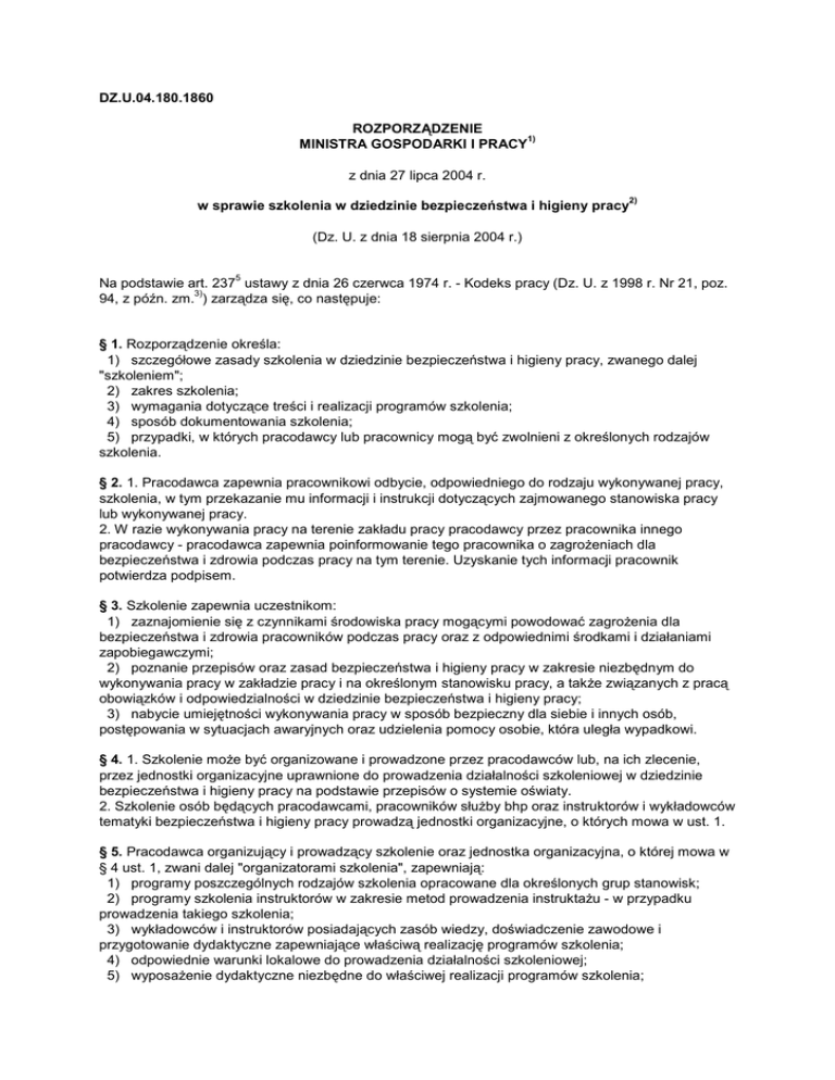 DZ.U.04.180.1860 ROZPORZĄDZENIE 1) MINISTRA GOSPODARKI I PRACY z dnia 27 lipca 2004 r. 2) w sprawie szkolenia w dziedzinie bezpieczeństwa i higieny pracy (Dz. U. z dnia 18 sierpnia 2004 r.) 5 Na podstawie art. 237 ustawy z dnia 26 czerwca 1974 r. - Kodeks pracy (Dz. U. z 1998 r. Nr 21, poz. 3) 94, z późn. zm. ) zarządza się, co następuje: § 1. Rozporządzenie określa: 1) szczegółowe zasady szkolenia w dziedzinie bezpieczeństwa i higieny pracy, zwanego dalej "szkoleniem"; 2) zakres szkolenia; 3) wymagania dotyczące treści i realizacji programów szkolenia; 4) sposób dokumentowania szkolenia; 5) przypadki, w których pracodawcy lub pracownicy mogą być zwolnieni z określonych rodzajów szkolenia. § 2. 1. Pracodawca zapewnia pracownikowi odbycie, odpowiedniego do rodzaju wykonywanej pracy, szkolenia, w tym przekazanie mu informacji i instrukcji dotyczących zajmowanego stanowiska pracy lub wykonywanej pracy. 2. W razie wykonywania pracy na terenie zakładu pracy pracodawcy przez pracownika innego pracodawcy - pracodawca zapewnia poinformowanie tego pracownika o zagrożeniach dla bezpieczeństwa i zdrowia podczas pracy na tym terenie. Uzyskanie tych informacji pracownik potwierdza podpisem. § 3. Szkolenie zapewnia uczestnikom: 1) zaznajomienie się z czynnikami środowiska pracy mogącymi powodować zagrożenia dla bezpieczeństwa i zdrowia pracowników podczas pracy oraz z odpowiednimi środkami i działaniami zapobiegawczymi; 2) poznanie przepisów oraz zasad bezpieczeństwa i higieny pracy w zakresie niezbędnym do wykonywania pracy w zakładzie pracy i na określonym stanowisku pracy, a także związanych z pracą obowiązków i odpowiedzialności w dziedzinie bezpieczeństwa i higieny pracy; 3) nabycie umiejętności wykonywania pracy w sposób bezpieczny dla siebie i innych osób, postępowania w sytuacjach awaryjnych oraz udzielenia pomocy osobie, która uległa wypadkowi. § 4. 1. Szkolenie może być organizowane i prowadzone przez pracodawców lub, na ich zlecenie, przez jednostki organizacyjne uprawnione do prowadzenia działalności szkoleniowej w dziedzinie bezpieczeństwa i higieny pracy na podstawie przepisów o systemie oświaty. 2. Szkolenie osób będących pracodawcami, pracowników służby bhp oraz instruktorów i wykładowców tematyki bezpieczeństwa i higieny pracy prowadzą jednostki organizacyjne, o których mowa w ust. 1. § 5. Pracodawca organizujący i prowadzący szkolenie oraz jednostka organizacyjna, o której mowa w § 4 ust. 1, zwani dalej "organizatorami szkolenia", zapewniają: 1) programy poszczególnych rodzajów szkolenia opracowane dla określonych grup stanowisk; 2) programy szkolenia instruktorów w zakresie metod prowadzenia instruktażu - w przypadku prowadzenia takiego szkolenia; 3) wykładowców i instruktorów posiadających zasób wiedzy, doświadczenie zawodowe i przygotowanie dydaktyczne zapewniające właściwą realizację programów szkolenia; 4) odpowiednie warunki lokalowe do prowadzenia działalności szkoleniowej; 5) wyposażenie dydaktyczne niezbędne do właściwej realizacji programów szkolenia; 6) właściwy przebieg szkolenia oraz prowadzenie dokumentacji w postaci programów szkolenia, dzienników zajęć, protokołów przebiegu egzaminów i rejestru wydanych zaświadczeń. § 6. Szkolenie jest prowadzone jako szkolenie wstępne i szkolenie okresowe. § 7. 1. Programy szkolenia wstępnego oraz szkolenia okresowego, określające szczegółową tematykę, formy realizacji i czas trwania szkolenia, dla poszczególnych grup stanowisk opracowuje pracodawca lub w porozumieniu z pracodawcą - jednostka, o której mowa w § 4 ust. 1, na podstawie ramowych programów szkolenia. 2. Programy szkolenia powinny być dostosowane do rodzajów i warunków prac wykonywanych przez uczestników szkolenia, a ich realizacja powinna zapewnić spełnienie wymagań określonych w § 3. 3. Programy szkolenia, na podstawie których były prowadzone aktualne szkolenia pracowników, powinny być przechowywane przez pracodawców. 4. Ramowe programy szkolenia są określone w załączniku nr 1 do rozporządzenia. § 8. Szkolenie wstępne jest przeprowadzane w formie instruktażu według programów opracowanych dla poszczególnych grup stanowisk i obejmuje: 1) szkolenie wstępne ogólne, zwane dalej "instruktażem ogólnym"; 2) szkolenie wstępne na stanowisku pracy, zwane dalej "instruktażem stanowiskowym". § 9. 1. Instruktaż ogólny powinien zapewnić uczestnikom szkolenia zapoznanie się z podstawowymi przepisami bezpieczeństwa i higieny pracy zawartymi w Kodeksie pracy, w układach zbiorowych pracy lub w regulaminach pracy, z przepisami oraz zasadami bezpieczeństwa i higieny pracy obowiązującymi w danym zakładzie pracy, a także z zasadami udzielania pierwszej pomocy w razie wypadku. 2. Instruktaż stanowiskowy powinien zapewnić uczestnikom szkolenia zapoznanie się z czynnikami środowiska pracy występującymi na ich stanowiskach pracy i ryzykiem zawodowym związanym z wykonywaną pracą, sposobami ochrony przed zagrożeniami, jakie mogą powodować te czynniki, oraz metodami bezpiecznego wykonywania pracy na tych stanowiskach. § 10. 1. Instruktaż ogólny odbywają, przed dopuszczeniem do wykonywania pracy, nowo zatrudnieni pracownicy, studenci odbywający u pracodawcy praktykę studencką oraz uczniowie szkół zawodowych zatrudnieni w celu praktycznej nauki zawodu. 2. Instruktaż ogólny prowadzi pracownik służby bezpieczeństwa i higieny pracy lub osoba wykonująca u pracodawcy zadania tej służby albo pracownik wyznaczony przez pracodawcę posiadający zasób wiedzy i umiejętności zapewniające właściwą realizację programu instruktażu. § 11. 1. Instruktaż stanowiskowy przeprowadza się przed dopuszczeniem do wykonywania pracy na określonym stanowisku: 1) pracownika zatrudnianego na stanowisku robotniczym oraz innym, na którym występuje narażenie na działanie czynników szkodliwych dla zdrowia, uciążl