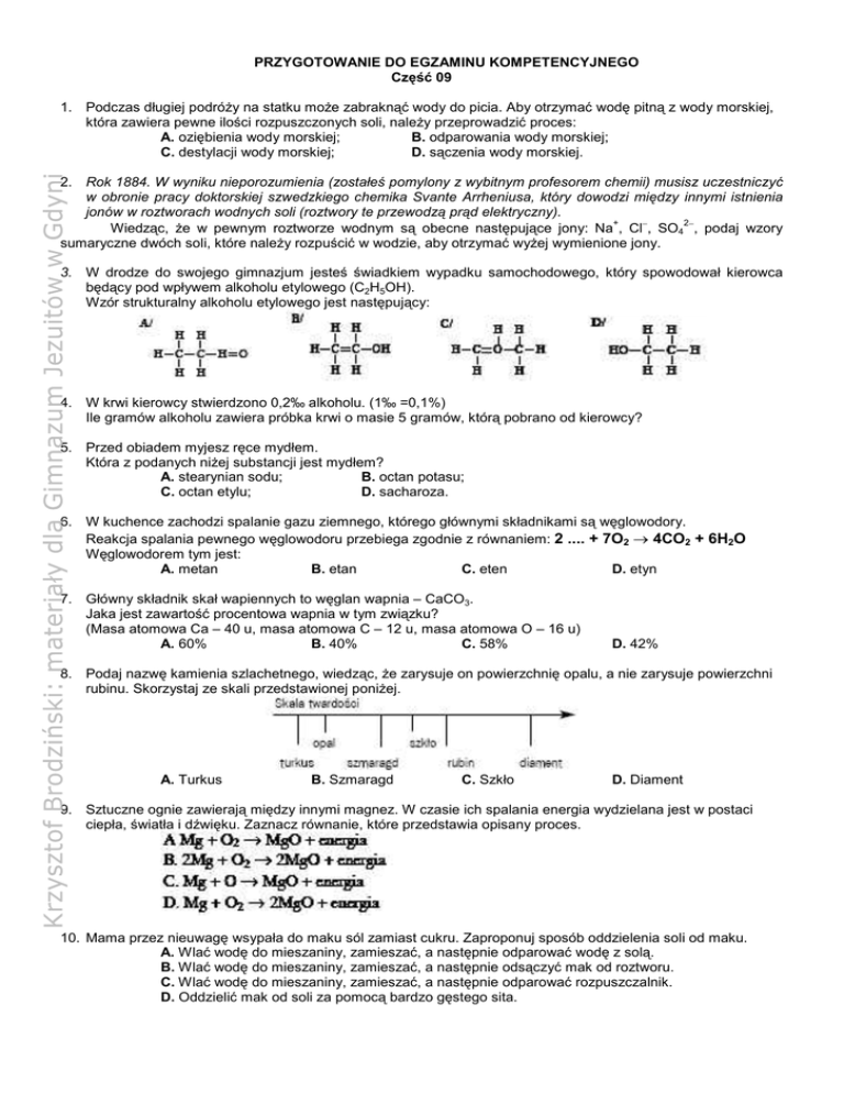 PRZYGOTOWANIE DO EGZAMINU KOMPETENCYJNEGO Część 09 1. Podczas długiej podróży na statku może zabraknąć wody do picia. Aby otrzymać wodę pitną z wody morskiej, która zawiera pewne ilości rozpuszczonych soli, należy przeprowadzić proces: A. oziębienia wody morskiej; B. odparowania wody morskiej; C. destylacji wody morskiej; D. sączenia wody morskiej. 2. Rok 1884. W wyniku nieporozumienia (zostałeś pomylony z wybitnym profesorem chemii) musisz uczestniczyć w obronie pracy doktorskiej szwedzkiego chemika Svante Arrheniusa, który dowodzi między innymi istnienia jonów w roztworach wodnych soli (roztwory te przewodzą prąd elektryczny). + 2 Wiedząc, że w pewnym roztworze wodnym są obecne następujące jony: Na , Cl, SO4 , podaj wzory sumaryczne dwóch soli, które należy rozpuścić w wodzie, aby otrzymać wyżej wymienione jony. 3. W drodze do swojego gimnazjum jesteś świadkiem wypadku samochodowego, który spowodował kierowca będący pod wpływem alkoholu etylowego (C2H5OH). Wzór strukturalny alkoholu etylowego jest następujący: 4. W krwi kierowcy stwierdzono 0,2‰ alkoholu. (1‰ =0,1%) Ile gramów alkoholu zawiera próbka krwi o masie 5 gramów, którą pobrano od kierowcy? 5. Przed obiadem myjesz ręce mydłem. Która z podanych niżej substancji jest mydłem? A. stearynian sodu; B. octan potasu; C. octan etylu; D. sacharoza. 6. W kuchence zachodzi spalanie gazu ziemnego, którego głównymi składnikami są węglowodory. Reakcja spalania pewnego węglowodoru przebiega zgodnie z równaniem: 2 .... + 7O2 4CO2 + 6H2O Węglowodorem tym jest: A. metan B. etan C. eten D. etyn 7. Główny składnik skał wapiennych to węglan wapnia – CaCO3. Jaka jest zawartość procentowa wapnia w tym związku? (Masa atomowa Ca – 40 u, masa atomowa C – 12 u, masa atomowa O – 16 u) A. 60% B. 40% C. 58% D. 42% 8. Podaj nazwę kamienia szlachetnego, wiedząc, że zarysuje on powierzchnię opalu, a nie zarysuje powierzchni rubinu. Skorzystaj ze skali przedstawionej poniżej. A. Turkus B. Szmaragd C. Szkło D. Diament 9. Sztuczne ognie zawierają między innymi magnez. W czasie ich spalania energia wydzielana jest w postaci ciepła, światła i dźwięku. Zaznacz równanie, które przedstawia opisany proces. 10. Mama przez nieuwagę wsypała do maku sól zamiast cukru. Zaproponuj sposób oddzielenia soli od maku. A. Wlać wodę do mieszaniny, zamieszać, a następnie odparować wodę z solą. B. Wlać wodę do mieszaniny, zamieszać, a następnie odsączyć mak od roztworu. C. Wlać wodę do mieszaniny, zamieszać, a następnie odparować rozpuszczalnik. D. Oddzielić mak od soli za pomocą bardzo gęstego sita. 11. Stężenie procentowe Cp jest to stosunek masy substancji rozpuszczonej ms do masy roztworu mr wyrażony w procentach. Wyznaczając z tego wzoru mr otrzymasz: 12. W 200 gramach wody rozpuszczono 50 gramów soli kuchennej. Jakie jest stężenie procentowe otrzymanego roztworu? A. 20% B. 25% C. 40% 13. Który z wymienionych pierwiastków jest metalem? A. rtęć B. azot C. siarka D. 50% D. fosfor 14. Jakiego pierwiastka dostarczymy roślinom, stosując saletrę amonową ? A. wapnia B. fosforu C. azotu D. Węgla 15. Pestycydy to: 0 16. Jaka jest rozpuszczalność glukozy w wodzie o temperaturze 20 C, jeżeli w szklance wody (200 g) można maksymalnie rozpuścić 216 g tego cukru? 17. Próbkę, będącą mieszaniną dwóch gazów, poddano analizie. Część tej mieszaniny przepuszczono przez wodę wapienną, co spowodowało jej zmętnienie, a wprowadzone do pozostałej części tlące się łuczywko rozżarzyło się. Gazem tym mogła być mieszanina: A dwutlenku węgla i pary wodnej; B azotu i tlenu; C dwutlenku węgla i azotu; D dwutlenku węgla i tlenu. 18. Które metale nie ulegają wpływowi substancji zawartych w powietrzu? A Nikiel, ołów i srebro. B Miedź, złoto i cynk. C Cyna, żelazo i platyna. D Chrom, platyna i złoto. 19. Rozwiązując to zadanie, skorzystaj z wykresu krzywej rozpuszczalności sody oczyszczonej w wodzie. Jakie w przybliżeniu będzie stężenie procentowe nasyconego w temperaturze 60°C roztworu sody oczyszczonej? 20. Trzy roztwory mają różne wartości pH: Odczyn zasadowy ma roztwór: A I; B II; I – 12, C III; II – 7, III – 4. D I i II. PRZYGOTOWANIE DO EGZAMINU KOMPETENCYJNEGO Część 10 1. a) b) c) d) Reakcję chemiczną charakteryzujemy jako: przemianę w wyniku której właściwości chemiczne substancji nie ulegają zmianie. reakcję podczas której zmienił się stan skupienia substancji. reakcję podczas której zmieniły się właściwości fizyczne substancji. przemianę, która doprowadziła do powstania nowych substancji o zupełnie innych właściwościach. 2. a) b) c) d) Masa atomowa określona jest jako: masa atomu wyrażona w jednostkach masy atomowej u. masa atomu wyrażona w jednostkach g / mol. masa cząsteczki wyrażona w jednostkach masy atomowej u. masa cząsteczki wyrażona w jednostkach g / mol. 3. a) b) c) Rozpuszczalność określa: liczbę gramów substancji, jaka może rozpuścić się w 100 gramach roztworu. liczbę gramów substancji, jaka może rozpuścić się w 100 gramach rozpuszczalnika. liczbę gramów substancji, jaką bierzemy do sporządzenia 100 gram roztworu. liczba gramów substancji, jaką maksymalnie można rozpuścić w 100 gramach rozpuszczalnika w danej temperaturze i pod stałym ciśnieniem. d) 4. Stężenie procentowe roztworu, w którego 500 g rozpuszczono 25 g soli wynosi: a) 3% b) 5% c) 8% d) 12% 5. a) b) c) d) Zasady to: związki wodoru z metalem. substancje stałe, zbudowane z metalu i grupy wodorotlenkowej. wodne roztwory wodorotlenków. związki niemetalu z grupą wodorotlenkową. 6. a) b) c) Uzupełnij równania reakcji chemicznych: Na + H2O .......... + ........... CaO + H2O NaOH + H2SO4 7. a) b) Wzory następujących soli: węglan żelaza (III), azotan (V) wapnia, siarczek glinu (III), zawiera zapis: FeCO3, Ca(NO3)2, Al2S3. c) Fe2(CO3)3, Ca(NO3)2, CaS. Fe2(CO3)3, C