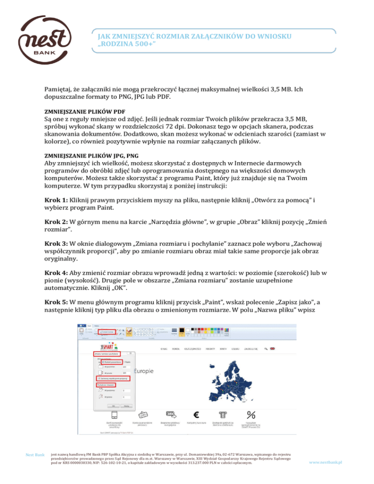 JAK ZMNIEJSZYĆ ROZMIAR ZAŁĄCZNIKÓW DO WNIOSKU „RODZINA 500+” Pamiętaj, że załączniki nie mogą przekroczyć łącznej maksymalnej wielkości 3,5 MB. Ich dopuszczalne formaty to PNG, JPG lub PDF. ZMNIEJSZANIE PLIKÓW PDF Są one z reguły mniejsze od zdjęć. Jeśli jednak rozmiar Twoich plików przekracza 3,5 MB, spróbuj wykonać skany w rozdzielczości 72 dpi. Dokonasz tego w opcjach skanera, podczas skanowania dokumentów. Dodatkowo, skan możesz wykonać w odcieniach szarości (zamiast w kolorze), co również pozytywnie wpłynie na rozmiar załączanych plików. ZMNIEJSZANIE PLIKÓW JPG, PNG Aby zmniejszyć ich wielkość, możesz skorzystać z dostępnych w Internecie darmowych programów do obróbki zdjęć lub oprogramowania dostępnego na większości domowych komputerów. Możesz także skorzystać z programu Paint, który już znajduje się na Twoim komputerze. W tym przypadku skorzystaj z poniżej instrukcji: Krok 1: Kliknij prawym przyciskiem myszy na pliku, następnie kliknij „Otwórz za pomocą” i wybierz program Paint. Krok 2: W górnym menu na karcie „Narzędzia główne”, w grupie „Obraz” kliknij pozycję „Zmień rozmiar”. Krok 3: W oknie dialogowym „Zmiana rozmiaru i pochylanie” zaznacz pole wyboru „Zachowaj współczynnik proporcji”, aby po zmianie rozmiaru obraz miał takie same proporcje jak obraz oryginalny. Krok 4: Aby zmienić rozmiar obrazu wprowadź jedną z wartości: w poziomie (szerokość) lub w pionie (wysokość). Drugie pole w obszarze „Zmiana rozmiaru” zostanie uzupełnione automatycznie. Kliknij „OK”. Krok 5: W menu głównym programu kliknij przycisk „Paint”, wskaż polecenie „Zapisz jako”, a następnie kliknij typ pliku dla obrazu o zmienionym rozmiarze. W polu „Nazwa pliku” wpisz Nest Bank jest nazwą handlową FM Bank PBP Spółka Akcyjna z siedzibą w Warszawie, przy ul. Domaniewskiej 39a, 02-672 Warszawa, wpisanego do rejestru przedsiębiorców prowadzonego przez Sąd Rejonowy dla m.st. Warszawy w Warszawie, XIII Wydział Gospodarczy Krajowego Rejestru S ądowego pod nr KRS 0000030330, NIP: 526-102-10-21, o kapitale zakładowym w wysokości 313.237.000 PLN w całości opłaconym. www.nestbank.pl nową nazwę pliku, a następnie kliknij przycisk „Zapisz”. Nest Bank jest nazwą handlową FM Bank PBP Spółka Akcyjna z siedzibą w Warszawie, przy ul. Domaniewskiej 39a, 02-672 Warszawa, wpisanego do rejestru przedsiębiorców prowadzonego przez Sąd Rejonowy dla m.st. Warszawy w Warszawie, XIII Wydział Gospodarczy Krajowego Rejestru S ądowego pod nr KRS 0000030330, NIP: 526-102-10-21, o kapitale zakładowym w wysokości 313.237.000 PLN w całości opłaconym. www.nestbank.pl MICROSOFT OFFICE Krok 1: Kliknij prawym przyciskiem myszy na pliku, następnie kliknij „Otwórz za pomocą” i wybierz program Microsoft Office. Krok 2: W górnym menu wybierz opcję „Edytuj obraz”, a następnie w bocznym menu opcję „Kompresuj obrazy”. Krok 3: Wybierz z listy „Kompresja z myślą o stronach web” i kliknij „OK”. Krok 4: Skorzystaj z polecenia „Zapisz jako”, w polu „Nazwa pliku” wpisz nową nazwę pliku, a następnie kliknij przycisk „Zapisz”. Więcej informacji dotyczących zmniejszania rozmiaru obrazów znajdziesz na stronie Office . Nest Bank jest nazwą handlową FM Bank PBP Spółka Akcyjna z siedzibą w Warszawie, przy ul. Domaniewskiej 39a, 02-672 Warszawa, wpisanego do rejestru przedsiębiorców prowadzonego przez Sąd Rejonowy dla m.st. Warszawy w Warszawie, XIII Wydział Gospodarczy Krajowego Rejestru S ądowego pod nr KRS 0000030330, NIP: 526-102-10-21, o kapitale zakładowym w wysokości 313.237.000 PLN w całości opłaconym. www.nestbank.pl