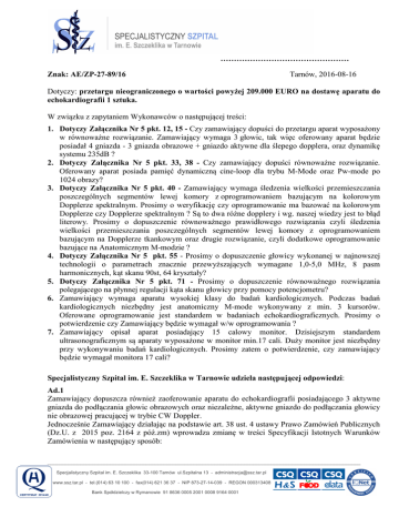 ………………………………………… Znak: AE/ZP-27-89/16 Tarnów, 2016-08-16 Dotyczy: przetargu nieograniczonego o wartości powyżej 209.000 EURO na dostawę aparatu do echokardiografii 1 sztuka. W związku z zapytaniem Wykonawców o następującej treści: 1. Dotyczy Załącznika Nr 5 pkt. 12, 15 - Czy zamawiający dopuści do przetargu aparat wyposażony w równoważne rozwiązanie. Zamawiający wymaga 3 głowic, tak więc oferowany aparat będzie posiadał 4 gniazda - 3 gniazda obrazowe + gniazdo aktywne dla ślepego dopplera, oraz dynamikę systemu 235dB ? 2. Dotyczy Załącznika Nr 5 pkt. 33, 38 - Czy zamawiający dopuści równoważne rozwiązanie. Oferowany aparat posiada pamięć dynamiczną cine-loop dla trybu M-Mode oraz Pw-mode po 1024 obrazy? 3. Dotyczy Załącznika Nr 5 pkt. 40 - Zamawiający wymaga śledzenia wielkości przemieszczania poszczególnych segmentów lewej komory z oprogramowaniem bazującym na kolorowym Dopplerze spektralnym. Prosimy o weryfikację czy oprogramowanie ma bazować na kolorowym Dopplerze czy Dopplerze spektralnym ? Są to dwa różne dopplery i wg. naszej wiedzy jest to błąd literowy. Prosimy o dopuszczenie równoważnego prawidłowego rozwiązania czyli śledzenia wielkości przemieszczania poszczególnych segmentów lewej komory z oprogramowaniem bazującym na Dopplerze tkankowym oraz drugie rozwiązanie, czyli dodatkowe oprogramowanie bazujące na Anatomicznym M-modzie ? 4. Dotyczy Załącznika Nr 5 pkt. 55 - Prosimy o dopuszczenie głowicy wykonanej w najnowszej technologii o parametrach znacznie przewyższających wymagane 1,0-5,0 MHz, 8 pasm harmonicznych, kąt skanu 90st, 64 kryształy? 5. Dotyczy Załącznika Nr 5 pkt. 71 - Prosimy o dopuszczenie równoważnego rozwiązania polegającego na płynnej regulacji kąta skanu głowicy przy pomocy potencjometru? 6. Zamawiający wymaga aparatu wysokiej klasy do badań kardiologicznych. Podczas badań kardiologicznych niezbędny jest anatomiczny M-mode wykonywany z min. 3 kursorów. Oferowane oprogramowanie jest standardem w badaniach echokardiograficznych. Prosimy o potwierdzenie czy Zamawiający będzie wymagał w/w oprogramowania ? 7. Zamawiający opisał aparat posiadający 15 calowy monitor. Dzisiejszym standardem ultrasonograficznym są aparaty wyposażone w monitor min.17 cali. Duży monitor jest niezbędny przy wykonywaniu badań kardiologicznych. Prosimy zatem o potwierdzenie, czy zamawiający będzie wymagał monitora 17 cali? Specjalistyczny Szpital im. E. Szczeklika w Tarnowie udziela następującej odpowiedzi: Ad.1 Zamawiający dopuszcza również zaoferowanie aparatu do echokardiografii posiadającego 3 aktywne gniazda do podłączania głowic obrazowych oraz niezależne, aktywne gniazdo do podłączania głowicy nie obrazowej pracującej w trybie CW Doppler. Jednocześnie Zamawiający działając na podstawie art. 38 ust. 4 ustawy Prawo Zamówień Publicznych (Dz.U. z 2015 poz. 2164 z póź.zm) wprowadza zmianę w treści Specyfikacji Istotnych Warunków Zamówienia w następujący sposób: _________________________________________________________________________________________________________ Specjalistyczny Szpital im. E. Szczeklika 33-100 Tarnów ul.Szpitalna 13 - [email protected] www.ssz.tar.pl - tel.(014) 63 10 100 - fax(014) 621 36 37 - NIP 873-27-14-039 - REGON 000313408 Bank Spółdzielczy w Rymanowie 91 8636 0005 2001 0008 9164 0001 2 1/ w pkt.15 Załącznika Nr 5 do SIWZ w kolumnie „Wymagania Zamawiającego. Parametry techniczne i funkcjonalne” zapis o treści: „Dynamika aparatu, min. 260 [dB]” zmienia na zapis o treści: „Dynamika aparatu, min. 235 [dB]” Ad.2 Zamawiający dopuszcza również zaoferowanie aparatu do echokardiografii posiadającego pamięć dynamiczną cine-loop dla trybu M-Mode oraz PW-Mode po 1024 obrazy. Ad.3 Zamawiający działając na podstawie art. 38 ust. 4 ustawy Prawo Zamówień Publicznych (Dz.U. z 2015 poz. 2164 z póź.zm) wprowadza zmianę w treści Specyfikacji Istotnych Warunków Zamówienia w następujący sposób: 1/ w pkt.40 Załącznika Nr 5 do SIWZ w kolumnie „Wymagania Zamawiającego. Parametry techniczne i funkcjonalne” zapis o treści: „Śledzenie wielkości przemieszczenia poszczególnych segmentów lewej komory do szybkiej oceny zaburzenia kurczliwości, oprogramowanie bazujące na kolorowym doplerze spektralnym” zmienia na zapis o treści: „Śledzenie wielkości przemieszczenia poszczególnych segmentów lewej komory do szybkiej oceny zaburzenia kurczliwości, oprogramowanie bazujące na kolorowym doplerze tkankowym lub spektralnym doplerze tkankowym” Ad.4 Zamawiający dopuszcza również zaoferowanie głowicy sektorowej do badań echokardiograficznych posiadającej zakres częstotliwości 1,0-5,0 MHz, 8 częstotliwości harmonicznych, kąt widzenia 900 oraz 64 elementy (kryształy). Ad.5 Zamawiający dopuszcza również zaoferowanie głowicy sektorowej do przezprzełykowego badania serca dorosłych posiadającej płynną regulację kąta skanu głowicy przy pomocy potencjometru, pod warunkiem, że zakres tej regulacji wynosi 0-1800. Ad.6 Zamawiający nie wymaga, ale dopuszcza również zaoferowanie aparatu do echokardiografii posiadającego anatomiczny M-Mode wykonywany z min. 3 kursorów. Ad.7 Zgodnie z wymogiem określonym w pkt.5 Załącznika Nr 5 do SIWZ Zamawiający dopuszcza również zaoferowanie monitora posiadającego przekątną ekranu 17”. W związku z udzielonymi odpowiedziami Zamawiający, działając na podstawie art. 38 ust. 4 ustawy Prawo Zamówień Publicznych (Dz.U. z 2015 poz. 2164 z póź.zm.), wprowadza zmiany w treści Specyfikacji Istotnych Warunków Zamówienia w następujący sposób: 1/ zapis pkt.VI.3 SIWZ o treści: „VI.3.Punktacja w kryterium parametry techniczne zostanie obliczona ze wzoru: P 3 = 0,30 * ( t1 + t2 + t3+ t4+ t5) * 100/9 pkt gdzie: t1 – punkty przyznane badanej ofercie w ocenianym w pozycji 15 Załącznika Nr 5 do SIWZ parametrze t2 – punk