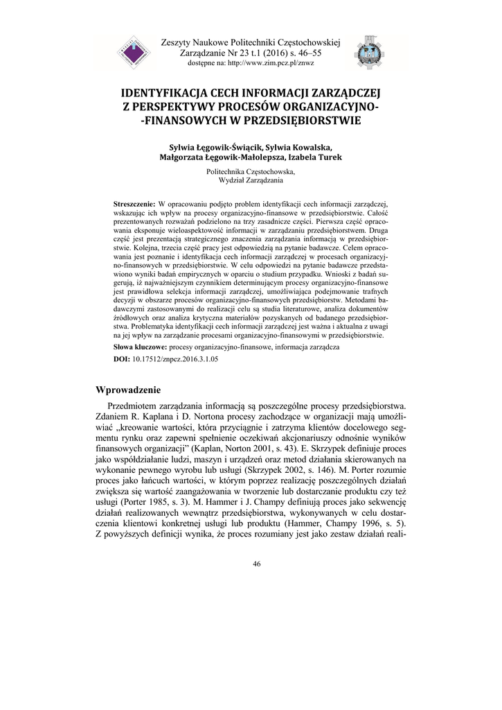 Zeszyty Naukowe Politechniki Częstochowskiej Zarządzanie Nr 23 t.1 (2016) s. 46–55 Sylwia Łęgowik-Świącik, Sylwia Kowalska,Małgorzata Łęgowik-Małolepsza, Izabela Turek dostępne na: http://www.zim.pcz.pl/znwz IDENTYFIKACJA CECH INFORMACJI ZARZĄDCZEJ Z PERSPEKTYWY PROCESÓW ORGANIZACYJNO-FINANSOWYCH W PRZEDSIĘBIORSTWIE Sylwia Łęgowik-Świącik, Sylwia Kowalska, Małgorzata Łęgowik-Małolepsza, Izabela Turek Politechnika Częstochowska, Wydział Zarządzania Streszczenie: W opracowaniu podjęto problem identyfikacji cech informacji zarządczej, wskazując ich wpływ na procesy organizacyjno-finansowe w przedsiębiorstwie. Całość prezentowanych rozważań podzielono na trzy zasadnicze części. Pierwsza część opracowania eksponuje wieloaspektowość informacji w zarządzaniu przedsiębiorstwem. Druga część jest prezentacją strategicznego znaczenia zarządzania informacją w przedsiębiorstwie. Kolejna, trzecia część pracy jest odpowiedzią na pytanie badawcze. Celem opracowania jest poznanie i identyfikacja cech informacji zarządczej w procesach organizacyjno-finansowych w przedsiębiorstwie. W celu odpowiedzi na pytanie badawcze przedstawiono wyniki badań empirycznych w oparciu o studium przypadku. Wnioski z badań sugerują, iż najważniejszym czynnikiem determinującym procesy organizacyjno-finansowe jest prawidłowa selekcja informacji zarządczej, umożliwiająca podejmowanie trafnych decyzji w obszarze procesów organizacyjno-finansowych przedsiębiorstw. Metodami badawczymi zastosowanymi do realizacji celu są studia literaturowe, analiza dokumentów źródłowych oraz analiza krytyczna materiałów pozyskanych od badanego przedsiębiorstwa. Problematyka identyfikacji cech informacji zarządczej jest ważna i aktualna z uwagi na jej wpływ na zarządzanie procesami organizacyjno-finansowymi w przedsiębiorstwie. Słowa kluczowe: procesy organizacyjno-finansowe, informacja zarządcza DOI: 10.17512/znpcz.2016.3.1.05 Wprowadzenie Przedmiotem zarządzania informacją są poszczególne procesy przedsiębiorstwa. Zdaniem R. Kaplana i D. Nortona procesy zachodzące w organizacji mają umożliwiać „kreowanie wartości, która przyciągnie i zatrzyma klientów docelowego segmentu rynku oraz zapewni spełnienie oczekiwań akcjonariuszy odnośnie wyników finansowych organizacji” (Kaplan, Norton 2001, s. 43). E. Skrzypek definiuje proces jako współdziałanie ludzi, maszyn i urządzeń oraz metod działania skierowanych na wykonanie pewnego wyrobu lub usługi (Skrzypek 2002, s. 146). M. Porter rozumie proces jako łańcuch wartości, w którym poprzez realizację poszczególnych działań zwiększa się wartość zaangażowania w tworzenie lub dostarczanie produktu czy też usługi (Porter 1985, s. 3). M. Hammer i J. Champy definiują proces jako sekwencję działań realizowanych wewnątrz przedsiębiorstwa, wykonywanych w celu dostarczenia klientowi konkretnej usługi lub produktu (Hammer, Champy 1996, s. 5). Z powyższych definicji wynika, że proces rozumiany jest jako zestaw działań reali46 Identyfikacja cech informacji zarządczej z perspektywy procesów organizacyjno-finansowych … zowanych w określonej sekwencji, które zmierzają do wytworzenia produktu o określonym akceptowalnym poziomie wartości. Przedsiębiorstwa, które chcą osiągnąć sukces na rynku, muszą działać w taki sposób, aby generować wartość dodaną, w sposób, który umożliwi wypracowywanie oczekiwanego wyniku finansowego. Uwzględniając powyższe definicje, można przyjąć, że procesy organizacyjno-finansowe będą obejmować całokształt działań kierowniczych związanych z porządkowaniem, grupowaniem, analizowaniem i przydzielaniem do wykonania pracownikom określonych czynności na podstawie posiadanych informacji w celu optymalizacji działań związanych z obsługą finansową przedsiębiorstwa, związaną z jego bieżącą i przyszłą działalnością (opracowanie własne na podstawie: Penc 1997, s. 121 i 297). Dlatego autorzy niniejszego opracowania postawili pytanie badawcze: Jakie cechy informacji zarządczej istotnie wpływają na procesy organizacyjno-finansowe w przedsiębiorstwie? W konsekwencji tego pytania za cel opracowania przyjęto poznanie i identyfikację cech informacji zarządczej w procesach organizacyjno-finansowych w przedsiębiorstwie. Metodami badawczymi zastosowanymi do realizacji celu są studia literaturowe oraz analiza krytyczna materiałów pozyskanych od badanego przedsiębiorstwa. Wieloaspektowość informacji w zarządzaniu Pojęcie informacji jest złożone i wieloaspektowe, przez co trudno jest zdefiniować je w sposób jednoznaczny. W literaturze przedmiotu można spotkać się z różnymi definicjami terminu „informacja”, które są rozmaicie postrzegane i interpretowane. Etymologicznie pojęcie „informacja” pochodzi z języka łacińskiego „informatio” i oznacza wyjaśnienie, wyobrażenie, zawiadomienie. Zdaniem J. Stonera „informacja jest wynikiem uporządkowania danych lub ich przeanalizowania w jakiś znaczący sposób” (Stoner, Freeman, Gilbert 2001, s. 589). Podobnie informację definiuje R.W. Griffin, który uważa, iż informacja „to dane przedstawione w sposób mający jakieś znaczenie” (Griffin 2000, s. 676). Według J. Madeja informacja to „wszystkie papierowe i elektroniczne bazy danych, kartoteki, dokumenty oraz dyspozycje ustne, które są generowane, przekazywane i gromadzone w systemie informacyjnym przedsiębiorstwa” (Madej 2002, s. 138). A. Skowronek-Mielczarek i Z. Leszczyński twierdzą, iż „w praktyce funkcjonowania przedsiębiorstwa za informacje można uznać dane, które po określonym przetworzeniu nabierają sensu, niosą określoną wiedzę oraz umożliwiają wyciąganie wniosków” (Skowronek-Mielczarek, Leszczyński 2007, s. 37). Wszystkie przytoczone definicje podnoszą kwestie analizy i przetwarzania treści składających się na informacje. Oznacza to, że i