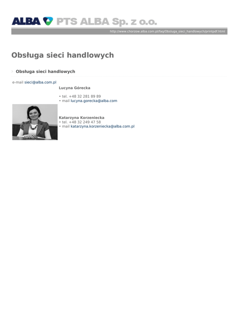 http://www.chorzow.alba.com.pl/faq/Obsluga_sieci_handlowych/printpdf.html Obsługa sieci handlowych Obsługa sieci handlowych e-mail [email protected] Lucyna Górecka • tel. +48 32 281 89 89 • mail [email protected] Katarzyna Korzeniecka • tel. +48 32 249 47 58 • mail [email protected]