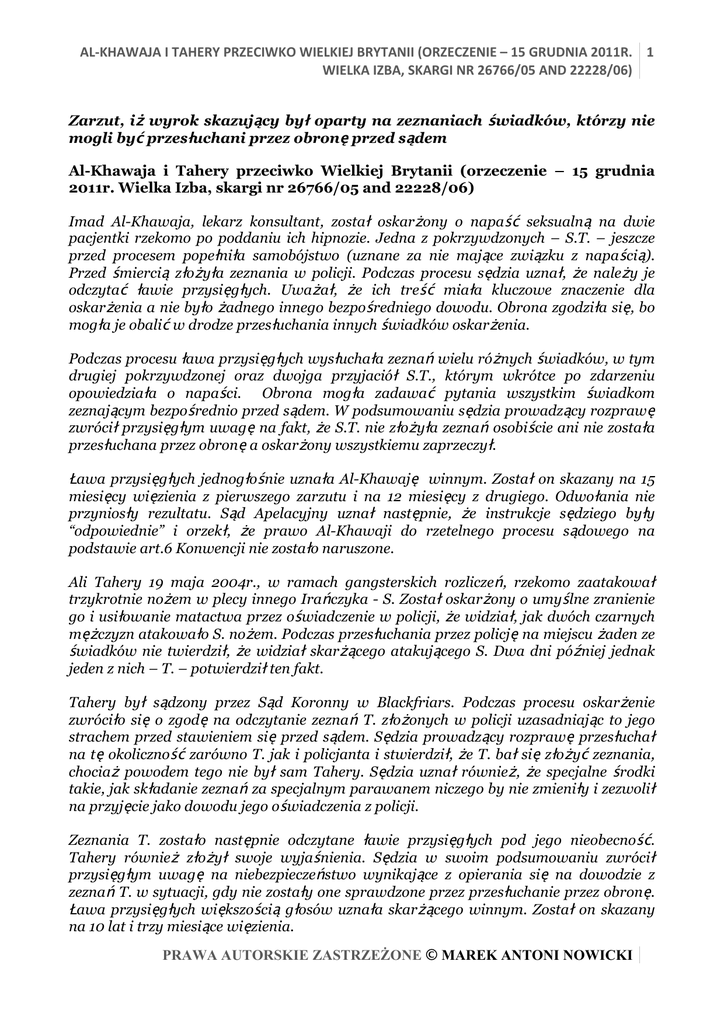 AL-‐KHAWAJA I TAHERY PRZECIWKO WIELKIEJ BRYTANII (ORZECZENIE – 15 GRUDNIA 2011R. 1 WIELKA IZBA, SKARGI NR 26766/05 AND 22228/06) Zarzut, iż wyrok skazujący był oparty na zeznaniach świadków, którzy nie mogli być przesłuchani przez obronę przed sądem Al-Khawaja i Tahery przeciwko Wielkiej Brytanii (orzeczenie – 15 grudnia 2011r. Wielka Izba, skargi nr 26766/05 and 22228/06) Imad Al-Khawaja, lekarz konsultant, został oskarżony o napaść seksualną na dwie pacjentki rzekomo po poddaniu ich hipnozie. Jedna z pokrzywdzonych – S.T. – jeszcze przed procesem popełniła samobójstwo (uznane za nie mające związku z napaścią). Przed śmiercią złożyła zeznania w policji. Podczas procesu sędzia uznał, że należy je odczytać ławie przysięgłych. Uważał, że ich treść miała kluczowe znaczenie dla oskarżenia a nie było żadnego innego bezpośredniego dowodu. Obrona zgodziła się, bo mogła je obalić w drodze przesłuchania innych świadków oskarżenia. Podczas procesu ława przysięgłych wysłuchała zeznań wielu różnych świadków, w tym drugiej pokrzywdzonej oraz dwojga przyjaciół S.T., którym wkrótce po zdarzeniu opowiedziała o napaści. Obrona mogła zadawać pytania wszystkim świadkom zeznającym bezpośrednio przed sądem. W podsumowaniu sędzia prowadzący rozprawę zwrócił przysięgłym uwagę na fakt, że S.T. nie złożyła zeznań osobiście ani nie została przesłuchana przez obronę a oskarżony wszystkiemu zaprzeczył. Ława przysięgłych jednogłośnie uznała Al-Khawaję winnym. Został on skazany na 15 miesięcy więzienia z pierwszego zarzutu i na 12 miesięcy z drugiego. Odwołania nie przyniosły rezultatu. Sąd Apelacyjny uznał następnie, że instrukcje sędziego były “odpowiednie” i orzekł, że prawo Al-Khawaji do rzetelnego procesu sądowego na podstawie art.6 Konwencji nie zostało naruszone. Ali Tahery 19 maja 2004r., w ramach gangsterskich rozliczeń, rzekomo zaatakował trzykrotnie nożem w plecy innego Irańczyka - S. Został oskarżony o umyślne zranienie go i usiłowanie matactwa przez oświadczenie w policji, że widział, jak dwóch czarnych mężczyzn atakowało S. nożem. Podczas przesłuchania przez policję na miejscu żaden ze świadków nie twierdził, że widział skarżącego atakującego S. Dwa dni później jednak jeden z nich – T. – potwierdził ten fakt. Tahery był sądzony przez Sąd Koronny w Blackfriars. Podczas procesu oskarżenie zwróciło się o zgodę na odczytanie zeznań T. złożonych w policji uzasadniając to jego strachem przed stawieniem się przed sądem. Sędzia prowadzący rozprawę przesłuchał na tę okoliczność zarówno T. jak i policjanta i stwierdził, że T. bał się złożyć zeznania, chociaż powodem tego nie był sam Tahery. Sędzia uznał również, że specjalne środki takie, jak składanie zeznań za specjalnym parawanem niczego by nie zmieniły i zezwolił na przyjęcie jako dowodu jego oświadczenia z policji. Zeznania T. zostało następnie odczytane ławie przysięgłych pod jego nieobecność. Tahery również złożył swoje wyjaśnienia. Sędzia w swoim podsumowaniu zwrócił przysięgłym uwagę na niebezpieczeństwo wynikające z opierania się na dowodzie z zeznań T. w sytuacji, gdy nie zostały one sprawdzone przez przesłuchanie przez obronę. Ława przysięgłych większością głosów uznała skarżącego winnym. Został on skazany na 10 lat i trzy miesiące więzienia. PRAWA AUTORSKIE ZASTRZEŻONE © MAREK ANTONI NOWICKI 2 AL-‐KHAWAJA I TAHERY PRZECIWKO WIELKIEJ BRYTANII (ORZECZENIE – 15 GRUDNIA 2011R. WIELKA IZBA, SKARGI NR 26766/05 AND 22228/06) Tahery odwołał się twierdząc, że jego prawo do rzetelnego procesu sądowego zostało naruszone, bo nie miał możliwości przesłuchania świadka T. Sąd Apelacyjny przyznał, że perspektywa skazania byłaby mniejsza – aż do uniewinnienia – gdyby dowód z oświadczenia T. nie został dopuszczony. Nie dopatrzył się jednak żadnej nierzetelności, bo obrona mogła przesłuchać innych świadków oskarżenia, istniały również wyjaśnienia samego Taheriego oraz możliwość wezwania innych osób, które przypadkowo znalazły się na miejscu zdarzenia. Poza tym sędzia prowadzący rozprawę udzielił wyraźnych instrukcji przysięgłym, w jaki sposób powinni traktować kwestionowane zeznania T. W skardze do Trybunału, powołując się na art.6 ust.1 i ust.3 lit. d Konwencji, skarżący zarzucili, że ich skazania były oparte w rozstrzygającym stopniu na zeznaniach świadków, których nie mogli przesłuchać przed sądem i w rezultacie zostali pozbawieni rzetelnego procesu sądowego. Izba (Sekcja IV) 20 stycznia 2009r. orzekła jednogłośnie, że doszło do naruszenia. Na wniosek rządu brytyjskiego sprawa została przyjęta do rozpatrzenia przez Wielką Izbę. Trybunał przypomniał, że wymagania art.6 ust.3 lit. d są szczególnymi aspektami prawa do rzetelnego procesu sądowego zagwarantowanego w ust.1, który musi być brany pod uwagę przy ocenie rzetelności postępowania. Poza tym przy badaniu zarzutu na podstawie art. 6 ust.1 Trybunał ma w istocie obowiązek stwierdzić, czy dane postępowanie karne jako całość było rzetelne. Dokonując tego Trybunał ocenia poszanowanie nie tylko prawa do obrony ale również interes ogółu i ofiar w tym, aby przestępstwa były właściwie ścigane, a w razie potrzeby także prawa świadków. Przypomniał przy tym, że dopuszczalność dowodów uzależniona jest od regulacji prawa krajowego i od sądów krajowych a jedynym zadaniem Trybunału jest ocena, czy postępowanie było prowadzone rzetelnie. Art.6 ust.3 lit. d zawiera zasadę, z której wynika, że zanim oskarżony zostanie skazany, wszystkie dowody przeciwko niemu muszą zwykle być przedstawione w jego obecności na publicznej rozprawie z zapewnieniem kontradyktoryjności. Wyjątki od tej zasady są możliwe, nie mogą jednak naruszać prawa do obrony, które z