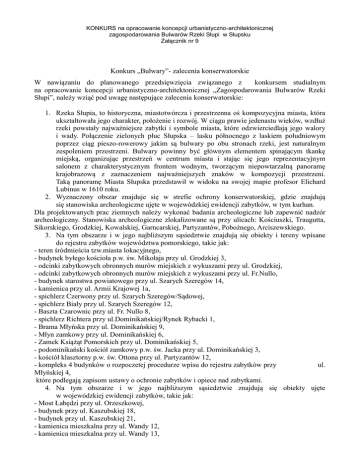 KONKURS na opracowanie koncepcji urbanistyczno-architektonicznej zagospodarowania Bulwarów Rzeki Słupi w Słupsku Załącznik nr 9 Konkurs „Bulwary”- zalecenia konserwatorskie W nawiązaniu do planowanego przedsięwzięcia związanego z konkursem studialnym na opracowanie koncepcji urbanistyczno-architektonicznej „Zagospodarowania Bulwarów Rzeki Słupi”, należy wziąć pod uwagę następujące zalecenia konserwatorskie: 1. Rzeka Słupia, to historyczna, miastotwórcza i przestrzenna oś kompozycyjna miasta, która ukształtowała jego charakter, położenie i rozwój. W ciągu prawie jedenastu wieków, wzdłuż rzeki powstały najważniejsze zabytki i symbole miasta, które odzwierciedlają jego walory i wady. Połączenie zielonych płuc Słupska – lasku północnego z laskiem południowym poprzez ciąg pieszo-rowerowy jakim są bulwary po obu stronach rzeki, jest naturalnym zespoleniem przestrzeni. Bulwary powinny być głównym elementem spinającym tkankę miejską, organizując przestrzeń w centrum miasta i stając się jego reprezentacyjnym salonem z charakterystycznym frontem wodnym, tworzącym niepowtarzalną panoramę krajobrazową z zaznaczeniem najważniejszych znaków w kompozycji przestrzeni. Taką panoramę Miasta Słupska przedstawił w widoku na swojej mapie profesor Elichard Lubinus w 1610 roku. 2. Wyznaczony obszar znajduje się w strefie ochrony konserwatorskiej, gdzie znajdują się stanowiska archeologiczne ujęte w wojewódzkiej ewidencji zabytków, w tym kurhan. Dla projektowanych prac ziemnych należy wykonać badania archeologiczne lub zapewnić nadzór archeologiczny. Stanowiska archeologiczne zlokalizowane są przy ulicach: Kościuszki, Traugutta, Sikorskiego, Grodzkiej, Kowalskiej, Garncarskiej, Partyzantów, Pobożnego, Arciszewskiego. 3. Na tym obszarze i w jego najbliższym sąsiedztwie znajdują się obiekty i tereny wpisane do rejestru zabytków województwa pomorskiego, takie jak: - teren śródmieścia tzw.miasta lokacyjnego, - budynek byłego kościoła p.w. św. Mikołaja przy ul. Grodzkiej 3, - odcinki zabytkowych obronnych murów miejskich z wykuszami przy ul. Grodzkiej, - odcinki zabytkowych obronnych murów miejskich z wykuszami przy ul. Fr.Nullo, - budynek starostwa powiatowego przy ul. Szarych Szeregów 14, - kamienica przy ul. Armii Krajowej 1a, - spichlerz Czerwony przy ul. Szarych Szeregów/Sądowej, - spichlerz Biały przy ul. Szarych Szeregów 12, - Baszta Czarownic przy ul. Fr. Nullo 8, - spichlerz Richtera przy ul.Dominikańskiej/Rynek Rybacki 1, - Brama Młyńska przy ul. Dominikańskiej 9, - Młyn zamkowy przy ul. Dominikańskiej 6, - Zamek Książąt Pomorskich przy ul. Dominikańskiej 5, - podominikański kościół zamkowy p.w. św. Jacka przy ul. Dominikańskiej 3, - kościół klasztorny p.w. św. Ottona przy ul. Partyzantów 12, - kompleks 4 budynków o rozpoczetej procedurze wpisu do rejestru zabytków przy ul. Młyńskiej 4, które podlegają zapisom ustawy o ochronie zabytków i opiece nad zabytkami. 4. Na tym obszarze i w jego najbliższym sąsiedztwie znajdują się obiekty ujęte w wojewódzkiej ewidencji zabytków, takie jak: - Most Łabędzi przy ul. Orzeszkowej, - budynek przy ul. Kaszubskiej 18, - budynek przy ul. Kaszubskiej 21, - kamienica mieszkalna przy ul. Wandy 12, - kamienica mieszkalna przy ul. Wandy 13, - kamienica mieszkalna przy ul. Wandy 23, - kamienica mieszkalna przy ul. Wandy 24, - kamienica mieszkalna przy ul. Podchorążych 6, - willa mieszkalna przy ul. Traugutta 15, - willa mieszkalna przy ul. Traugutta 16, - willa mieszkalna przy ul. Traugutta 17, - willa mieszkalna przy ul. Traugutta 18, - willa mieszkalna przy ul. Traugutta 19, - willa mieszkalna przy ul. Traugutta 20, - budynek dydaktyczny przy ul. Kościuszki 1, - kamienica mieszkalna przy ul. Gwardii Ludowej 4, - kamienica przy ul. Krakusa 1, - kamienica przy ul. Szarych Szeregów 1, - kamienica mieszkalna przy ul. Szarych Szeregów 3, - kamienica mieszkalna przy ul. Szarych Szeregów 4, - kamienica mieszkalna przy ul. Szarych Szeregów 5, - kamienica przy ul. Szarych Szeregów 8, - budynek przy ul. Szarych Szeregów 13, - budynek dydaktyczny przy ul. Szarych Szeregów 15, - kamienica mieszkalna przy ul. Grodzkiek 9, - kamienica mieszkalna przy ul. Grodzkiej 10, - kamienica mieszkalna przy ul. Grodzkiej 11, - kamienica przy ul. Armii Krajowej 1, - kamienica mieszkalna przy ul. Fr.Nullo 7, - budynek przy ul.Młyńskiej 2, - kamienica mieszkalna przy ul. Zamkowej 1a, - kamienica mieszkalna przy ul. Zamkowej 5, - kamienica mieszkalna przy ul. Zamkowej 6, - willa mieszkalna przy ul. Nad Śluzami 1, - willa mieszkalna przy ul. Arciszewskiego 5, - willa mieszkalna przy ul. Arciszewskiego 11, - willa mieszkalna przy ul. Arciszewskiego 13, - willa mieszkalna przy ul. Arciszewskiego 14, - willa mieszkalna przy ul. Arciszewskiego 16, - willa mieszkalna przy ul. Arciszewskiego 17, - willa mieszkalna przy ul. Arciszewskiego 19, - willa mieszkalna przy ul. Arciszewskiego 21a, dla których obowiązuje zachowanie i ochrona bryły oraz elewacji, zachowanie pierwotnej formy i linii zbudowy. Projektowane kompozycje i obiekty oraz uzupełnienia historycznych pierzei powinny nawiązywać do istniejącej zabytkowej zabudowy. Muszą one uzyskać pozytywną opinię konserwatorską. 5. Na tym obszarze i w jego najbliższym sąsiedztwie znajdują się obiekty ujęte w miejskiej ewidencji zabytków, takie jak: - kamienica mieszkalna przy ul. Kościuszki 21, - kamienica mieszkalna przy ul. Traugutta 21, - kamienica mieszkalna przy ul. Wandy 3, - budynek przy ul. Kaszubskiej 16 - kamienica przy ul. Krakusa 4, - kamienica przy ul. Krakusa 5, - kamienica przy ul. Kilińskiego 2, - kamienica mieszkalna przy ul. Kilińskiego 6, - kamienica przy ul. Kilińskiego 43a, - kamienica przy ul. Kilińskiego 44, - kamienica mieszkalna przy ul. Kilińskiego 46, - kamienica mieszkalna przy ul. Szarych Szeregów 6, - kamienica mieszkalna przy ul. Szarych Szeregów 7, - kamie