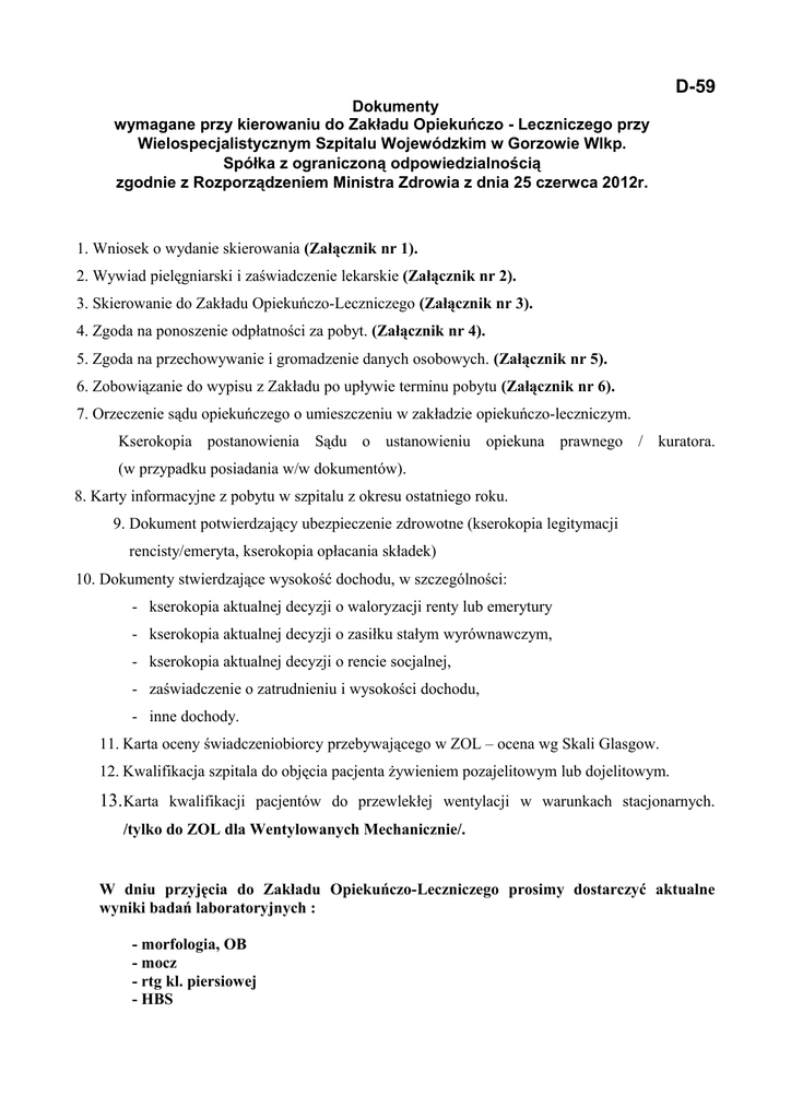 D-59 Dokumenty wymagane przy kierowaniu do Zakładu Opiekuńczo - Leczniczego przy Wielospecjalistycznym Szpitalu Wojewódzkim w Gorzowie Wlkp. Spółka z ograniczoną odpowiedzialnością zgodnie z Rozporządzeniem Ministra Zdrowia z dnia 25 czerwca 2012r. 1. Wniosek o wydanie skierowania (Załącznik nr 1). 2. Wywiad pielęgniarski i zaświadczenie lekarskie (Załącznik nr 2). 3. Skierowanie do Zakładu Opiekuńczo-Leczniczego (Załącznik nr 3). 4. Zgoda na ponoszenie odpłatności za pobyt. (Załącznik nr 4). 5. Zgoda na przechowywanie i gromadzenie danych osobowych. (Załącznik nr 5). 6. Zobowiązanie do wypisu z Zakładu po upływie terminu pobytu (Załącznik nr 6). 7. Orzeczenie sądu opiekuńczego o umieszczeniu w zakładzie opiekuńczo-leczniczym. Kserokopia postanowienia Sądu o ustanowieniu opiekuna prawnego / kuratora. (w przypadku posiadania w/w dokumentów). 8. Karty informacyjne z pobytu w szpitalu z okresu ostatniego roku. 9. Dokument potwierdzający ubezpieczenie zdrowotne (kserokopia legitymacji rencisty/emeryta, kserokopia opłacania składek) 10. Dokumenty stwierdzające wysokość dochodu, w szczególności: - kserokopia aktualnej decyzji o waloryzacji renty lub emerytury - kserokopia aktualnej decyzji o zasiłku stałym wyrównawczym, - kserokopia aktualnej decyzji o rencie socjalnej, - zaświadczenie o zatrudnieniu i wysokości dochodu, - inne dochody. 11. Karta oceny świadczeniobiorcy przebywającego w ZOL – ocena wg Skali Glasgow. 12. Kwalifikacja szpitala do objęcia pacjenta żywieniem pozajelitowym lub dojelitowym. 13. Karta kwalifikacji pacjentów do przewlekłej wentylacji w warunkach stacjonarnych. /tylko do ZOL dla Wentylowanych Mechanicznie/. W dniu przyjęcia do Zakładu Opiekuńczo-Leczniczego prosimy dostarczyć aktualne wyniki badań laboratoryjnych : - morfologia, OB - mocz - rtg kl. piersiowej - HBS Załącznik nr 3 SKIEROWANIE DO ZAKŁADU OPIEKUŃCZO-LECZNICZEGO ZAKŁADU PIELĘGNACYJNO-OPIEKUŃCZEGO* Niniejszym kieruję: ................................................................................................................................................................ Imię i Nazwisko świadczeniobiorcy ................................................................................................................................................................ Adres zamieszkania świadczeniobiorcy ................................................................................................................................................................ Adres do korespondencji (jeżeli jest inny niż adres zamieszkania) ................................................................................................................................................................ Nr telefonu do kontaktu ................................................................................................................................................................ numer PESEL świadczeniobiorcy, a w przypadku jego braku – numer dokumentu potwierdzającego tożsamość świadczeniobiorcy ................................................................................................................................................................ Rozpoznanie w języku polskim według ICD-10 (Choroba zasadnicza i choroby współistniejące) ................................................................................................................................................................ Dotychczasowe leczenie Potrzeba kontynuacji dotychczasowego leczenia (tak/nie)* Liczba punktów w skali Barthel, którą uzyskał świadczeniobiorca**................................................... Przypadek nagły, wynikający ze zdarzeń losowych i uzasadniony stanem zdrowia (tak/nie)* ................................................................................................................................................................ Lekarz podstawowej opieki zdrowotnej świadczeniobiorcy (imię, nazwisko, nr telefonu ,adres POZ)*** ................................................................................................................................................................ Pielęgniarka podstawowej opieki zdrowotnej świadczeniobiorcy (imię, nazwisko, nr telefonu do kontaktu, adres POZ)*** - do zakładu opiekuńczo-leczniczego/zakładu pielęgnacyjno-opiekuńczego * .................................................... .............................................................................................. Miejscowość, data Podpis lekarza ubezpieczenia zdrowotnego oraz pieczęć podmiotu leczniczego, w przypadku gdy lekarz ubezpieczenia zdrowotnego wykonuje zawód w tym podmiocie *Niepotrzebne skreślić ** Jeżeli jest wymagana. *** Fakultatywnie, na wniosek świadczeniobiorcy. Załącznik nr 2 WYWIAD PILĘGNIARSKI I ZAŚWIADCZENIE LEKARSKIE WYWIAD PILĘGNIARSKI 1. Dane świadczeniobiorcy ................................................................................................................................................... Imię i Nazwisko ................................................................................................................................................... Adres zamieszkania ................................................................................................................................................... numer PESEL, a w przypadku jego braku – numer dokumentu potwierdzającego tożsamość 2. Rozpoznanie problemów z zakresu pielęgnacji (zaznaczyć właściwe, ewentualnie opisać): a) odżywianie − samodzielny/przy pomocy/utrudnienia* karmienie przez gastronomię lub zgłębnik.......................................................................... karmienie pacjenta z zaburzonym połykaniem.................................................................... zakładanie zgłębnika.......................................................