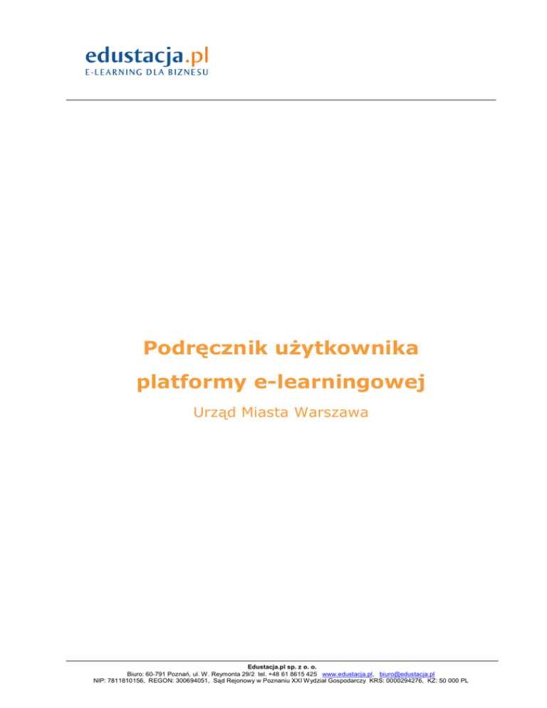 Podręcznik użytkownika platformy e-learningowej Urząd Miasta Warszawa Edustacja.pl sp. z o. o. Biuro: 60-791 Poznań, ul. W. Reymonta 29/2 tel. +48 61 8615 425 www.edustacja.pl, [email protected] NIP: 7811810156, REGON: 300694051, Sąd Rejonowy w Poznaniu XXI Wydział Gospodarczy KRS: 0000294276, KZ: 50 000 PL Niniejszy dokument jest przeznaczony dla użytkowników końcowych platformy e-learningowej Edustacja.pl. Poza ogólnymi informacjami dotyczącymi e-learningu i platformy, czytelnik będzie mógł zapoznać się z: technicznymi wymaganiami, jakie musi spełniać jego komputer, niezbędnymi do optymalnej pracy ze szkoleniami, instrukcją logowania na platformę, krótkim opisem menu platformy, listą najczęściej zadawanych pytań związanych z obsługa platformy e-learningowej, słownikiem pojęć związanych ze szkoleniami w formule e-learning i używanych w tym dokumencie. Edustacja.pl sp. z o. o. Biuro: 60-791 Poznań, ul. W. Reymonta 29/2 tel. +48 61 8615 425 www.edustacja.pl, [email protected] NIP: 7811810156, REGON: 300694051, Sąd Rejonowy w Poznaniu XXI Wydział Gospodarczy KRS: 0000294276, KZ: 50 000 PL Platforma e-learningowa Edustacja.pl to aplikacja webowa pozwalająca użytkownikom szkolenia zdobywać wiedzę przy pomocy komputera podłączonego do sieci Internet. Zaletą takiego rozwiązania jest dostęp do materiałów o każdej porze dnia praktycznie z każdego miejsca przy pomocy standardowej przeglądarki internetowej (instalacja dodatkowego oprogramowania nie jest wymagana). Pozwala to także na indywidualizację procesu nauczania, w którym każdy użytkownik może uczyć się w swoim własnym tempie. Warto zauważyć, że zastosowanie platformy e-learningowej do nauki wiąże się z minimalizacją czasu i kosztów potrzebnych na podróżowanie do/z miejsca szkolenia w przypadku szkoleń tradycyjnych. Edustacja.pl sp. z o. o. Biuro: 60-791 Poznań, ul. W. Reymonta 29/2 tel. +48 61 8615 425 www.edustacja.pl, [email protected] NIP: 7811810156, REGON: 300694051, Sąd Rejonowy w Poznaniu XXI Wydział Gospodarczy KRS: 0000294276, KZ: 50 000 PL Wymagania techniczne dla użytkownika końcowego Edustacja.pl sp. z o. o. Biuro: 60-791 Poznań, ul. W. Reymonta 29/2 tel. +48 61 8615 425 www.edustacja.pl, [email protected] NIP: 7811810156, REGON: 300694051, Sąd Rejonowy w Poznaniu XXI Wydział Gospodarczy KRS: 0000294276, KZ: 50 000 PL Aby korzystać z platformy e-learningowej, sprzęt użytkownika końcowego powinien spełniać następujące wymagania: system operacyjny: o Microsoft Windows (98, ME, 2000, XP, Vista, 7) o Linux (Red Hat Enterprise 5, OpenSuse 11, Ubuntu 7.11), przeglądarka internetowa: o Mozilla Firefox 2+, (zalecana przez Edustacja.pl!) o Internet Explorer 6.0+, o Opera 9.5+, o Safari 3.x+, o Chrome 2.x+, Adobe FlashPlayer (10.0.x), włączona obsługa: o cookies, o JavaScript, o Adobe FlashPlayer, o Java. minimalna rozdzielczość ekranu: 1024 x 768 Edustacja.pl sp. z o. o. Biuro: 60-791 Poznań, ul. W. Reymonta 29/2 tel. +48 61 8615 425 www.edustacja.pl, [email protected] NIP: 7811810156, REGON: 300694051, Sąd Rejonowy w Poznaniu XXI Wydział Gospodarczy KRS: 0000294276, KZ: 50 000 PL Logowanie na platformę Edustacja.pl sp. z o. o. Biuro: 60-791 Poznań, ul. W. Reymonta 29/2 tel. +48 61 8615 425 www.edustacja.pl, [email protected] NIP: 7811810156, REGON: 300694051, Sąd Rejonowy w Poznaniu XXI Wydział Gospodarczy KRS: 0000294276, KZ: 50 000 PL Aby zalogować się na platformę należy: 1. Uruchomić przeglądarkę internetową (np. Mozilla Firefox), 2. Do pola tekstowego przeglądarki z adresem strony internetowej wprowadzić przy pomocy następujący adres: http://platforma.edustacja.pl/?org=URZAD_MIASTA_WARSZAWA Wprowadzić przy pomocy klawiatury login i hasło otrzymane mailem. Kliknąć lewym przyciskiem myszy na przycisk ZALOGUJ, 3. Jeżeli dane zostały wpisane poprawnie, w oknie przeglądarki zostanie wyświetlona strona główna platformy. Na środku pojawią się tytuły szkoleń. Po kliknięciu w ikonkę ”uruchom szkolenie” uczestnik zostanie przekierowany na stronę danego szkolenia. Po prawej stronie są umieszczone materiały szkoleniowe, należy kliknąć „uruchom szkolenie”. Edustacja.pl sp. z o. o. Biuro: 60-791 Poznań, ul. W. Reymonta 29/2 tel. +48 61 8615 425 www.edustacja.pl, [email protected] NIP: 7811810156, REGON: 300694051, Sąd Rejonowy w Poznaniu XXI Wydział Gospodarczy KRS: 0000294276, KZ: 50 000 PL Krótki opis Menu platformy e-learningowej Edustacja.pl sp. z o. o. Biuro: 60-791 Poznań, ul. W. Reymonta 29/2 tel. +48 61 8615 425 www.edustacja.pl, [email protected] NIP: 7811810156, REGON: 300694051, Sąd Rejonowy w Poznaniu XXI Wydział Gospodarczy KRS: 0000294276, KZ: 50 000 PL Strona główna – powrót do strony głównej platformy, Mój profil – dane osobowe użytkownika, jego opis, zdjęcie i profil WWW, Poczta – wewnętrzny komunikator platformy e-learningowej pozwalający na komunikację z innymi uczestnikami szkolenia oraz wykładowcami, Forum – fora dyskusyjne dedykowane poszczególnym przedmiotom szkolenia i sprawom technicznym, Raporty – miejsce, gdzie dostępne są raporty z wyników uzyskanych przez użytkownika z testów podsumowujących szkolenie, niedostępny dla uczestników. Pomoc – tutaj znajdą Państwo system, który umożliwi zadawanie pytań. Edustacja.pl sp. z o. o. Biuro: 60-791 Poznań, ul. W. Reymonta 29/2 tel. +48 61 8615 425 www.edustacja.pl, [email protected] NIP: 7811810156, REGON: 300694051, Sąd Rejonowy w Poznaniu XXI Wydział Gospodarczy KRS: 0000294276, KZ: 50 000 PL FAQ – Frequently Asked Questions, czyli lista najczęściej zadawanych pytań związanych z obsługą platformy e-learningowej Edustacja.pl sp. z o. o. Biuro: 60-791 Poznań, ul. W. Reymonta 29/2 tel. +48 61 8615 425 www.edustacja.pl, [email protected] NIP: 7811810156, REGON: 300694051, Sąd Rejonowy w Poznaniu XXI Wydział Gospodarczy KRS: 0000294276, KZ: 50 000 PL 1. Dlaczego nie mogę się zalogow