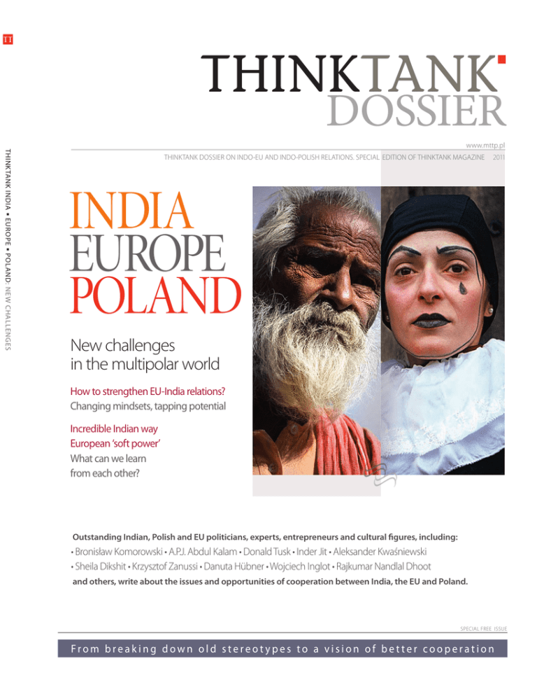 Dossier THINKTANK INDIA EUROPE POLAND: NEW CHALLENGES www.mttp.pl THINKTANK DOSSIER ON INDO-EU AND INDO-POLISH RELATIONS. SPECIAL EDITION OF THINKTANK MAGAZINE 2011 IndiA Europe Poland New challenges in the multipolar world How to strengthen EU-India relations? Changing mindsets, tapping potential Incredible Indian way European ‘soft power’ What can we learn from each other? •• Outstanding Indian, Polish and EU politicians, experts, entrepreneurs and cultural figures, including: • Bronisław Komorowski • A.P.J. Abdul Kalam • Donald Tusk • Inder Jit • Aleksander Kwaśniewski • Sheila Dikshit • Krzysztof Zanussi • Danuta Hübner • Wojciech Inglot • Rajkumar Nandlal Dhoot and others, write about the issues and opportunities of cooperation between India, the EU and Poland. special free issue From breaking down old stereotypes to a vision of better cooperation Jugaad In Hindi, this word has many meanings and signifies, among other things, f i g u r e s ‘creative solving’ – that is, cheaply and effectively making use of available resources. It also denotes the ability to find a solution that gets around the existing limitations. Indian businessmen have been educated in the West or in native institutions patterned on the best global models. INDIA 478 million This is the number of India’s labour force THINKTANK RECOMMENDATIONS Poland-Europe-India: the need for a different perception Both Unions – the European and Indian – are a little over 60 years old. During this time they have evolved from a vision that carries the masses, as is usual at the outset of great political projects, to daily laboriousness in the face of internal and external challenges. Today, these two civilisational spaces are meeting again, so to speak, in a new situation. Globalisation and the growth of information and communication technology have brought continents closer not only in the geographical sense but the mental one as well. The fall of communism ended the bipolar division of the world and made possible changes on the political map of the world. In Europe this led to the unification of the artificially separated East and West into the European Union of 27-plus. In India, the economy was liberalised and reforms were introduced that opened up the market. Today, both unions are at a crossroad and are searching for their place on the global chessboard in the new geopolitical and socio-cultural conditions. Both can learn much from each other using existing political, economic and social solution models and from the experiences in their application. In the present analysis – the result of repeated visits to India and discussions with Polish and Indian political and economic leaders – THINKTANK recommends that politicians and business people in both countries strengthen their mutual relations and use advantages they have overlooked until now. The European Union and the Union of India need each other in order to better understand the global world and to find answers to its challenges. In the present century, this relationship has to be based on new premises, however. New ties can be established through the reinforcement of relations between India and countries of East-Central Europe. The latter are not burdened by a colonial past and are sensitive to matters of independence, they understand the socialist legacy of the Republic of India’s first years better than the West does, and their approach to family, spiritual and social values is similar to India’s. Poland – the largest country of this region – can play a crucial role in this dialogue and enable an enlarged Europe to understand and appreciate the new India and vice versa. 2011 T H I N K TA N K D O S S I E R I n d i a _ E U _ P o l a n d 1 CONTENTS 14 Redesigning a path of better cooperation Both Unions – the Indian and the European – emerged on the basis of a great vision. Today, in the new international situation, it makes sense to establish relations anew. Why is a closer political and economic alliance between the world’s two largest democracies necessary? 23 India, Europe and Poland in the broader world The European Union, in which Poland is beginning to play a major role, is one of India’s most important economic partners. How could this increasing closeness be used to enhance mutual relations? 33 REDISCOVERING EACH OTHER’S POTENTIAL Closer looks at the opportunities and challenges of cooperation, by: Donald Tusk, Bogusław Zaleski, Maciej Popowski, Arvind Kumar, Andrzej K. Koźmiński, Inder Jit, Aleksander Kwaśniewski, Sheila Dikshit, Danuta Hübner, Bishwanath Goldar, Sanjay Dalmia, Wojciech Inglot, J.J. Singh, Seema Bhardwaj, Rajeev Dubey, Rajkumar Nandlal Dhoot, Pirouzan Parvine, Arvind Bali, Magdalena Sroka, Krzysztof Zanussi. New ideas and inspirations for political, cultural and economic cooperation between the EU and India and between India and Poland. 91 NEW VISIONS OF THE FUTURE “Europe should devote itself to the imperative of caring for its vitality and dynamism. This is my vision of Europe: vital, open, strategically mature and independent” – writes Bronisław Komorowski, President of Poland. “We must abandon conventional thinking and seek innovative and out-of-the-box solutions” – writes A.P.J. Abdul Kalam, former President of India. 2 T H I N K TA N K D O S S I E R I n d i a _ E U _ P o l a n d 2011 THINKTANK THE NET WORKS New ideas and trends for leaders in Poland Leadership, innovation, smart growth • Conferences, reports and programmes created together with business and institutions • THINKTANK Magazine – a quarterly for top executives and leaders in the public sector • Discussing the best/new ideas: roundtable discussions and ideas for growth • A network that works: a vivid space for the best experts and thinkers in Poland • Top events on the idea market (e.g. European Forum of New Ideas) Find out more about us: www.mttp.pl AU T H O R S / C O M M E N T S Arvi