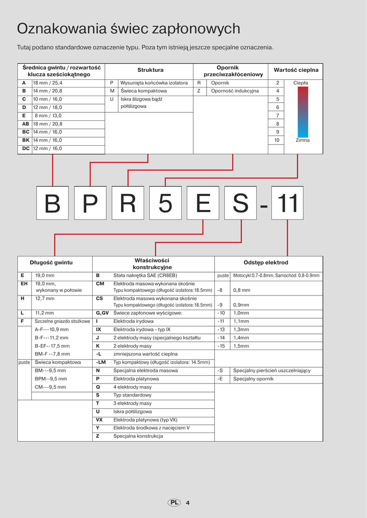 Oznakowania świec zapłonowych Tutaj podano standardowe oznaczenie typu. Poza tym istnieją jeszcze specjalne oznaczenia. Średnica gwintu / rozwartość klucza sześciokątnego Opornik przeciwzakłóceniowy Struktura Wartość cieplna A 18 mm / 25,4 P Wysunięta końcówka izolatora R Opornik 2 B 14 mm / 20,8 M Świeca kompaktowa Z Oporność indukcyjna 4 C 10 mm / 16,0 U D 12 mm / 18,0 Iskra ślizgowa bądź półślizgowa E 8 mm / 13,0 Ciepła 5 6 7 AB 18 mm / 20,8 8 BC 14 mm / 16,0 9 BK 14 mm / 16,0 10 Zimna DC 12 mm / 16,0 B P R 5 E S - 11 Właściwości konstrukcyjne Długość gwintu Odstęp elektrod E 19,0 mm B Stała nakrętka SAE (CR8EB) puste Motocykl:0.7-0.8mm, Samochód: 0.8-0.9mm EH 19,0 mm, wykonany w połowie CM Elektroda masowa wykonana skośnie Typu kompaktowego (długość izolatora:18.5mm) -8 0,8 mm H 12,7 mm CS Elektroda masowa wykonana skośnie Typu kompaktowego (długość izolatora:18.5mm) -9 0,9mm L 11,2 mm G,GV Świece zapłonowe wyścigowe: -10 1,0mm F puste Szczelne gniazdo stożkowe I Elektroda irydowa -11 1,1mm A-F---10,9 mm IX Elektroda irydowa - typ IX -13 1,3mm B-F---11,2 mm J 2 elektrody masy (specjalnego kształtu -14 1,4mm -15 1,5mm B-EF--17,5 mm K 2 elektrody masy BM-F --7,8 mm -L zmniejszona wartość cieplna Świeca kompaktowa -LM Typ kompaktowy (długość izolatora: 14.5mm) BM---9,5 mm N Specjalna elektroda masowa -S Specjalny pierścień uszczelniający BPM--9,5 mm P Elektroda platynowa -E Specjalny opornik CM---9,5 mm Q 4 elektrody masy S Typ standardowy T 3 elektrody masy U Iskra półślizgowa VX Elektroda platynowa (typ VX) Y Elektroda środkowa z nacięciem V Z Specjalna konstrukcja PL 4 Oznakowania świec zapłonowych Tutaj podano standardowe oznaczenie typu. Poza tym istnieją jeszcze specjalne oznaczenia. Wymiary gwintów i rozwartość klucza sześciokątnego Typ świecy D Wysoka zdolność zapłonu, Podwójne, cienkie elektrody KA I Świeca irydowa KB L Długi gwint MA P Świeca platynowa NA S Wysoka zdolność zapłonu, kwadratowe końcówki elektrod Zwiększony odstep elektrod Ø12.0 19,0mm Pierścień uszczelniający 14,0 Ø12.0 19,0 mm Pierścień uszczelniający Bi-Hex 14.0 Ø10.0 19,0 mm Pierścień uszczelniający 14,0 Ø12.0 17,5 mm Szczelne gniazdo stożkowe 14,0 F Ø14.0 19,0 mm Pierścień uszczelniający 16,0 G Ø14.0 19,0 mm Pierścień uszczelniający 20,8 Powyższe oznaczenia J Ø12.0 19,0 mm Pierścień uszczelniający 18,0 mogą być łączone K Ø12.0 19,0 mm Pierścień uszczelniający 16,0 np. ILFR…, PLZFR… L Ø10.0 12,7 mm Pierścień uszczelniający 16,0 "L", oznacza szczególnie długi gwint i znajduje M Ø10.0 19,0 mm Pierścień uszczelniający 16,0 się przed wszystkimi innymi T Ø14.0 17,5 mm Szczelne gniazdo stożkowe 16,0 literami oznaczenia długości. U Ø14.0 11,2 mm Szczelne gniazdo stożkowe 16,0 n.p. W Ø18.0 10,9 mm Szczelne gniazdo stożkowe 20,8 • świeca z pierścieniem uszczelniającym X Ø14.0 9,5 mm Pierścień uszczelniający 20,8 Y Ø14.0 11,.2 mm Szczelne gniazdo stożkowe 16,0 Z FR5AP-11; długość gwintu 19.0mm LFR5AP-11; długość gwintu 26.5mm • świeca ze szczelnym gniazdem stożkowym PTR5C-13; długość gwintu 17.5mm PLTR6A-10G; długość gwintu 25.0mm P F R 5 A - 11 Opornik przeciwzakłóceniowy R Opornik Wartość cieplna 2 Konstrukcja Ciepła A,B,C… kod przyrostka 4 Cechy specjalne 5 Świeca irydowa (jedna elektroda) 6 I 7 P Świeca platynowa (jedna elektroda) 8 9 10 Zimna PL 5 Odstęp elektrod puste Motocykl: 0,7-0,8mm Samochód: 0.8-0.9mm - 7 0,7 mm - 9 0,9 mm -10 1,0 mm -11 1,1 mm -13 1,3 mm -14 1,4 mm -15 1,5 mm -A brak pierścienia uszczelniającego -D specjalna obudowa ulepszana cieplnie -E Specjalny opornik -G Elektroda masy z rdzeniem miedzianym -H Gwint specjalny -J 2 elektrody masy -K Elektroda masy zabezpieczona przed drganiami -N Specjalna elektroda masy -Q 4 elektrody masowe -S Specjalny pierścień uszczelniający -T 3 elektrody masy