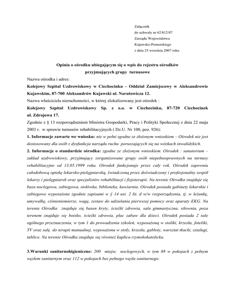 Załącznik do uchwały nr 62/812/07 Zarządu Województwa Kujawsko-Pomorskiego z dnia 25 września 2007 roku Opinia o ośrodku ubiegającym się o wpis do rejestru ośrodków przyjmujących grupy turnusowe Nazwa ośrodka i adres: Kolejowy Szpital Uzdrowiskowy w Ciechocinku – Oddział Zamiejscowy w Aleksandrowie Kujawskim, 87-700 Aleksandrów Kujawski ul. Narutowicza 12. Nazwa właściciela nieruchomości, w której zlokalizowany jest ośrodek : Kolejowy Szpital Uzdrowiskowy Sp. z o.o. w Ciechocinku, 87-720 Ciechocinek ul. Zdrojowa 17. Zgodnie z § 13 rozporządzeniem Ministra Gospodarki, Pracy i Polityki Społecznej z dnia 22 maja 2003 r. w sprawie turnusów rehabilitacyjnych ( Dz.U. Nr 100, poz. 926): 1. Informacje zawarte we wniosku: nie w pełni zgodne ze złożonym wnioskiem – Ośrodek nie jest dostosowany dla osób z dysfunkcja narządu ruchu poruszających się na wózkach inwalidzkich. 2. Informacje o standardzie ośrodka: zgodne ze złożonym wnioskiem. Ośrodek : sanatorium – zakład uzdrowiskowy, przyjmujący zorganizowane grupy osób niepełnosprawnych na turnusy rehabilitacyjne od 13.05.1999 roku. Ośrodek funkcjonuje przez cały rok. Ośrodek zapewnia całodobową opiekę lekarsko-pielęgniarską, świadczoną przez doświadczony i profesjonalny zespół lekarzy i pielęgniarek oraz specjalistów rehabilitacji i fizjoterapii. Na terenie Ośrodka znajduje się baza noclegowa, zabiegowa, stołówka, biblioteka, kawiarnia. Ośrodek posiada gabinety lekarskie i zabiegowe wyposażone zgodnie zapisami w § 14 ust. 2 lit. d w/w rozporządzenia, tj. w leżankę, umywalkę, ciśnieniomierze, wagę, zestaw do udzielania pierwszej pomocy oraz aparaty EKG. Na terenie Ośrodka znajduje się basen kryty, ścieżki zdrowia, sala gimnastyczna, siłownia, poza terenem znajduje się boisko, ścieżki zdrowia, plac zabaw dla dzieci. Ośrodek posiada 2 sale ogólnego przeznaczenia, w tym 1 do prowadzenia szkoleń, wyposażoną w stoliki, krzesła, foteliki, TV oraz salę do terapii manualnej, wyposażona w stoły, krzesła, gabloty, warsztat tkacki, sztalugi, tablice. Na terenie Ośrodka znajduje się również kaplica rzymskokatolicka. 3.Warunki sanitarnohigieniczne: 200 miejsc noclegowych, w tym 88 w pokojach z pełnym węzłem sanitarnym oraz 112 w pokojach bez pełnego węzła sanitarnego. 4. Możliwość zapewnienia osobom niepełnosprawnym dogodnych warunków pobytu, odpowiednich do rodzajów ich niepełnosprawności: Ośrodek posiada : utwardzone dojścia do budynku i ciągi piesze, powierzchnię przed drzwiami wejściowymi pozbawiana odbojów, skrobaczek, wycieraczek, stopnie schodów bez nosków i podcięć, schody zaopatrzone w balustrady, skrzydła drzwiowe oznakowane w sposób widoczny, miejsca postojowe ze stanowiskami zarezerwowanymi dla samochodów, z których korzystają osoby niepełnosprawne. W Ośrodku znajduje się winda umożliwiająca osobom niepełnosprawnym komunikację pomiędzy kondygnacjami, drzwi wejściowe do pokoi oraz do pomieszczeń higieniczno-sanitarnych (14 pokoi-27 miejsc noclegowych), rehabilitacji, rekreacji, żywienia o szerokości w świetle większej lub równej 0,9 m. W pokojach noclegowych urządzenia umożliwiające otwarcie i regulację otwarcia okna zamontowane powyżej 1,2 m od poziomu podłogi. Wg Wnioskodawcy wszystkie materiały budowlane oraz urządzenia, z których korzysta się w Ośrodku posiadają właściwe atesty. 5. Zaplecze i jego wyposażenie do prowadzenia różnych form aktywnej rehabilitacji, w tym zaplecze do prowadzenia zajęć ogólnousprawniających z programem rekreacyjnowypoczynkowym : sala do rehabilitacji ruchowej wyposażona w atlas, drabinki, materace, rotory, równoważnie, rowerki treningowe, bloczki barkowe ( 4 szt.), podwieszki-stół wyciągowy, Pętla Glissona(1 szt.), podwieszki KKD-stoły (16 szt.), kolumna oporowa, stoliki do ćwiczeń manualnych (5 szt.), ORBI-TREK (2 szt.), fotel oporowy, suszka, wycinek, przyrząd do ćwiczeń oporowych stopy; gabinety fizykoterapii wyposażone w: Diadynamic, interdyn, lampa BIOPTRON, Bio-V, jonoforeza, galwanizacja, elektrostymulacja, pulsotronic (tens, Traberta, tonoliza), ultradźwięki, krioterapia, kąpiel 4-komorowa, lampa kwarcowa, lampa sollux, urządzenie do masażu limfatycznego BOA, magnetron, laser, terapuls, diatermia; gabinety masażu: masaż wibracyjny aguavibron, masaż ręczny; balneologia: kąpiele solankowe, kąpiel ozonowa na matach, kąpiel wirowa kkd, kąpiel wirowa kkg, okłady borowinowe, kąpiele borowinowe, inhalacje, masaż podwodny, całkowity masaż wirowy, bicze całkowite, rehabilitacyjny basen termalny; trasy spacerowe do i po okolicznym lesie oraz parku własnym znajdującym się przy obiekcie. Na terenie Ośrodka znajduje się również sala do terapii manualnej, wyposażona m.in. w warsztat tkacki, sztalugi, tablice. 6. Stwierdzenie spełnienia warunków określonych w § 17 rozporządzenia: 1) Stwierdza się spełnienie wymogów wg § 17 ust. 2 - Ośrodek uznaje się za spełniający warunki dostępności dla osób, o których mowa w § 2 ust. 3 pkt 1, tj. dla osób z dysfunkcją narządu ruchu, z wyłączeniem osób poruszających się na wózkach inwalidzkich. 2) Stwierdza się nie spełnienie wymogów wg § 17 ust. 3 - Ośrodek uznaje się za nie spełniający warunki dostępności dla osób, o których mowa w § 2 ust. 3 pkt 2, tj. dla osób z dysfunkcją narządu ruchu poruszających się na wózkach inwalidzkich, ze względu na zamontowanie urządzeń umożliwiających otwarcie okien i regulację otwarcia powyżej 1,2 m od poziomu podłogi. 3) Stwierdza się spełnienie wymogów wg § 17 ust. 6 - Ośrodek uznaje się za spełniający warunki dostępności dla osób, o których mowa w § 2 ust. 3 pkt 8 i pkt 9 tj. dla osób ze schorzeniami układu krążenia oraz chorobami układu oddechowego, chorobami neurologicznymi innymi niż MPD i epilepsja, schorzeniami reumatologicznymi, kobiety po mastektomii, osoby z otyłością.