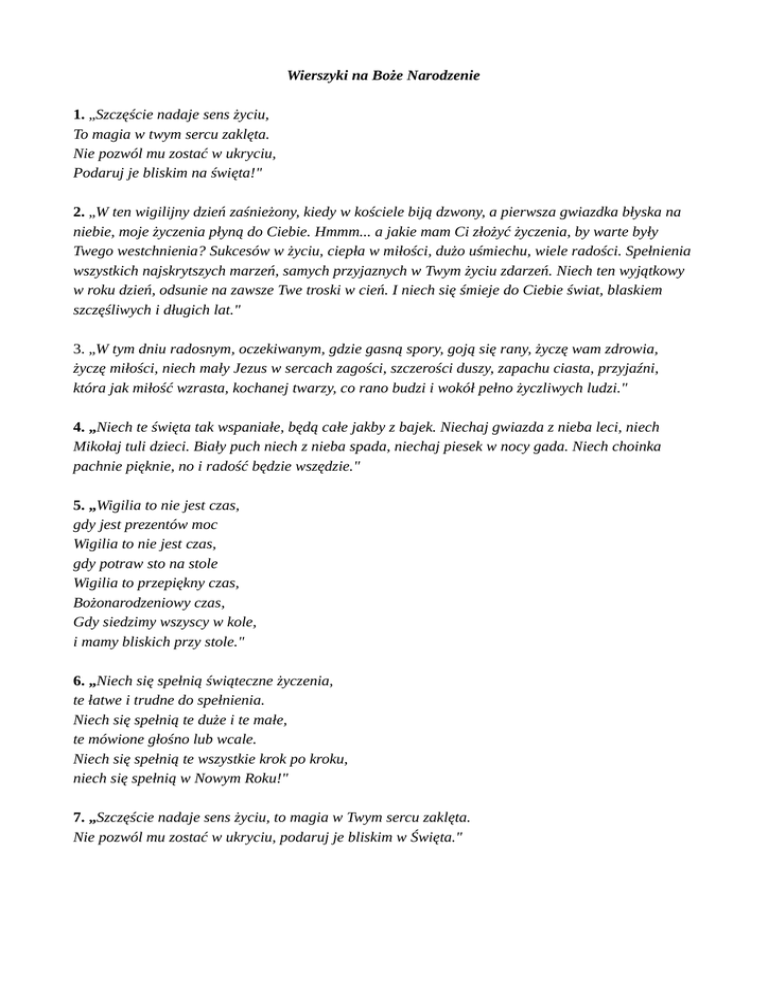 Wierszyki na Boże Narodzenie 1. „Szczęście nadaje sens życiu, To magia w twym sercu zaklęta. Nie pozwól mu zostać w ukryciu, Podaruj je bliskim na święta!" 2. „W ten wigilijny dzień zaśnieżony, kiedy w kościele biją dzwony, a pierwsza gwiazdka błyska na niebie, moje życzenia płyną do Ciebie. Hmmm... a jakie mam Ci złożyć życzenia, by warte były Twego westchnienia? Sukcesów w życiu, ciepła w miłości, dużo uśmiechu, wiele radości. Spełnienia wszystkich najskrytszych marzeń, samych przyjaznych w Twym życiu zdarzeń. Niech ten wyjątkowy w roku dzień, odsunie na zawsze Twe troski w cień. I niech się śmieje do Ciebie świat, blaskiem szczęśliwych i długich lat." 3. „W tym dniu radosnym, oczekiwanym, gdzie gasną spory, goją się rany, życzę wam zdrowia, życzę miłości, niech mały Jezus w sercach zagości, szczerości duszy, zapachu ciasta, przyjaźni, która jak miłość wzrasta, kochanej twarzy, co rano budzi i wokół pełno życzliwych ludzi." 4. „Niech te święta tak wspaniałe, będą całe jakby z bajek. Niechaj gwiazda z nieba leci, niech Mikołaj tuli dzieci. Biały puch niech z nieba spada, niechaj piesek w nocy gada. Niech choinka pachnie pięknie, no i radość będzie wszędzie." 5. „Wigilia to nie jest czas, gdy jest prezentów moc Wigilia to nie jest czas, gdy potraw sto na stole Wigilia to przepiękny czas, Bożonarodzeniowy czas, Gdy siedzimy wszyscy w kole, i mamy bliskich przy stole." 6. „Niech się spełnią świąteczne życzenia, te łatwe i trudne do spełnienia. Niech się spełnią te duże i te małe, te mówione głośno lub wcale. Niech się spełnią te wszystkie krok po kroku, niech się spełnią w Nowym Roku!" 7. „Szczęście nadaje sens życiu, to magia w Twym sercu zaklęta. Nie pozwól mu zostać w ukryciu, podaruj je bliskim w Święta." 8. „Radosnych świąt Bożego Narodzenia, rychłego spełnienia każdego marzenia. Ciepła, wiary i życzliwości, a w Nowym Roku znalezienia miłości." 9. „Boże Narodzenie wkrótce, więc życzę Ci szczerze Ciepłych chwil w rodzinie w Wigilijną Wieczerzę Wszystko w złocie, zieleni, czerwieni Niech Nowy Rok będzie pełen nadziei By spełniło się choć jedno z twoich marzeń Dużo szczęścia i niezapomnianych wrażeń!" 10. „Prószy śnieg czysty jak Twe serce, gdziekolwiek spojrzę, tam śnieżne kobierce, cichutko rozbrzmiewa wesoła kolęda niech piękne będą dla Ciebie te Święta."