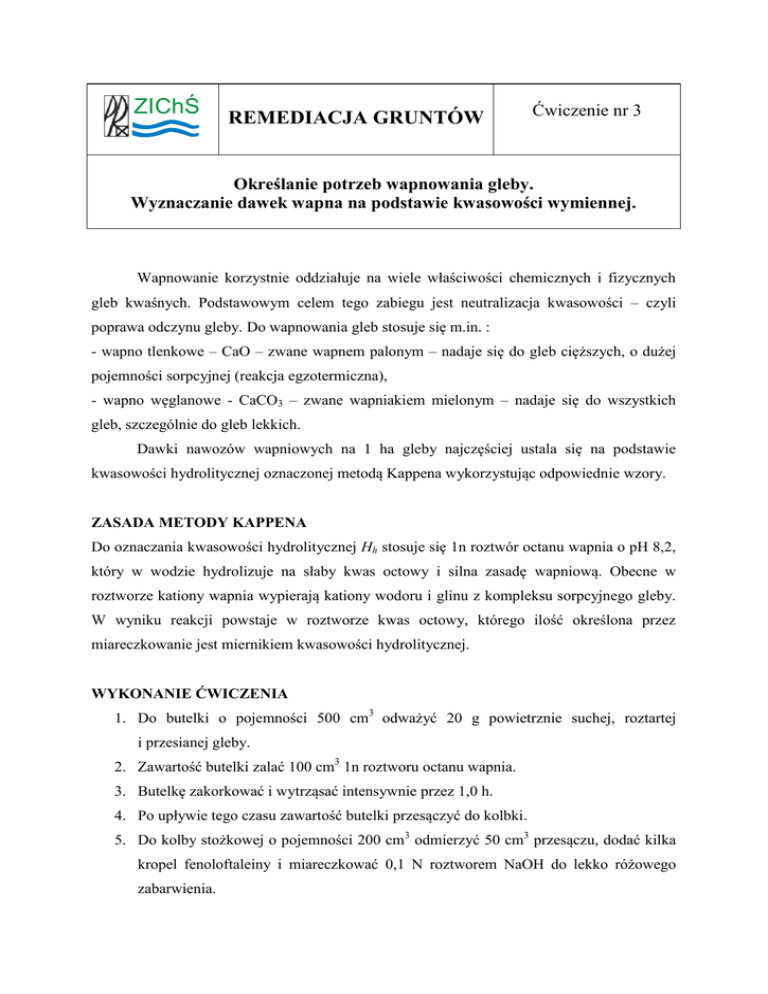 ZIChŚ REMEDIACJA GRUNTÓW Ćwiczenie nr 3 Określanie potrzeb wapnowania gleby. Wyznaczanie dawek wapna na podstawie kwasowości wymiennej. Wapnowanie korzystnie oddziałuje na wiele właściwości chemicznych i fizycznych gleb kwaśnych. Podstawowym celem tego zabiegu jest neutralizacja kwasowości – czyli poprawa odczynu gleby. Do wapnowania gleb stosuje się m.in. : - wapno tlenkowe – CaO – zwane wapnem palonym – nadaje się do gleb cięższych, o dużej pojemności sorpcyjnej (reakcja egzotermiczna), - wapno węglanowe - CaCO3 – zwane wapniakiem mielonym – nadaje się do wszystkich gleb, szczególnie do gleb lekkich. Dawki nawozów wapniowych na 1 ha gleby najczęściej ustala się na podstawie kwasowości hydrolitycznej oznaczonej metodą Kappena wykorzystując odpowiednie wzory. ZASADA METODY KAPPENA Do oznaczania kwasowości hydrolitycznej Hh stosuje się 1n roztwór octanu wapnia o pH 8,2, który w wodzie hydrolizuje na słaby kwas octowy i silna zasadę wapniową. Obecne w roztworze kationy wapnia wypierają kationy wodoru i glinu z kompleksu sorpcyjnego gleby. W wyniku reakcji powstaje w roztworze kwas octowy, którego ilość określona przez miareczkowanie jest miernikiem kwasowości hydrolitycznej. WYKONANIE ĆWICZENIA 1. Do butelki o pojemności 500 cm3 odważyć 20 g powietrznie suchej, roztartej i przesianej gleby. 2. Zawartość butelki zalać 100 cm3 1n roztworu octanu wapnia. 3. Butelkę zakorkować i wytrząsać intensywnie przez 1,0 h. 4. Po upływie tego czasu zawartość butelki przesączyć do kolbki. 5. Do kolby stożkowej o pojemności 200 cm3 odmierzyć 50 cm3 przesączu, dodać kilka kropel fenoloftaleiny i miareczkować 0,1 N roztworem NaOH do lekko różowego zabarwienia. OBLICZANIE WYNIKÓW Kwasowość hydrolityczną wylicza się z wzoru: H h V 5 1,5 0,1 gdzie: Hh – kwasowość hydrolityczna, (cmol(+)/kg gleby), V – objętość 0,1n NaOH zużytego na miareczkowanie próbki, cm3, 5 – współczynnik przeliczeniowy na 100 g gleby, 1,5 – poprawka na niepełne wyparcie jonów wodorowych przy jednorazowym traktowaniu gleby octanem wapnia (współczynnik empiryczny), 0,1 – normalność (molowość) roztworu NaOH zużyta do miareczkowania. OBLICZANIE DAWEK WAPNA: Gdzie: Hh – kwasowość hydrolityczna, (cmol(+)/kg gleby), 0,28 – liczba gramów CaO odpowiadająca 1 cmol(+), 0,50 - liczba gramów CaCO3 odpowiadająca 1 cmol(+), 3000 – masa (t) 20-cm warstwy gleby na powierzchni 1 ha , 1000 – przelicznik gramów na kilogramy. Uwaga: Obliczone dawki (t/ha) odnoszą się do czystych (100%) związków CaO lub CaCO3. Obliczyć dawki nawozów wapniowych zawierających: a/ 75% CaO b/ 67% CaCO3