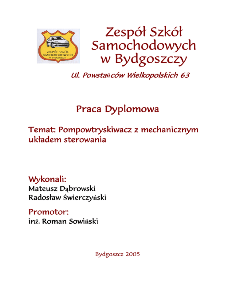 Zespół Szkół Samochodowych w Bydgoszczy Ul. Powstańców Wielkopolskich 63 Praca Dyplomowa Temat: Pompowtryskiwacz z mechanicznym układem sterowania Wykonali: Mateusz Dąbrowski D browski Radosław Świerczy wierczyński wierczy ski Promotor: inŜ. in Roman Sowiński Sowi ski Bydgoszcz 2005 Pompowtryskiwacz z mechanicznym sterowaniem Pompowtryskiwacz jest, juŜ jak sama nazwa mówi jest elementem, w którym są zintegrowane funkcje pompy wtryskowej i sterowanego elektrozaworem wtryskiwacza. W kaŜdym cylindrze silnika znajduje się jeden pompowtryskiwacz. W przewodach doprowadzenia paliwa nie ma wysokiego ciśnienia. Ciśnienie to jest wytwarzane dopiero w pompowtryskiwaczach. Objętość paliwa jest mała, dzięki czemu bardzo szybko uzyskuje się niezbędne ciśnienie. Wytwarzane ciśnienia, początek wtrysku i ilość wtryskiwanego paliwa są precyzyjnie sterowane za pomocą elektrozaworów przez sterownik silnika. Dzięki temu uzyskuje się optymalny skład mieszanki a tym samym dobre spalanie. Z tego wynika duŜa moc jednostkowa i niewielka zawartość szkodliwych składników spalin przy jednocześnie małym zuŜyciu paliwa. Pompowtryskiwacze są pionowo umieszczane w głowicy silnika, centralnie nad komorą spalania (wgłębieniem) w tłoku. KaŜdy pompowtryskiwacz jest umocowany dwiema śrubami. W tym sposobie mocowania nie występują siły poprzeczne, dzięki czemu zmniejszone jest przenoszenie hałasu z pompowtryskiwacza na głowicę silnika. Cechy oraz cele stosowania pompowtryskiwaczy: • Smukła i zwarta budowa, • Mocowanie w głowicy silnika dwiema śrubami, • Zwiększone ciśnienie wtrysku w zakresie obciąŜenia częściowego, • Tłok pośredni, działający jako hamulec dla zmniejszenia hałasu wtrysku, • Nowy kształt stoŜkowego osadzenia pompowtryskiwacza w gnieździe w głowicy, • Wyeliminowanie pompy wtryskowej co spowodowało więcej miejsca w komorze silnika, • MoŜliwość precyzyjnego sterowania początkiem, końcem jak i dawką wtrysku. • Wyeliminowanie przewodów wtryskowych co spowodowało wzrost ciśnienia. Parametry techniczne pompowtryskiwaczy: Wielkość wtrysku wstępnego…………..…..…1-2 mm3 Wielkość dawki……………………..……….0-65 mm3 Kąt obrotu wału korbowego pomiędzy wtryskiem wstępnym a zasadniczym……………...6-10 o Ciśnienie otwarcia dla wtrysku wstępnego........180 bar Ciśnienie otwarcia dla wtrysku zasadniczego…305 bar Maksymalne ciśnienie wtrysku……...……….2050 bar Budowa pompowtryskiwacza Zasada działania pompowtryskiwacza Ruch przenoszony jest z wałka rozrządu na pompowtryskiwacze przy pomocy trzech rolek dźwigni wtryskiwaczy. Rolka toczy się po krzywce na wałku rozrządu, który zamocowany jest w pokrywach łoŜysk. Dźwignia wtryskiwacza posiada śrubę słuŜącą do regulacji luzu wtryskiwacza (regulacja punktu kontaktowego). Regulacja ta jest wymagana w przypadku wymiany pompowtryskiwacza lub dowolnego elementu biorącego udział w pracy. Krzywka wałka rozrządu posiada ostre załamanie. Dzięki temu tłok pompowtryskiwacza moŜe przesuwać się z duŜą prędkością, wytwarzając gwałtownie ciśnienie we wtryskiwaczu. Pozostała część powierzchni krzywki posiada łagodny kształt załamujący się stopniowo do miejsca załamania. Wolny i łagodny ruch rolki po krzywce powoduje, Ŝe paliwo przedostaje się do komory wysokiego ciśnienia pompowtryskiwacza nie wytwarzając pęcherzyków. Pompowtryskiwacz jest zasilany poprzez wypełnienie paliwem komory wysokiego ciśnienia wtedy, gdy tłok przesuwa się do góry pod wpływem działania siły spręŜyny, a objętość komory wysokiego ciśnienia wzrasta. Elektrozawór nie jest zasilany, a iglica pozostaje w pozycji spoczynkowej pozwalając na przepływ paliwa przez otworki wlotowe do komory wysokiego ciśnienia. Ciśnienie wytwarzane przez pompę paliwa zapewnia, Ŝe paliwo szybko przepływa do komory wysokiego ciśnienia. Fazy wtrysków w pompowtryskiwaczu KaŜdy pompowtryskiwacz posiada dwie fazy wtrysku fazę wstępną oraz fazę zasadniczą. Wtrysk wstępny Wtrysk wstępny ma miejsce wtedy, gdy krzywaka wałka wtryskiwacza spowoduje przesunięcie się tłoka na dół pod wpływem nacisku dźwigni wtryskiwacza. Paliwo zebrane w komorze wysokiego ciśnienia zostaje wypchnięte przez iglicę elektrozaworu w kierunku otworków wlotowych. Jednostka sterująca określi początek wtrysku i w tym samym czasie zasili elektrozawór pompowtryskiwacza. Iglica elektrozaworu zostaje wypchnięta z gniazda, zamykając kanał przelotowy pomiędzy komorą wysokiego ciśnienia a otworkami wlotowymi. Od tego momentu ciśnienie w komorze zaczyna rosnąć i zostaje przenoszone na iglicę wtryskiwacza. Po osiągnięciu ciśnienia 180 bar, nacisk spręŜyny iglicy wtryskiwacza zostaje pokonany i iglica uniesie się ze swojego gniazda. W tym momencie rozpoczyna się wtrysk wstępny. Zakończenie wtrysku wstępnego Otwarcie się iglicy wtryskiwacza w czasie wtrysku wstępnego ograniczone jest do jednej trzeciej zakresu jej ruchu, co zapewnia uzyskanie odpowiedniej dawki paliwa. Takie ograniczenie ruchu wymuszone jest w komorze dławika hydraulicznego. Gdy szyjka dławika dojdzie do przewęŜenia w obudowie wtryskiwacza, paliwo nie będzie mogło szybko wydostać się z komory. W tym miejscu ciśnienie w komorze wysokiego ciśnienia zacznie gwałtownie wzrastać, pokonując siłę spręŜyny wtryskiwacza, a to spowoduje przemieszczenie się zaworu przelewowego z gniazda. Otwarcie zaworu przelewowego doprowadzi do nagłego spadku ciśnienia w komorze wysokiego ciśnienia. Siła spręŜyny iglicy wtryskiwacza będzie teraz na tyle duŜa, aby zamknąć iglicę wtryskiwacza i zakończyć wtrysk wstępny. Wtrysk zasadniczy Elektrozawór pozostaje zamknięty, a tłok pompy przesuwa się w dół. Wtrysk zasadniczy rozpoczyna się zaraz po zamknięciu iglicy wtryskiwacza – od momentu, kiedy ciśnienie zaczyna wzrastać. Po osiągnięciu ci