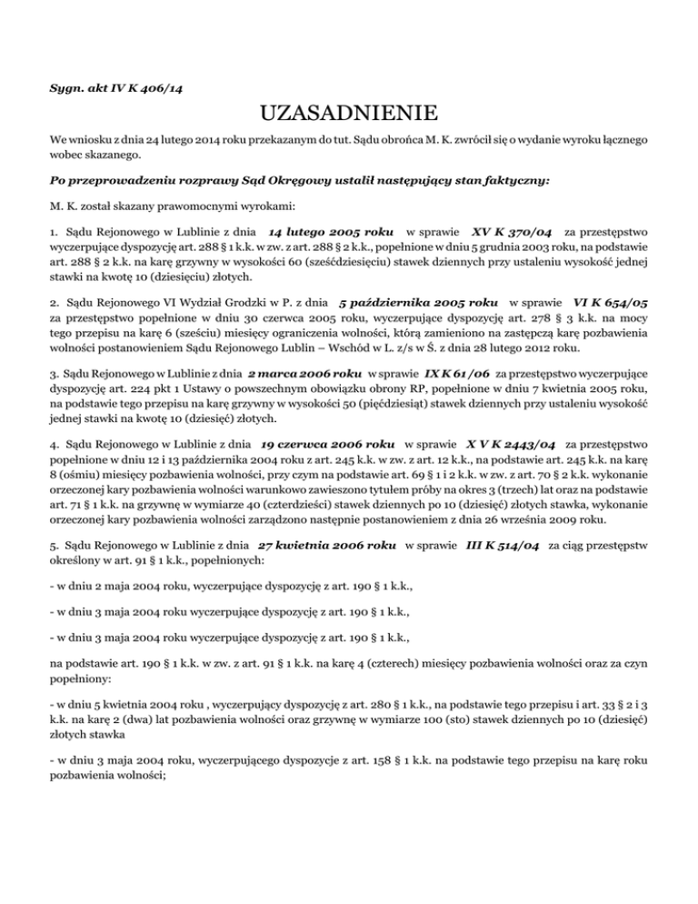 Sygn. akt IV K 406/14 UZASADNIENIE We wniosku z dnia 24 lutego 2014 roku przekazanym do tut. Sądu obrońca M. K. zwrócił się o wydanie wyroku łącznego wobec skazanego. Po przeprowadzeniu rozprawy Sąd Okręgowy ustalił następujący stan faktyczny: M. K. został skazany prawomocnymi wyrokami: 1. Sądu Rejonowego w Lublinie z dnia 14 lutego 2005 roku w sprawie XV K 370/04 za przestępstwo wyczerpujące dyspozycję art. 288 § 1 k.k. w zw. z art. 288 § 2 k.k., popełnione w dniu 5 grudnia 2003 roku, na podstawie art. 288 § 2 k.k. na karę grzywny w wysokości 60 (sześćdziesięciu) stawek dziennych przy ustaleniu wysokość jednej stawki na kwotę 10 (dziesięciu) złotych. 2. Sądu Rejonowego VI Wydział Grodzki w P. z dnia 5 października 2005 roku w sprawie VI K 654/05 za przestępstwo popełnione w dniu 30 czerwca 2005 roku, wyczerpujące dyspozycję art. 278 § 3 k.k. na mocy tego przepisu na karę 6 (sześciu) miesięcy ograniczenia wolności, którą zamieniono na zastępczą karę pozbawienia wolności postanowieniem Sądu Rejonowego Lublin – Wschód w L. z/s w Ś. z dnia 28 lutego 2012 roku. 3. Sądu Rejonowego w Lublinie z dnia 2 marca 2006 roku w sprawie IX K 61 /06 za przestępstwo wyczerpujące dyspozycję art. 224 pkt 1 Ustawy o powszechnym obowiązku obrony RP, popełnione w dniu 7 kwietnia 2005 roku, na podstawie tego przepisu na karę grzywny w wysokości 50 (pięćdziesiąt) stawek dziennych przy ustaleniu wysokość jednej stawki na kwotę 10 (dziesięć) złotych. 4. Sądu Rejonowego w Lublinie z dnia 19 czerwca 2006 roku w sprawie X V K 2443/04 za przestępstwo popełnione w dniu 12 i 13 października 2004 roku z art. 245 k.k. w zw. z art. 12 k.k., na podstawie art. 245 k.k. na karę 8 (ośmiu) miesięcy pozbawienia wolności, przy czym na podstawie art. 69 § 1 i 2 k.k. w zw. z art. 70 § 2 k.k. wykonanie orzeczonej kary pozbawienia wolności warunkowo zawieszono tytułem próby na okres 3 (trzech) lat oraz na podstawie art. 71 § 1 k.k. na grzywnę w wymiarze 40 (czterdzieści) stawek dziennych po 10 (dziesięć) złotych stawka, wykonanie orzeczonej kary pozbawienia wolności zarządzono następnie postanowieniem z dnia 26 września 2009 roku. 5. Sądu Rejonowego w Lublinie z dnia 27 kwietnia 2006 roku w sprawie III K 514/04 za ciąg przestępstw określony w art. 91 § 1 k.k., popełnionych: - w dniu 2 maja 2004 roku, wyczerpujące dyspozycję z art. 190 § 1 k.k., - w dniu 3 maja 2004 roku wyczerpujące dyspozycję z art. 190 § 1 k.k., - w dniu 3 maja 2004 roku wyczerpujące dyspozycję z art. 190 § 1 k.k., na podstawie art. 190 § 1 k.k. w zw. z art. 91 § 1 k.k. na karę 4 (czterech) miesięcy pozbawienia wolności oraz za czyn popełniony: - w dniu 5 kwietnia 2004 roku , wyczerpujący dyspozycję z art. 280 § 1 k.k., na podstawie tego przepisu i art. 33 § 2 i 3 k.k. na karę 2 (dwa) lat pozbawienia wolności oraz grzywnę w wymiarze 100 (sto) stawek dziennych po 10 (dziesięć) złotych stawka - w dniu 3 maja 2004 roku, wyczerpującego dyspozycje z art. 158 § 1 k.k. na podstawie tego przepisu na karę roku pozbawienia wolności; Na podstawie art. 91 § 2 k.k. orzeczone jednostkowe kary pozbawienia wolności oraz karę pozbawienia wolności za ciąg przestępstw połączono i wymierzono karę 2 (dwóch) lat i 6 (sześciu) miesięcy pozbawienia wolności. Na podstawie art. 63 § 1 k.k. zaliczono na poczet orzeczonej kary pozbawienia wolności okres zatrzymania w dniu 3 maja 2004 roku oraz okres tymczasowego aresztowania w dniach od 21 czerwca 2004 roku do 22 września 2004 roku oraz od 27 lipca 2005 roku do 27 kwietnia 2006 roku. 6. Sądu Rejonowego w Lublinie z dnia 19 grudnia 2007 roku w sprawie XV K 166/07 zmieniony wyrokiem Sądu Okręgowego w Lublinie z dnia 15 kwietnia 2008 roku w sprawie V Ka 272/08 za przestępstwo wyczerpujące dyspozycję art. 190 § 1 k.k. popełnione w dniu 7 grudnia 2006 roku, na podstawie tego przepisu na karę 8 (osiem) miesięcy pozbawienia wolności, przy czym na podstawie art. 69 § 1 i 2 k.k. w zw. z art. 70 § 2 k.k. wykonanie orzeczonej kary pozbawienia wolności warunkowo zawieszono tytułem próby na okres 5 (pięć) lat oraz na podstawie art. 71 § 1 k.k. na grzywnę w wymiarze 140 ( sto czterdzieści) stawek dziennych po 10 (dziesięć) złotych stawka. Na podstawie art. 63 § 1 k.k. zaliczono na poczet orzeczonej kary grzywny okres rzeczywistego pozbawienia wolności od dnia 7 grudnia 2006 roku do dnia 14 lutego 2007 roku; 7. Sądu Rejonowego Lublin - Zachód w Lublinie z dnia 12 maja 2011 roku w sprawie IV K 10 28/11 za przestępstwo popełnione w dniu 9 stycznia 2011 roku, wyczerpujące dyspozycję art. 62 ust. 3 ustawy o przeciwdziałaniu narkomanii, na podstawie tego przepisu na karę grzywny w wymiarze 60 (sześćdziesiąt) stawek dziennych przy ustaleniu wysokości jednej stawki na kwotę 10 (dziesięciu) złotych. Na podstawie art. 63 § 1 k.k. zaliczono na poczet orzeczonej kary grzywny okres zatrzymania w dniu 9 stycznia 2011. 8. Sądu Rejonowego Lublin - Zachód w Lublinie z dnia 6 kwietnia 2011 roku w sprawie III K 677/11 za ciąg przestępstw określony w art. 91 § 1 k.k., popełnionych: - w dniu 2 lutego 2007 roku, wyczerpujące dyspozycję z art. 190 § 1 k.k. w zw. z art. 64 § 1 k.k., - w dniu 2 lutego 2007 roku wyczerpujące dyspozycję z 190 § 1 k.k. w zw. z art. 64 § 1 k.k., - w dniu 2 lutego 2007 roku wyczerpujące dyspozycję z art. 190 § 1 k.k. w zw. z art. 64 § 1 k.k., na podstawie art. 190 § 1 k.k. w zw. z art. 91 § 1 k.k. na karę roku i 4 (czterech) miesięcy pozbawienia wolności, a podstawie art. 71 § 1 k.k. na grzywnę w wymiarze 150 ( sto pięćdziesiąt) stawek dziennych po 10 (dziesięć) złotych stawka, wykonanie orzeczonej kary pozbawienia wolności zarządzono następnie postanowieniem z dnia 18 grudnia 2013 roku. Na podstawie art. 63 § 1 k.k. zaliczono na poczet orzeczonej kary grzywny okres zatrzymania i tymczasowego aresztowania od dnia 25 lutego 2009 roku 
